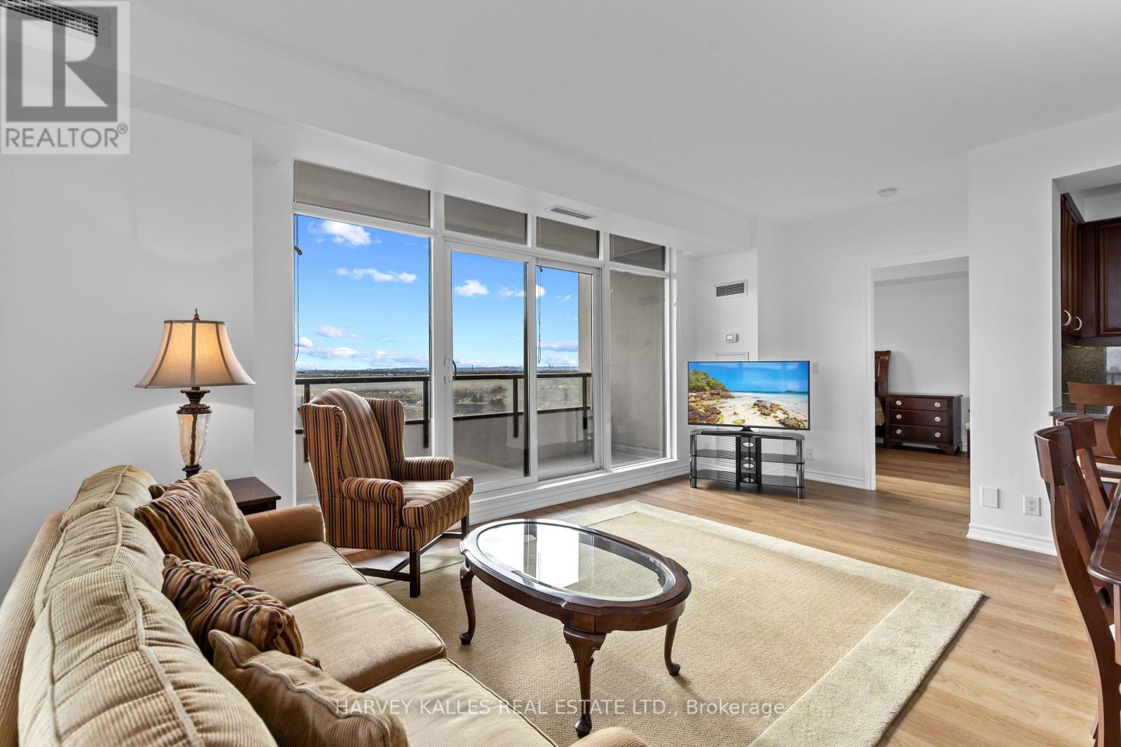 Welcome to Suite 1206 at the prestigious Bellaria Residences! This pristine, professionally cleaned and freshly painted 1,063 sq' corner suite with walls of windows and smooth ceilings is a true showstopper! Featuring 2 spacious bedrooms with closet organizers and 2 full bathrooms, this bright and inviting home offers an open concept living and dining area flooded with natural light with floor to ceiling windows and sliding door with lovely custom window shades. An immaculate kitchen with breakfast bar, bar stools, stainless steel fridge, stove, dishwasher and new microwave oven complete with a walk-in pantry with built-ins for exceptional storage. Enjoy the convenience of a separate laundry room with sink, stainless steel washer / dryer and central vacuum. Enjoy your morning coffee or evening glass of wine on the impressive wrap-around private balcony with breathtaking skyline and tree top clear views across the city. This impressive offering includes 1 parking space and a double (2) locker. Bellaria's resort-style amenities include 24-hour gated security, concierge service, fitness centre, massive dining and party room, theatre room, meeting room and beautifully landscaped grounds with picnic and BBQ area. Ideally located close to Vaughan Mills, fine dining, parks, and transit. Secure gated community with security and concierge. Available immediately - simply move in and enjoy! This suite is a gem... a true turnkey opportunity - all furnishings and 4 chandeliers as pictured included. (id:4555)