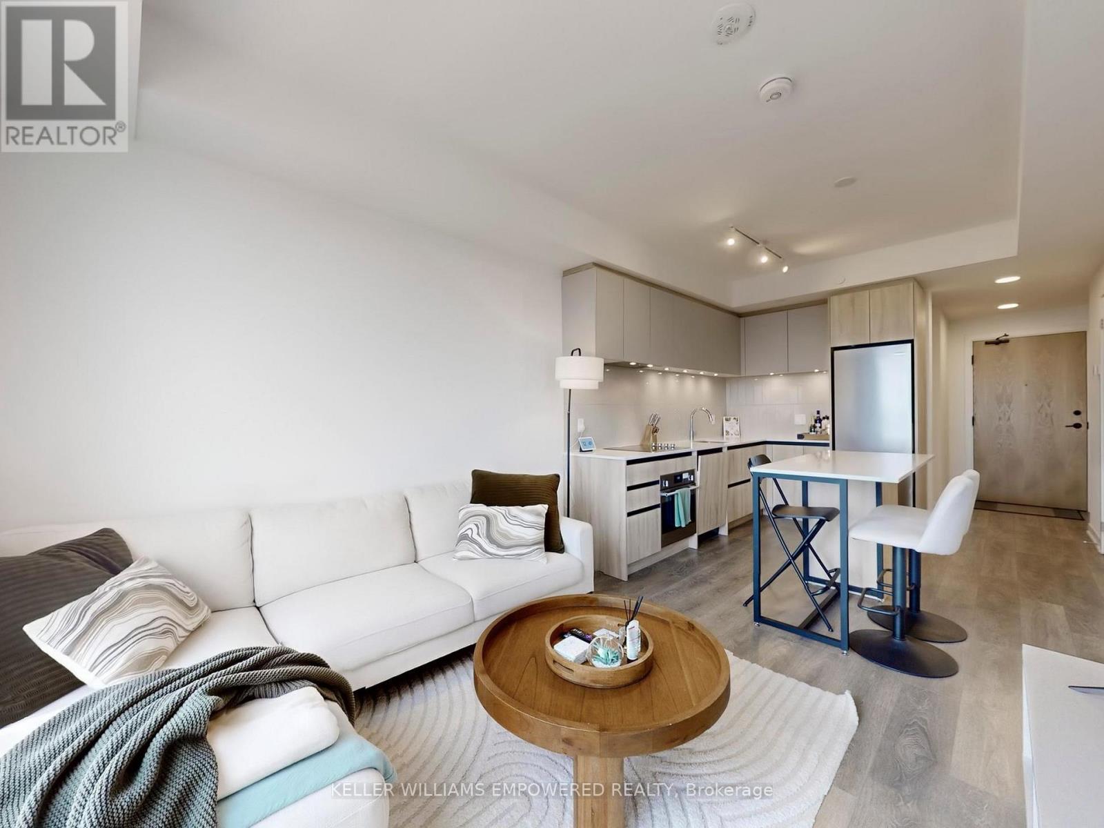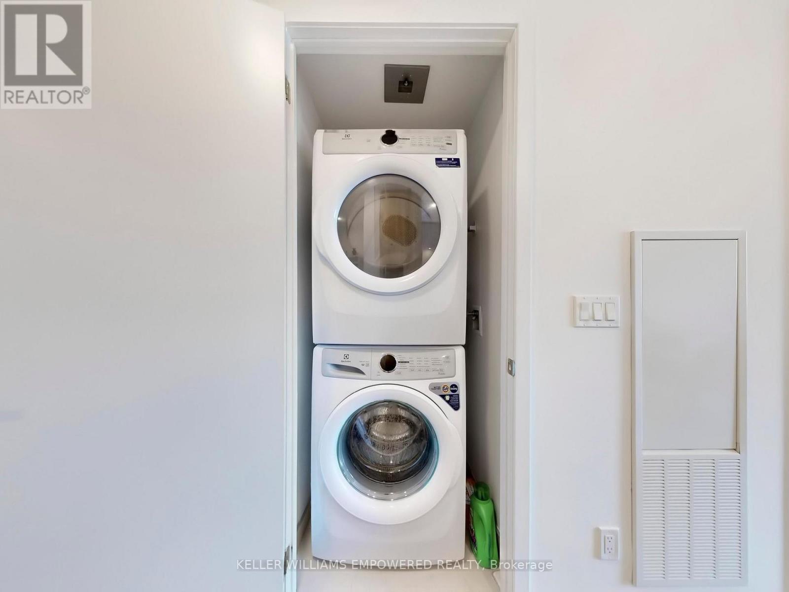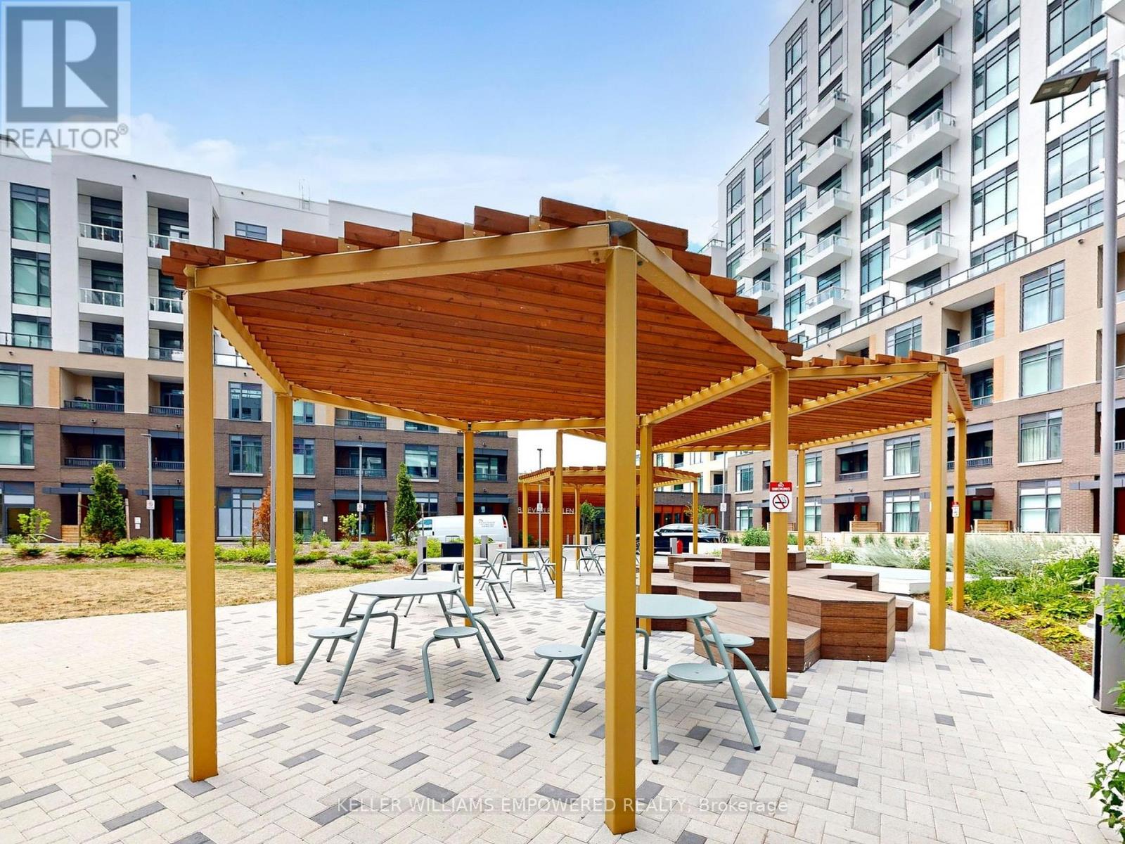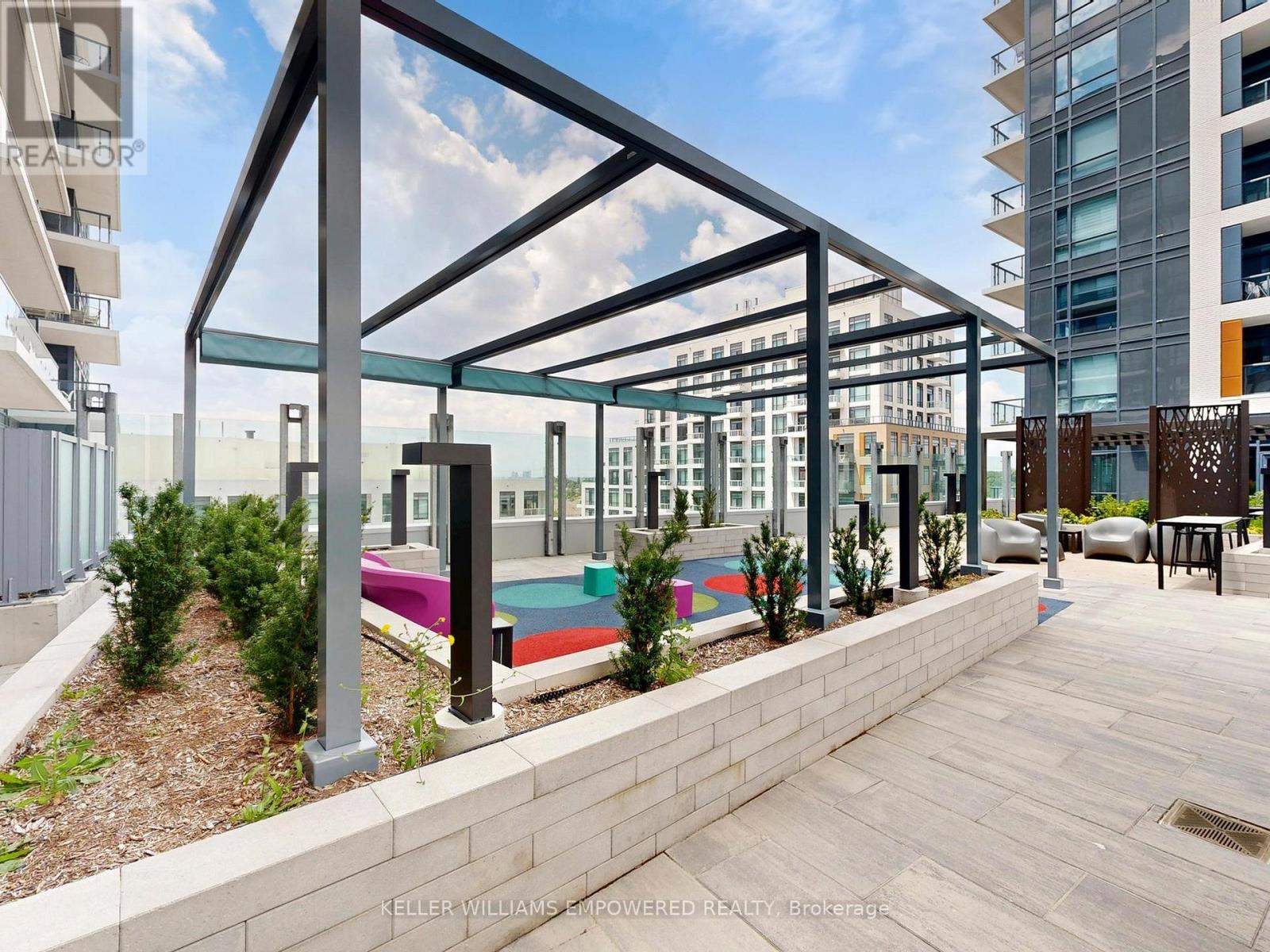 Surrounded by the quaint comforts of South Thornhill, this property combines stylish design, functional living, and access to an outstanding community. Residents will enjoy everyday conveniences with shops, cafés, restaurants, schools, lush parks, local transit, commuter highway networks such as Highway 407 and Highway 7, and The Promenade Mall all just moments away. Inside, the suite offers a bright and functional 1-bedroom plus den layout. The open-concept kitchen is finished with quartz countertops, premium appliances, ceramic tile backsplash, soft-close cabinetry, and a central island with dining space. The kitchen flows into the living area, where floor-to-ceiling east-facing windows bring in natural light and provide a walk-out to the private balcony. The primary bedroom features a large window wall and a walk-in closet with built-in organizers and lighting. The 4-piece bathroom is beautifully appointed with porcelain tile flooring, an integrated vanity sink with storage, frameless mirror with sconce lighting, and a deep soaker tub with full tile surround. A semi-open den offers flexibility as a home office or reading nook, while in-suite laundry with stacked washer and dryer ensures day-to-day convenience. Residents of this community have access to an exceptional collection of amenities including a fitness centre with yoga studio, multi-sport gymnasium with basketball court, co-working and meeting rooms, family and party spaces, and a seventh-floor terrace with BBQs, lounge areas, and a play zone for children. Outdoor living is enhanced by a landscaped community courtyard, fully fenced dog run, pet wash station, and 24/7 concierge. This property also includes one owned parking space and one locker for added convenience. (id:4555)
