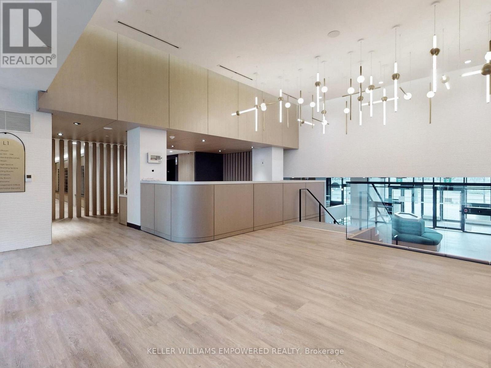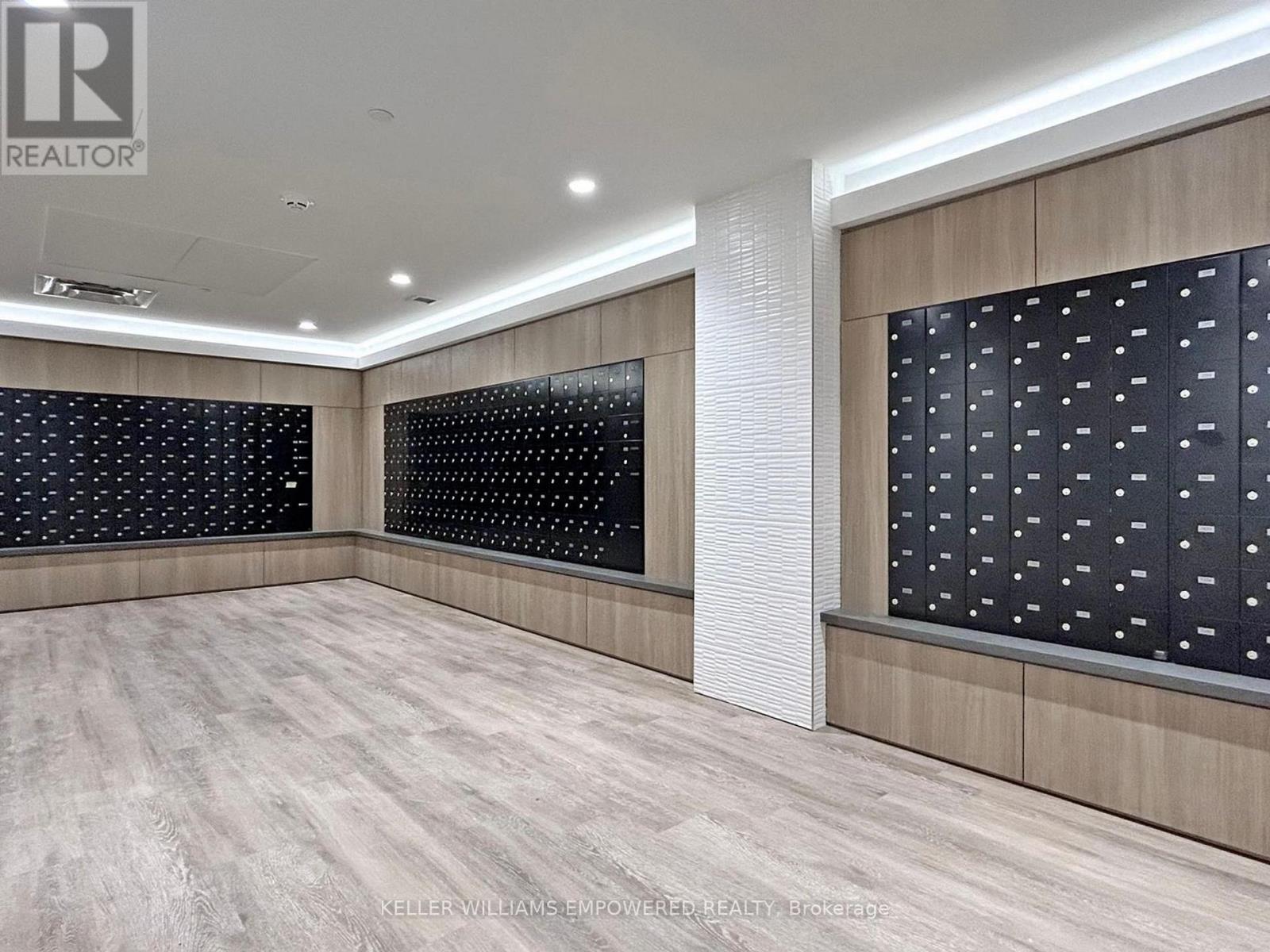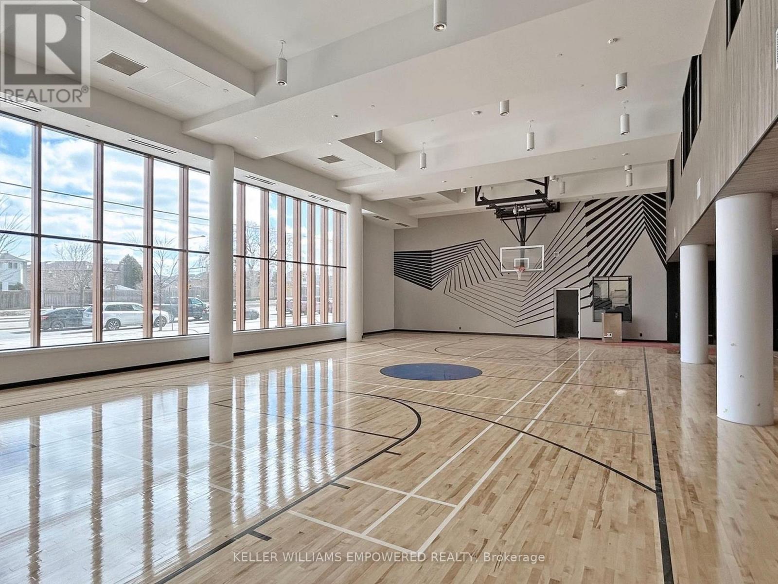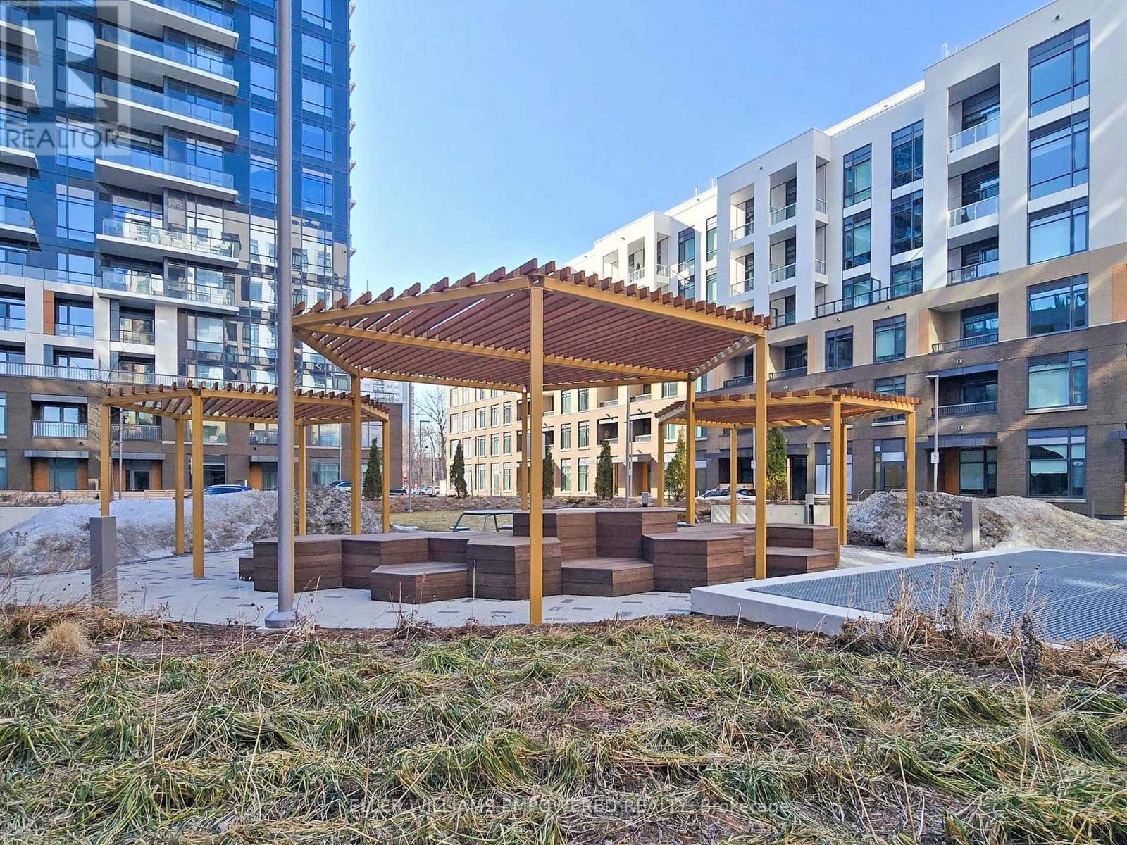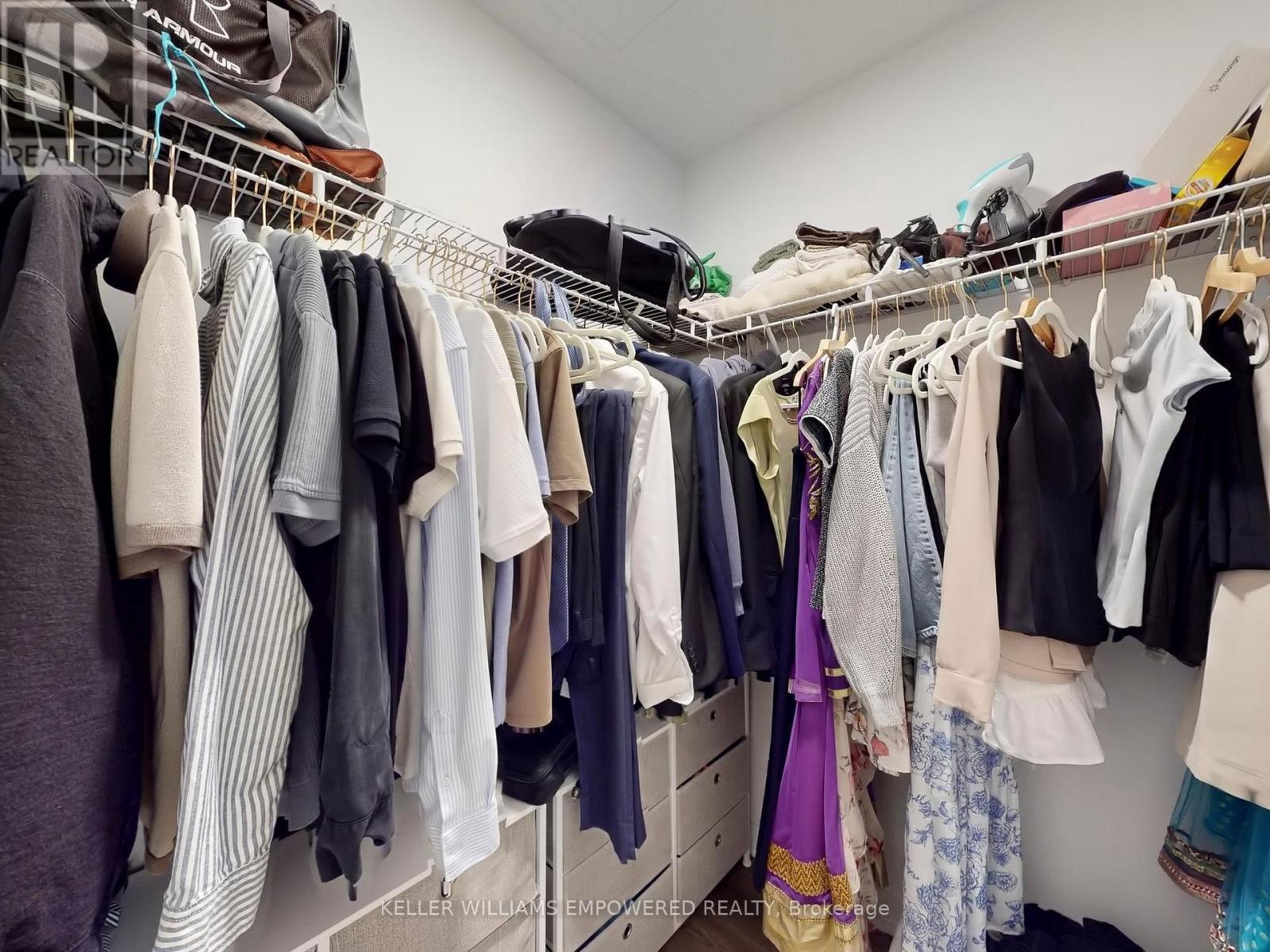 Surrounded by the quaint comforts of South Thornhill, this property combines stylish design, functional living, and access to an outstanding community. Residents will enjoy everyday conveniences with shops, cafés, restaurants, schools, lush parks, local transit, commuter highway networks such as Highway 407 and Highway 7, and The Promenade Mall all just moments away. Inside, the suite offers a bright and functional 1-bedroom plus den layout. The open-concept kitchen is finished with quartz countertops, premium appliances, ceramic tile backsplash, soft-close cabinetry, and a central island with dining space. The kitchen flows into the living area, where floor-to-ceiling east-facing windows bring in natural light and provide a walk-out to the private balcony. The primary bedroom features a large window wall and a walk-in closet with built-in organizers and lighting. The 4-piece bathroom is beautifully appointed with porcelain tile flooring, an integrated vanity sink with storage, frameless mirror with sconce lighting, and a deep soaker tub with full tile surround. A semi-open den offers flexibility as a home office or reading nook, while in-suite laundry with stacked washer and dryer ensures day-to-day convenience. Residents of this community have access to an exceptional collection of amenities including a fitness centre with yoga studio, multi-sport gymnasium with basketball court, co-working and meeting rooms, family and party spaces, and a seventh-floor terrace with BBQs, lounge areas, and a play zone for children. Outdoor living is enhanced by a landscaped community courtyard, fully fenced dog run, pet wash station, and 24/7 concierge. This property also includes one owned parking space and one locker for added convenience. (id:4555)