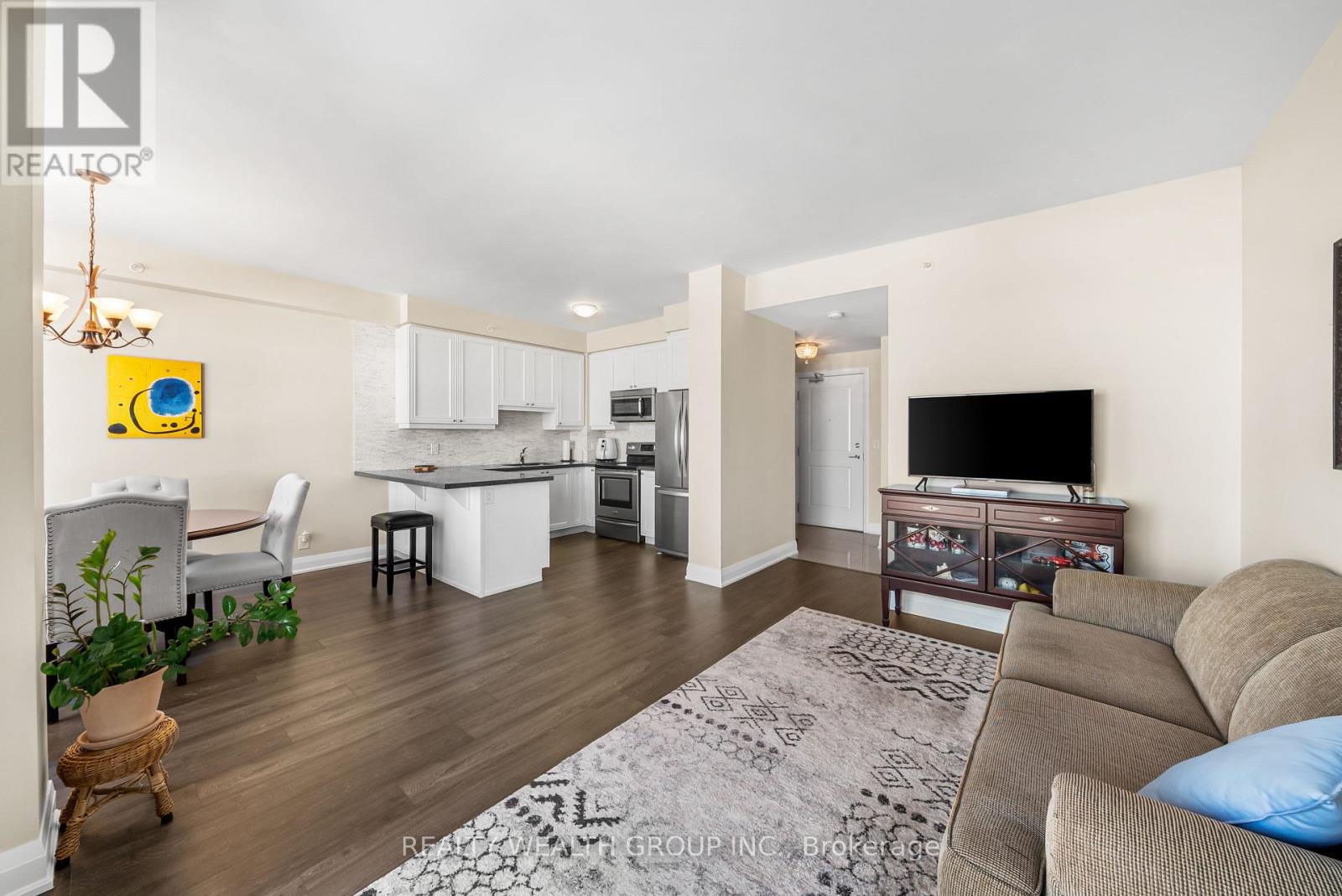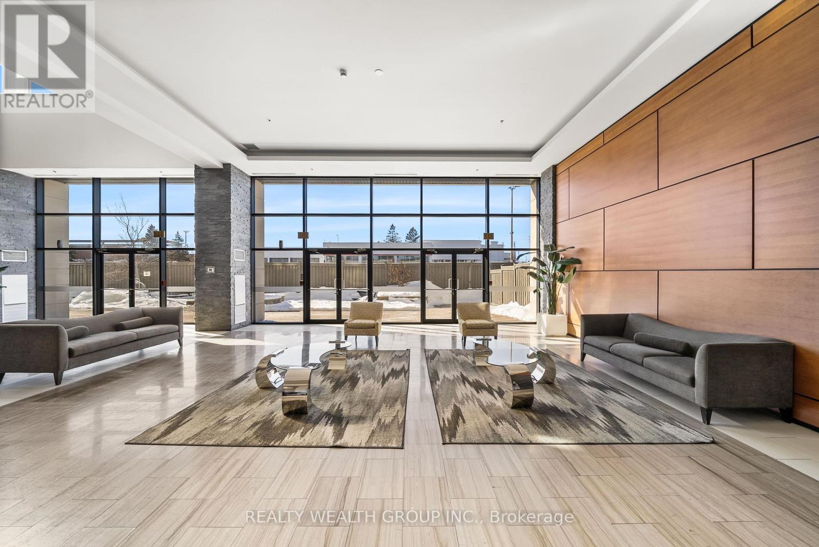 Welcome to this spacious and well-maintained 1-bedroom plus den, 2-bathroom condo in a desirable low-rise building offering a quiet, community-oriented setting with the convenience of condo living. The open-concept layout features 9-foot ceilings and excellent natural light, creating a bright and inviting living space. Over 800 square ft with an upgraded kitchen which includes stainless steel appliances and enhanced cabinetry, flowing seamlessly into the living and dining areas. Enjoy a generous north-facing balcony with clear, unobstructed views, ideal for relaxing or entertaining. The functional den provides flexible space for a home office or guest area, while the spacious primary bedroom offers comfort and practicality. Additional features include ensuite laundry, polished marble flooring at the entrance, one owned underground parking space, and a locker.Residents enjoy access to outstanding amenities, including two fitness centres, sauna, theatre room, billiards room, party room, piano lounge, rear courtyard, BBQ terrace, rooftop pavilion with BBQ stations, and 24-hour security. This family- and pet-friendly building is conveniently located near parks, schools, shopping, dining, and major highways. (id:4555)