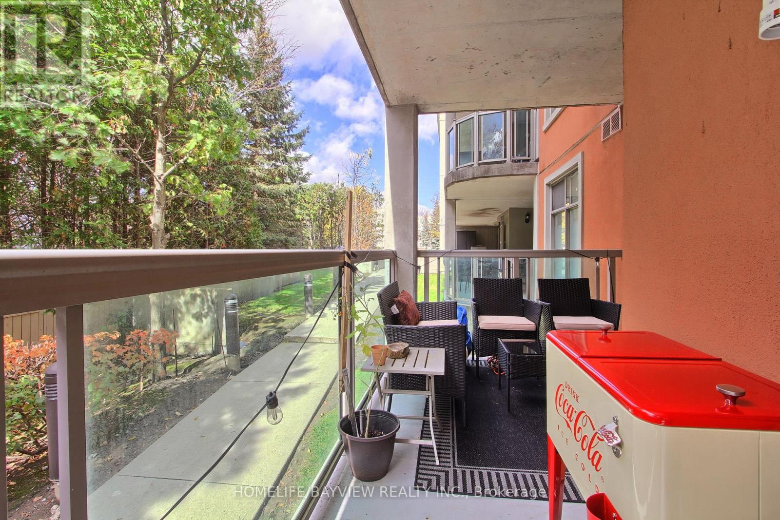 Rarely Available Low Rise Boutique Condo In The Heart Of Woodbridge. Meticulously Maintained. 1 Bedroom + Den; Open-Concept Layout; Kitchen Redone in 2024 with Brand New S/S Appliances (2024) & Granite Countertops w/Breakfast Bar; New Bathroom With Glass Shower Enclosure (2021), Walkout To Huge Terrace (155 Sq. Ft); Upgraded 7" Baseboards & Crown Molding Throughout; New AC/Heat/Gas Unit (2025), Natural Gas Line for BBQ, Huge Locker And 1 Parking Spot. Majestic Ravine Setting On The Humber River. Minutes To Market Lane & Highways; Steps To Transit & Schools. Amenities Include Gym And Party Room. **Low Maint Fees** (id:4555)