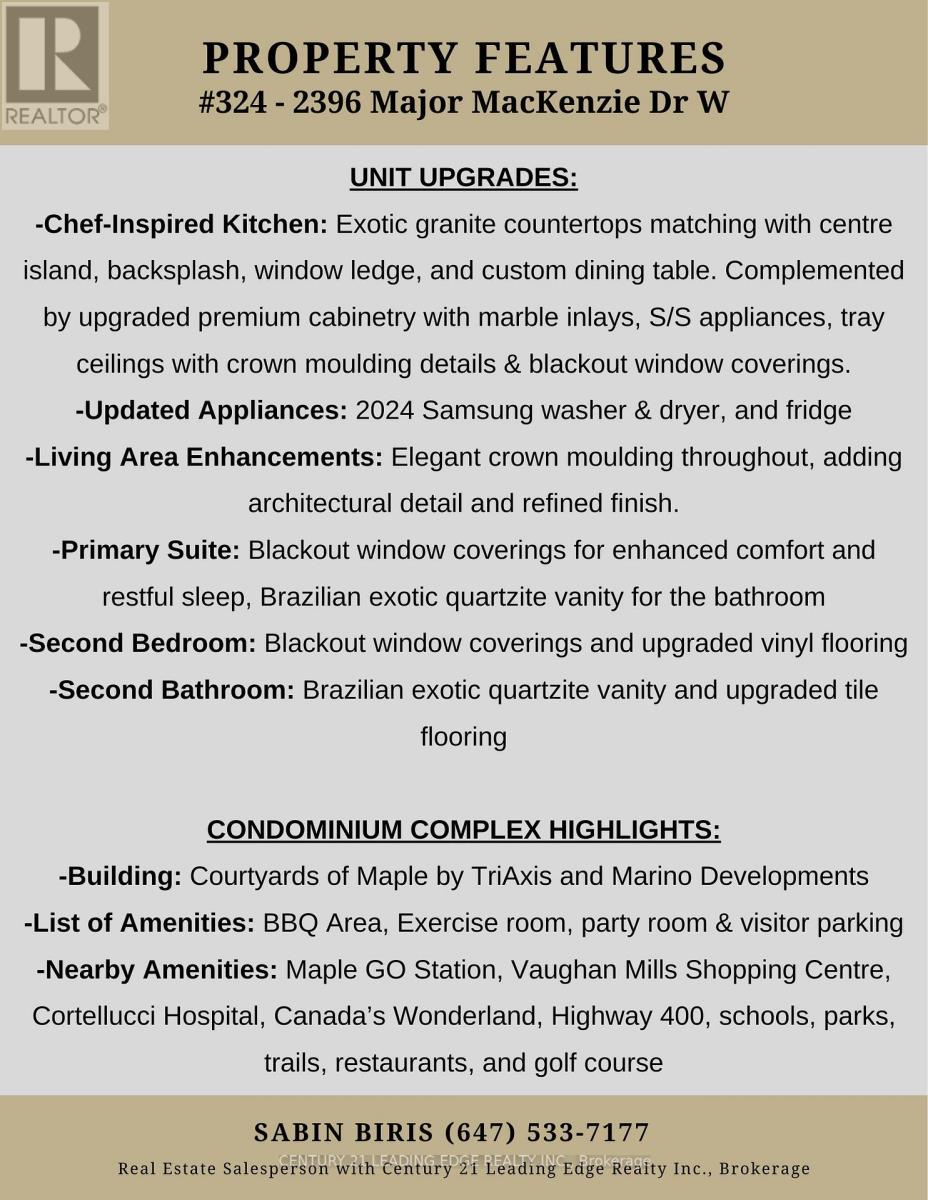 Discover refined living in this 882 sq ft European-inspired boutique corner condo, where 9 ft ceilings and warm west sunlight create a bright, inviting ambiance. The beautifully upgraded kitchen features a tray ceiling, crown moulding, premium cabinetry with marble inlays, exotic granite for the centre island, countertops, backsplash and window ledge with a matching dining table, and stainless steel appliances which is perfect for effortless entertaining. The open-concept living and dining area, enhanced with elegant crown moulding, provides a spacious and airy canvas for gatherings or quiet evenings with a great size balcony. The primary bedroom offers a serene retreat with a walk-in closet and 3-piece ensuite, while the second bedroom is ideal for children, guests, a home office, or hobbies. The additional 4-piece bathroom adds everyday convenience. Both bathrooms have upgraded Brazilian Exotic Quartzite for vanities. Rarely offered, this unit includes 2 underground parking spaces and a locker. Enjoy resort-style amenities including a landscaped courtyard with BBQ, fitness room, party room, and visitor parking, and not to forget the main floor stores! (Dental Office, Healthcare, Spa & Skin Care, Jewelry). Ideally situated just steps from Maple GO Station, Vaughan Mills, Cortellucci Hospital, Canada's Wonderland, Highway 400, parks, trails, restaurants, and a golf course. This condo truly has it all. (id:4555)
