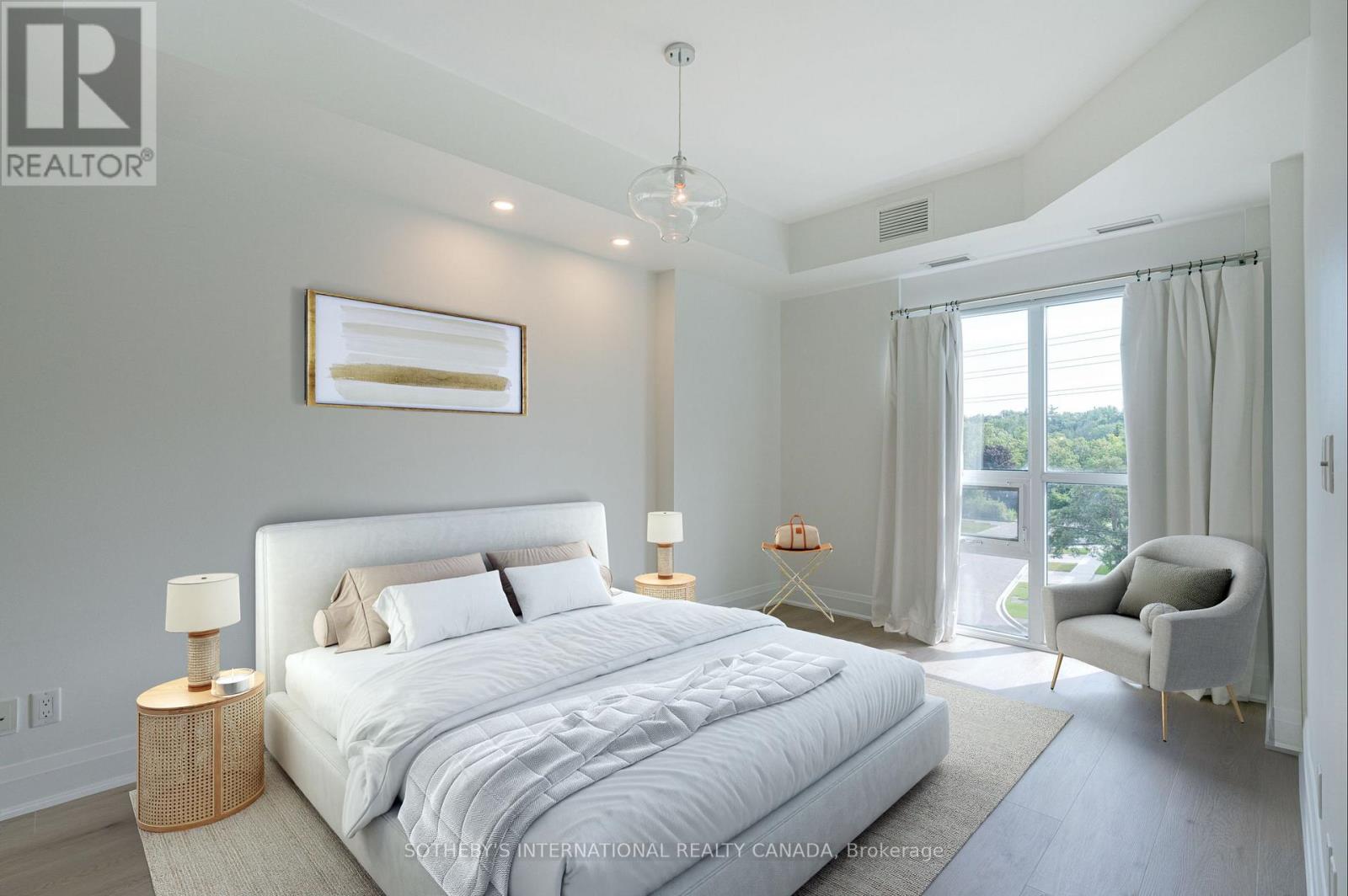 Sunny, contemporary two-bedroom corner residence offering exceptional indoor-outdoor living. This beautifully maintained condo boasts a rare, south-facing 315 sq ft oversized terrace featuring NewTechWood decking, a gas BBQ, built-in cushion storage, planters, and tranquil treed views - the perfect private retreat for relaxing or cultivating flowers or vegetables. The recently updated interior showcases wide-plank white oak LV flooring, pot lighting, professionally painted throughout; elegant Restoration Hardware lighting, closet organizers and custom drapery. The thoughtfully designed split-bedroom floor plan offers ideal privacy and functionality. The primary suite comes complete with floor-to-ceiling windows, an ensuite bathroom and walk-in closet space. The second bedroom has floor-to-ceiling windows, a deep double closet and across the hall from a 4-pc bathroom. The kitchen includes a newer stainless steel refrigerator and a breakfast bar. The unit is equipped with a full-sized washer and dryer. Desirable two-car parking is included close to the unit locker. Situated in a quiet, well-maintained building, this turnkey unit is a rare find in the area and is ready to be enjoyed this spring. **Furniture is virtually staged - the unit contains the tenant's furniture at present.** (id:4555)