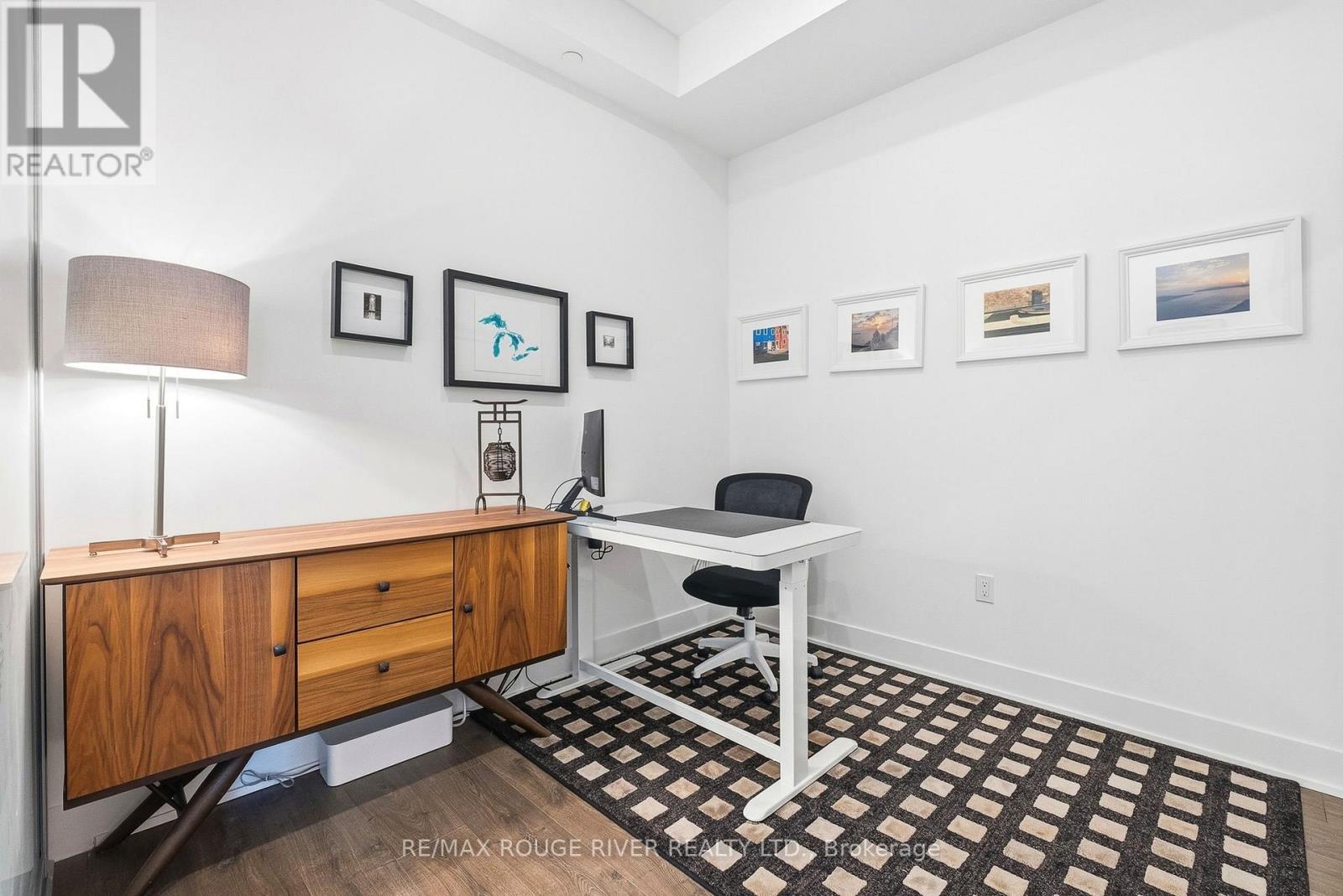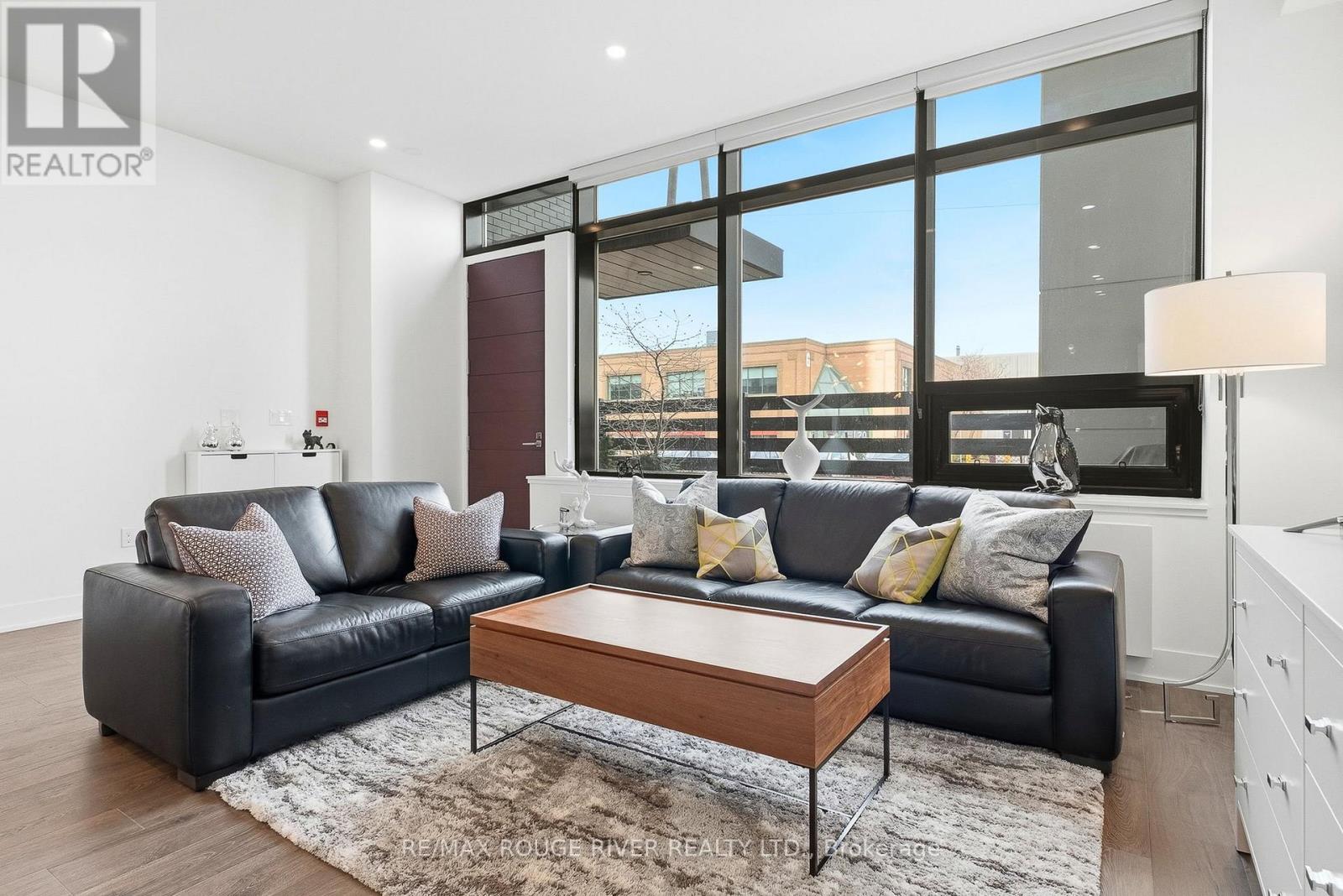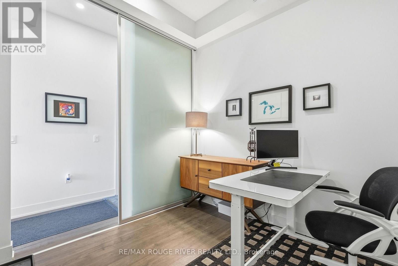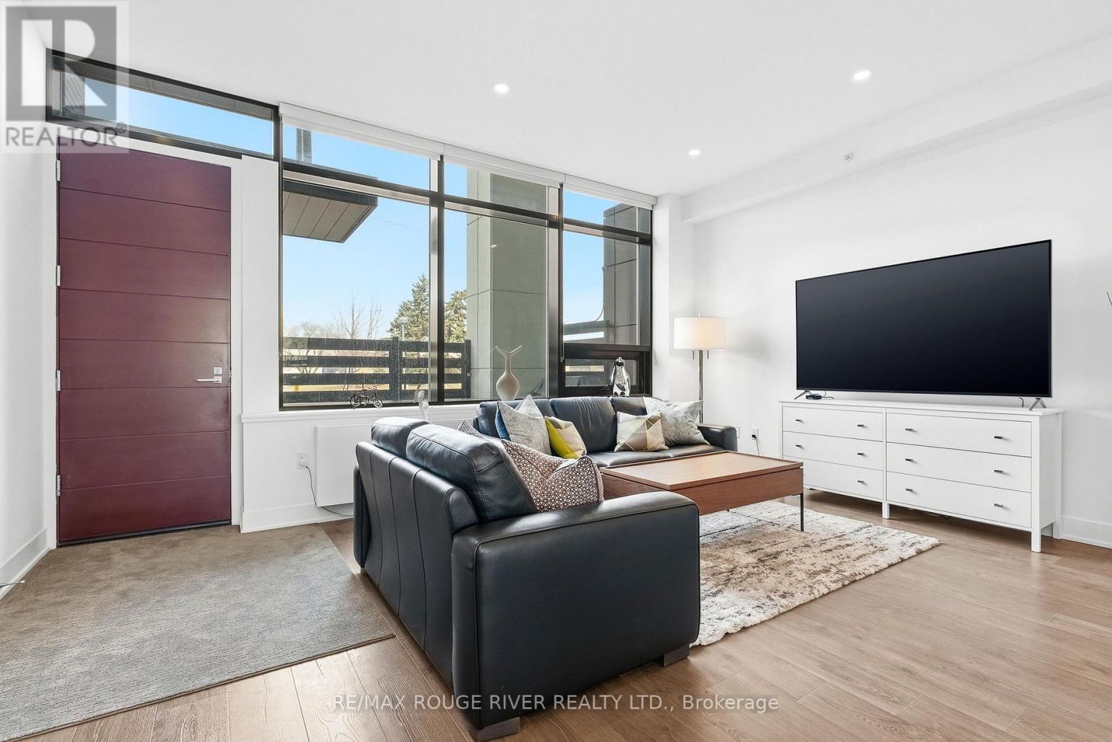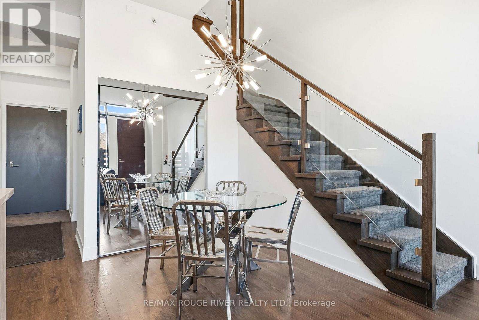 Outstanding value meets a curated lifestyle at the prestigious NORD East Condos known for superb amenities & good quality Dell property management. Bright open plan layout with soaring ceilings, tall windows, and walkout to a private terrace ideal for dining alfresco, complete with a bbq gas line and waterline, plus your own private exterior entry gate, perfectly suited to an active lifestyle and pet-friendly living.The integrated chef's kitchen features Caesarstone counters, and integrated Miele appliances, blending style with everyday function. A spacious main floor den with mirrored closets offers flexibility as an office, a den, or as a guest room with proximity to the 2 piece powder rm. The elegant glass staircase leads to a generous sized primary retreat with a walk in closet and ensuite with extended double vanities. Custom blinds, pot lights, and curated finishes throughout. Enjoy resort style amenities including the aqua oasis with indoor/outdoor pools, yoga studio, fitness centre, 24 hour concierge, guest rooms, theatre room, party room, chef's table, and pet spa, along with a new park featuring a children's play area. Includes a storage locker and a dedicated parking space in the garage plus ample ground level parking.. and with steps to the subway and Viva transit, the power of proximity connects you seamlessly to the city. (id:4555)