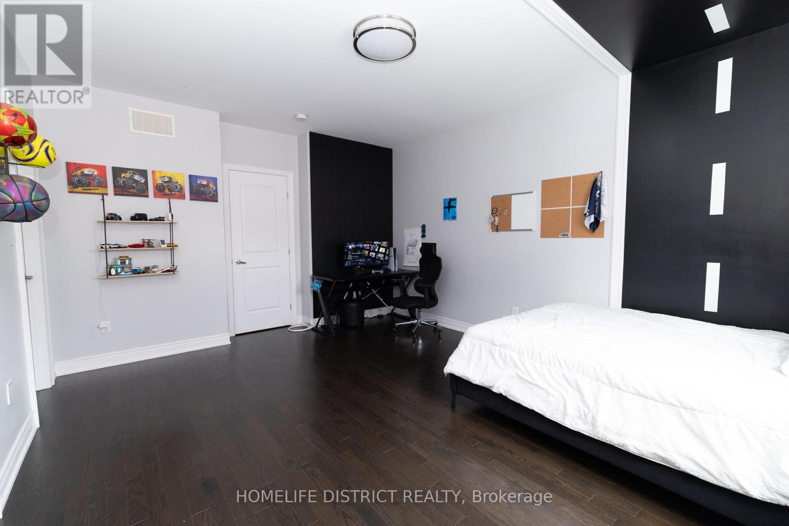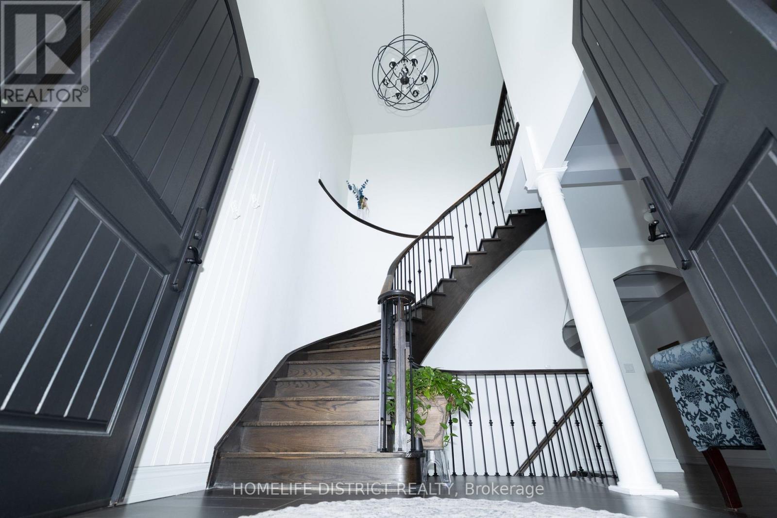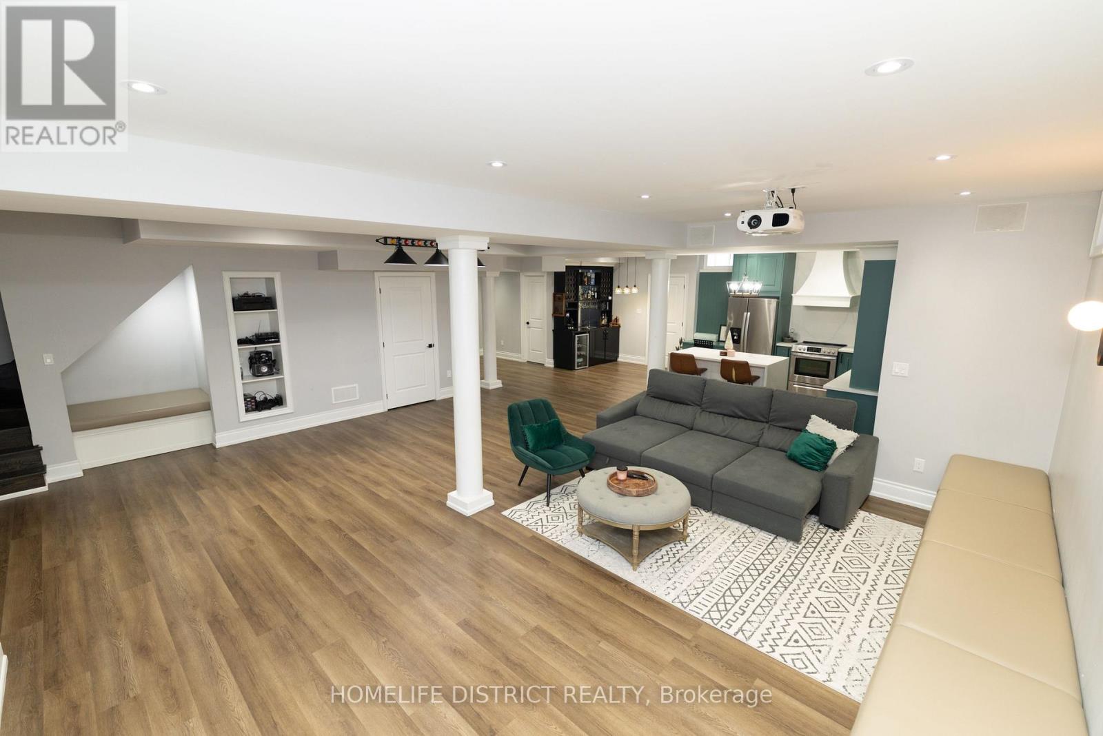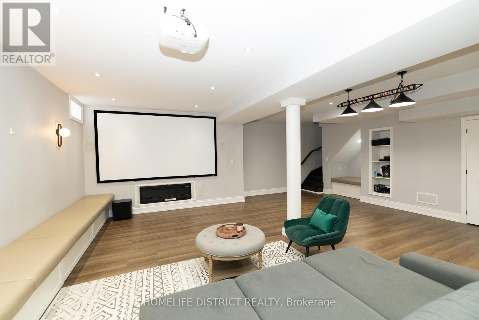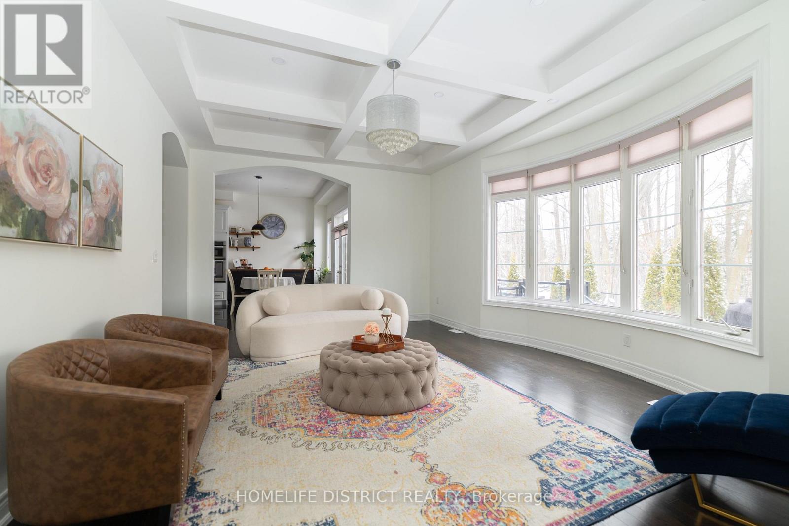 Wake up to the peaceful chirping of birds in this luxury ravine-backing home offering ultimate privacy. Built by Mosaik Homes, The St. Germain Elevation C offers 4,160 sq ft above grade with 10-ft waffle and coffered ceilings on the main floor and 9-ft ceilings on the second and basement levels. The open-concept layout features spacious living areas and four large bedrooms, each with its own walk-in closet. The primary retreat includes a bay window overlooking the ravine, space for a sitting area, a spa-like ensuite with soaker tub, double sinks, glass shower, vanity, and abundant natural light, plus a custom walk-in dressing room. Upgrades include a separate basement entrance, main floor laundry/mudroom, extended kitchen cabinetry, granite countertops throughout, hardwood flooring, custom archways, built-in office and dining cabinetry, stone fireplace mantle, pot lights (interior/exterior), custom drapes and shades, and in-ground sprinklers. The finished basement is designed for entertaining with built-in seating/storage, home theatre with projector and speakers, reading nook, full kitchen, bar, bathroom, and a glass-enclosed gym (easily convertible to an in-law suite).Exterior highlights include an extended interlock driveway and patio fitting 3 cars side-by-side plus a 2-car garage. Interlock continues to the separate entrance and backyard pergola seating area overlooking a rose garden and ravine. A wood deck with glass railing provides unobstructed wildlife views. Additional features include double arched gates, landscaped gardens, fire pit area, and ample green space with room for a future pool. Close to Walmart Supercentre plaza, grocery stores, Cortellucci Vaughan Hospital, and walking distance to elementary, high school, and Catholic schools. (id:4555)