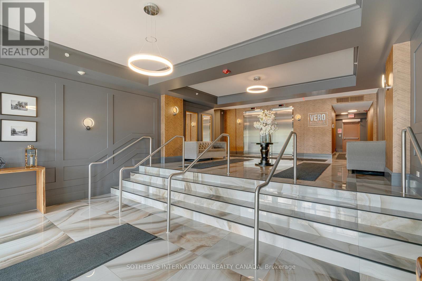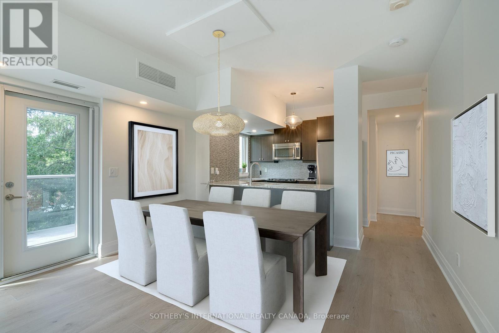 Large Terrace with gasline! Sunny, contemporary two-bedroom corner residence offering extraordinary indoor-outdoor terraced living. This beautifully maintained condo boasts a gorgeous, south-facing 315 sq ft oversized terrace featuring NewTech Wood decking, planters with boxwood, and mature treed views - the perfect private retreat for relaxing or for those with a green thumb. The recently updated interior showcases wide-plank, designer white oak LV flooring, pot lighting, contemporary tiled flooring in baths, new bath faucets and cabinet pulls; professionally painted throughout; elegant Restoration Hardware lighting/closet organizers/ drapery. The thoughtfully designed split-bedroom floor plan offers privacy and functionality. The primary suite comes complete with floor-to-ceiling windows, an ensuite 3-pc bathroom, and a walk-in closet. The second bedroom has floor-to-ceiling windows, a deep double closet and a 4-pc bathroom. The kitchen includes a recent stainless steel refrigerator with a glass door and a breakfast bar. The unit is equipped with a recent full-sized washer and dryer as well. Two-car parking is included, close to the unit locker and elevator. Situated in a quiet, well-maintained building, this terraced unit is a rare find and is ready to be enjoyed this spring. **Furniture is virtually staged ** (id:4555)