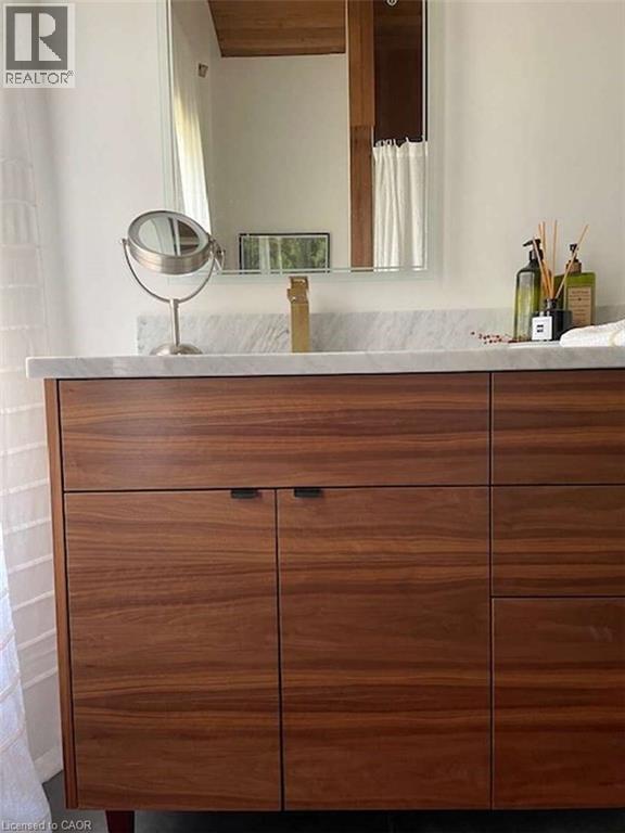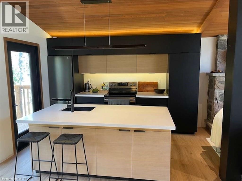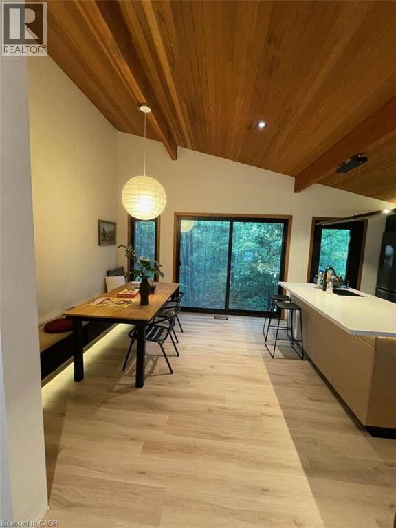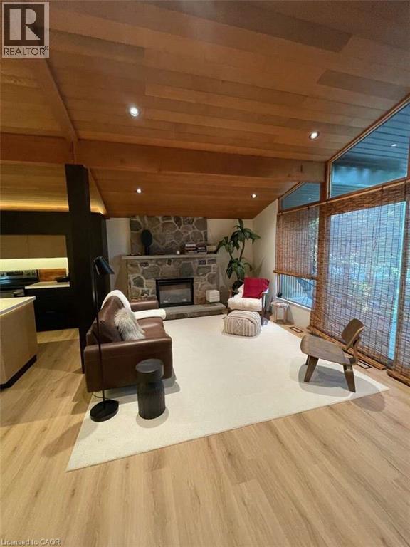 For more info on this property, please click the Brochure button. Welcome to this mid-century modern four-season home, just a short walk from the sandy shores of Wasaga Beach. Nestled on a quiet cul-de-sac and surrounded by mature trees, this 90' x 187' lot offers a peaceful and private setting with easy access to forest trails, biking paths, and outdoor recreation. This property is ideal for those seeking a full-time residence, a tranquil weekend retreat, or a high-end investment opportunity. This fully renovated property blends original charm with thoughtful upgrades. The interior features preserved 1970s cedar ceilings (15ft high), natural materials, and clean architectural lines. Slab on grade construction. No basement. Main Level: Entry, Office, 1 bdrm, 1 full bath with steam shower, and family room with F/P, bar/sink. Second Level: Kitchen/Dining, Living room with F/P, 2 bdrms, 1 full bath/tub and laundry. Large windows offering calming views of the trees and natural surroundings. Recent upgrades include a new steel roof (2021), 80,000 BTU gas furnace (2025), central A/C (2022), updated plumbing, and full electrical rewire with new panel (2022). Kitchen and dining area feature custom cabinetry, quartz countertops and new appliances incl. Bosch extra quiet dishwasher. Private, fully treed half-acre lot includes a firepit, natural landscaping, and offers a 5 minute walk to the beach via quiet, private pathways. Designed with inspiration from Japanese minimalism and Scandinavian warmth, the home offers calm, curated spaces throughout, making it a rare opportunity in one of Wasaga Beach’s most desirable locations. (id:4555)