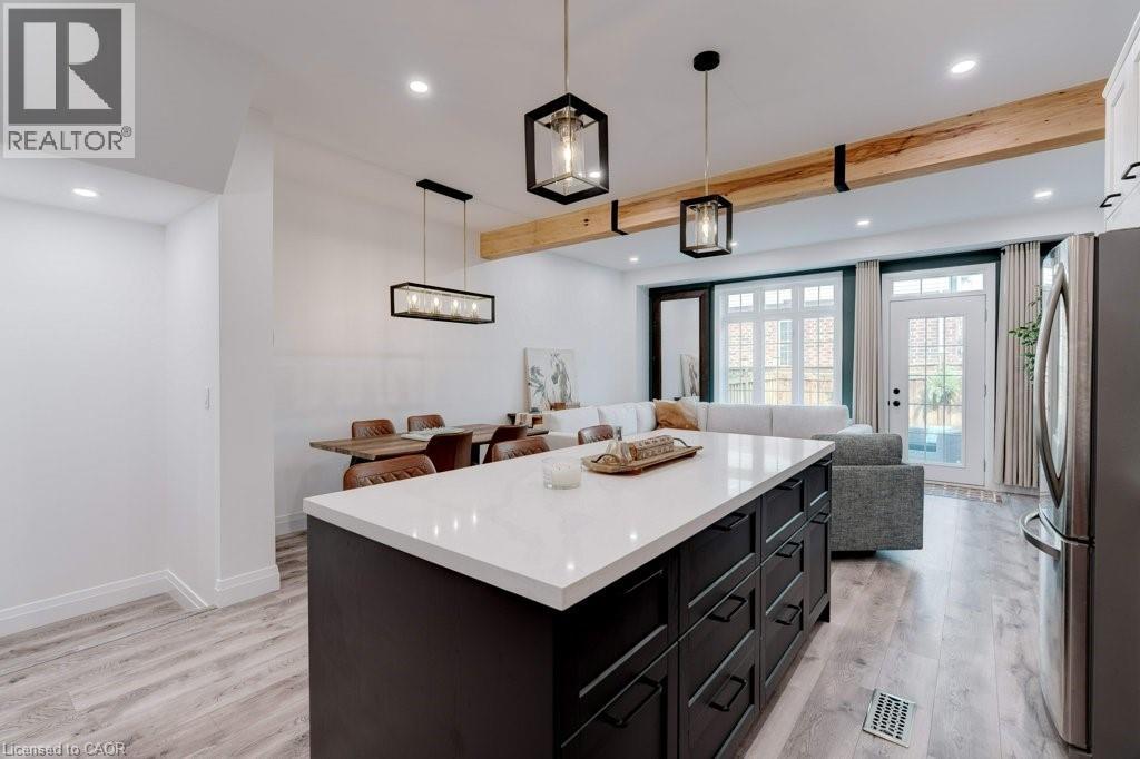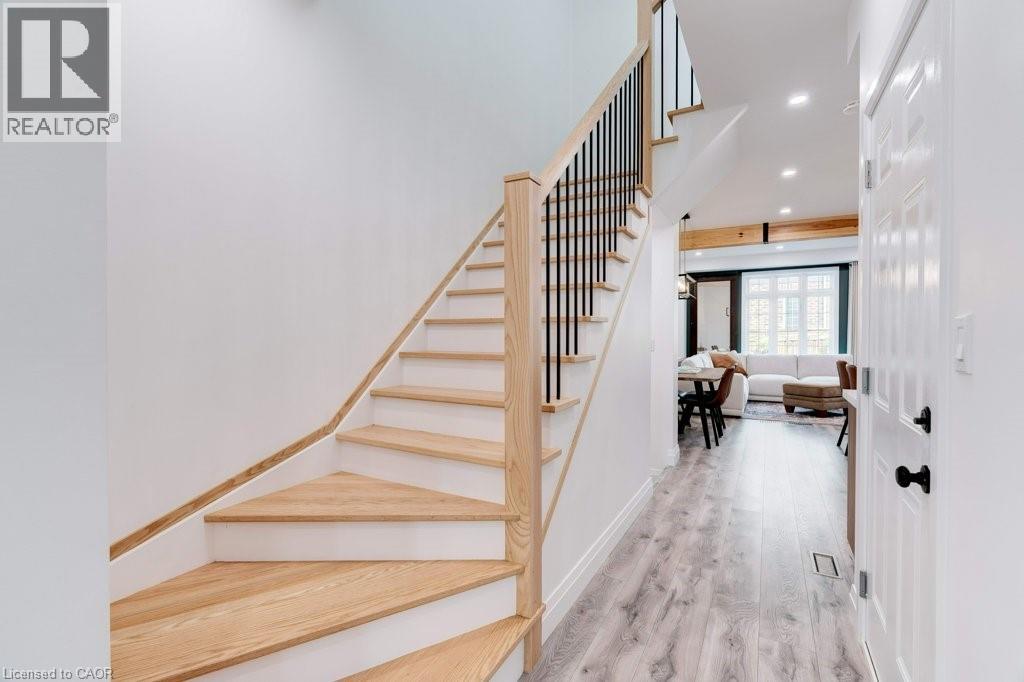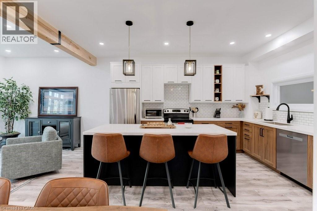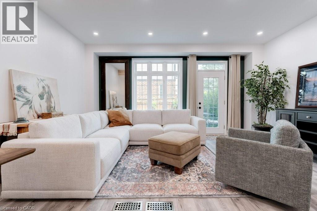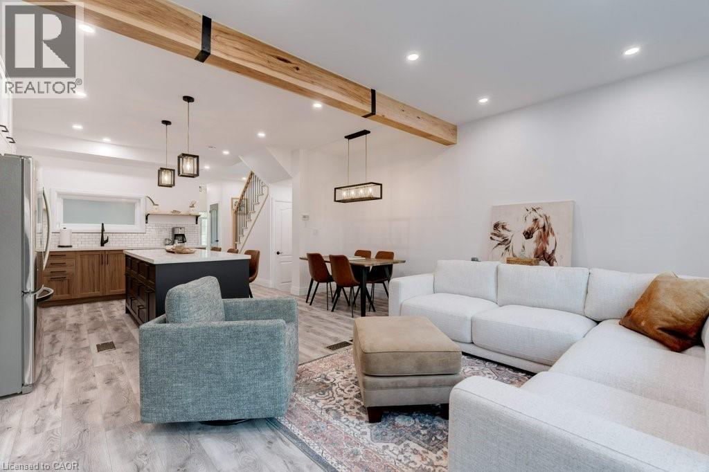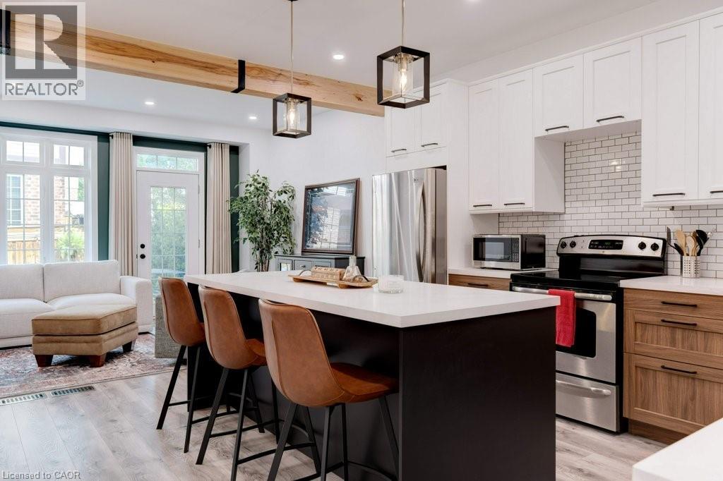 This beautifully upgraded freehold townhome in the heart of Waterdown delivers an exceptional blend of modern design, everyday comfort, and unbeatable convenience. Bathed in natural light, the home feels bright and inviting throughout, with a striking central skylight that fills the upper level with warmth. Completely renovated with permits in 2022, the thoughtfully reimagined layout offers seamless open-concept living that effortlessly connects indoor and outdoor spaces—ideal for both family life and entertaining. At the centre of the home is a stunning custom kitchen, completed in 2023, combining style and functionality with high-end finishes. A handcrafted hickory-clad beam adds character, while the custom staircase and railings create a standout architectural feature. Organization is elevated with built in custom California Closets installed in every bedroom and the upper-level laundry area, ensuring practical, well-designed storage throughout. Extensive upgrades provide both comfort and peace of mind, including a new roof in 2023 with a 40-year warranty, updated flooring, carpet, trim, and fresh paint. Roxul Safe ’n’ Sound insulation has been added to the main floor ceiling, interior walls, and party walls for enhanced privacy and quiet. The ducts and furnace were professionally cleaned in 2023, completing the home’s comprehensive list of improvements. Outside, professionally landscaped yard feature low-maintenance turf in the back, offering year-round greenery with minimal upkeep. Perfectly situated close to schools, parks, trails, the YMCA, shopping, dining, and vibrant downtown Waterdown, this home also provides quick access to Aldershot GO Station and major highways including the QEW, 403, 407, and Highway 6. Stylish, turnkey, and impeccably maintained, this is a rare opportunity to own in one of Waterdown’s most sought-after communities. Don’t be TOO LATE*! *REG TM. RSA. (id:4555)