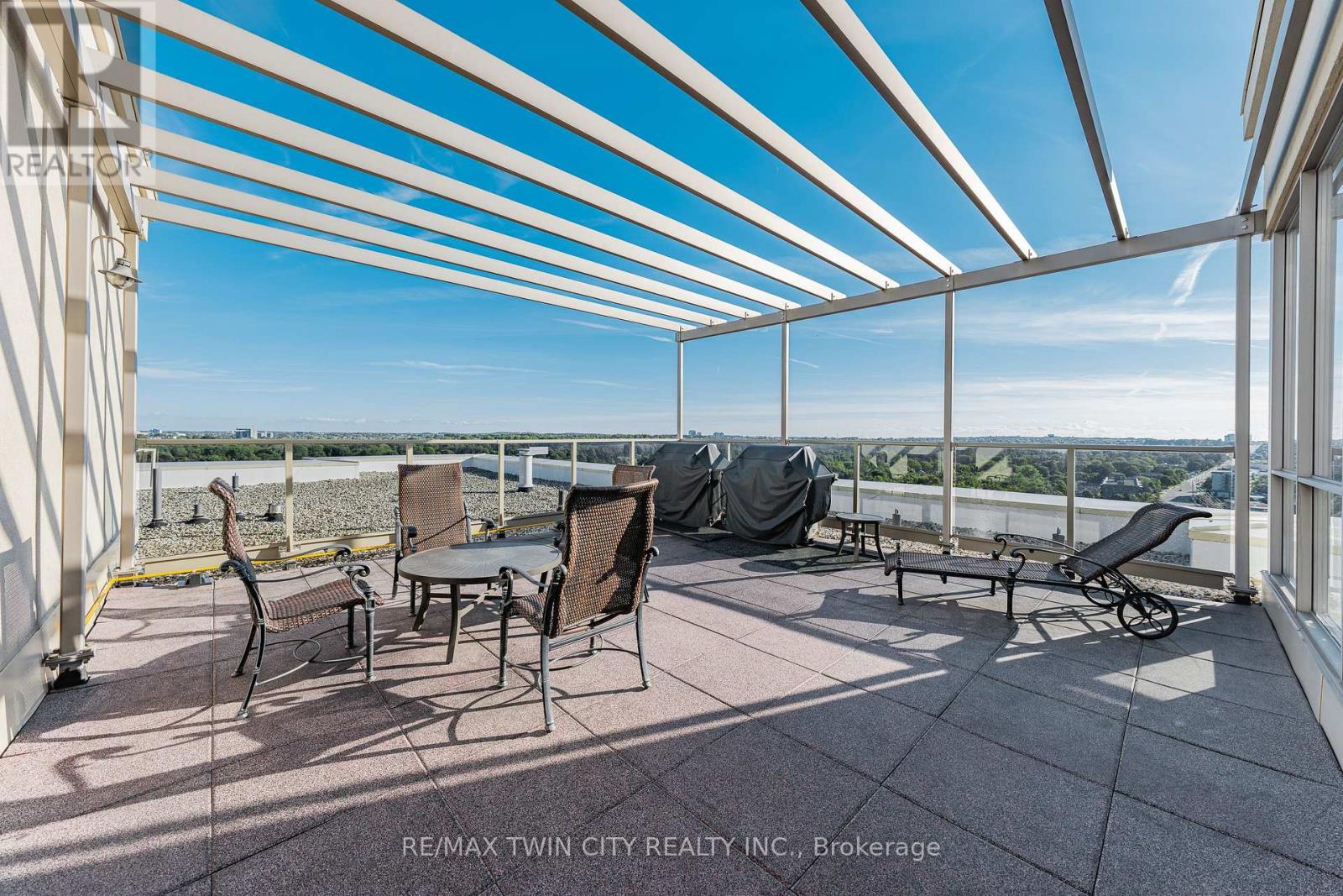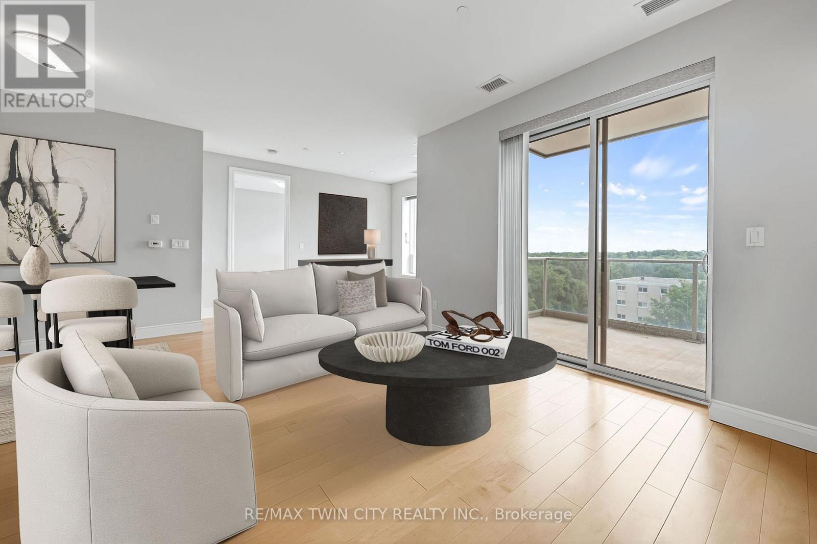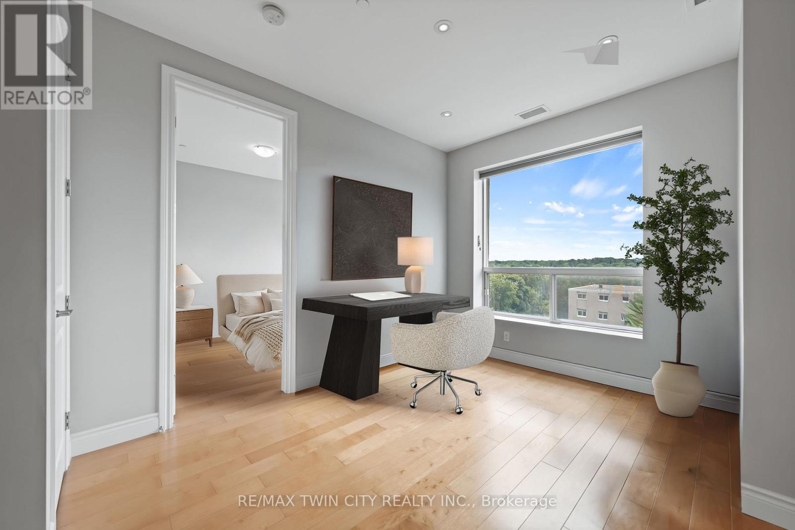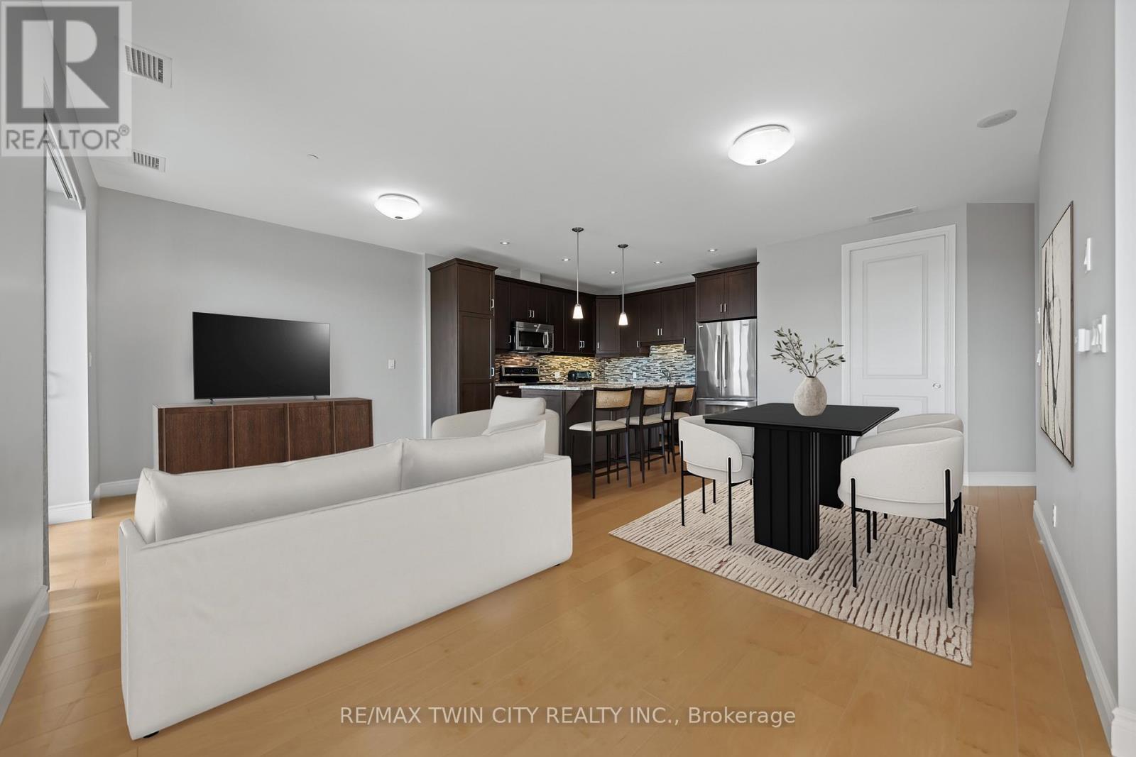 Experience upscale condo living at the Westmount Grand, one of Waterloos most prestigious addresses! This impressive west-facing 1-bedroom + den, 2-bathroom suite combines luxury, comfort, and convenience in the heart of Uptown Waterloo. Inside, you'll find 9 ceilings, a spacious open-concept kitchen with island, granite counters, stainless steel appliances, under-cabinet lighting, and a stylish backsplash. The expansive living and dining areas are framed by large windows, filling the space with natural light and showcasing panoramic city views. A bonus flex space offers the perfect spot for a home office. Hardwood flooring flows seamlessly throughout the main living area, adding warmth and elegance. The oversized primary bedroom is a true retreat, featuring a large window, dual closets, and a 5-piece spa-inspired ensuite. Additional highlights include a second full bathroom, in-suite laundry, and a storage room. Step out to the spacious covered balcony to take in spectacular sunsets! This unit also includes one underground parking space and one locker. Residents of Westmount Grand enjoy an array of first-class amenities: a rooftop terrace, library, fitness centre, sauna, entertainment room, and secure underground parking. Perfectly located, you'll be steps from Uptown Waterloos restaurants, shops, and parks, and just minutes from the University of Waterloo and Wilfrid Laurier University. Luxury, lifestyle, and location, this condo has it all! (id:4555)