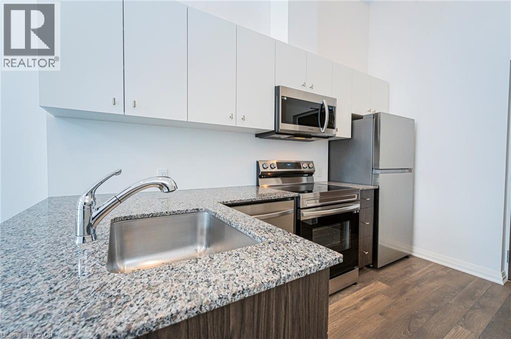AVAILABLE IMMEDIATELY! SURFACE PARKING INCLUDED! Welcome to Urban Comfort at The Jake Condos in North Waterloo's Lakeshore Neighbourhood! Step into the extraordinary with this exceptional 1 Bedroom Ground-level condo, boasting a unique blend of style, convenience, and modern living. Situated in one of Waterloo's most coveted neighbourhoods, this residence offers an array of amenities within easy reach and features impressive 14-foot ceilings that create an atmosphere of spaciousness and grandeur. The thoughtfully designed floor plan maximizes efficiency and comfort, with natural light pouring into the open-concept living space, highlighting every detail. This immaculate unit's kitchen comes equipped with sleek cabinetry, stainless steel appliances, and an expansive countertop—perfect for meal preparation and entertaining. And when it comes to location, convenience is key. Imagine starting your day with a morning pick-me-up from Starbucks or Tim Hortons just steps away. Countless dining options await your exploration, and with easy access to transit, including the LRT and bus stops, navigating the city or commuting to work is effortless. Sobeys across the street caters to your grocery needs, while nearby amenities like banks and the vibrant St Jacobs Farmers Market add to the neighborhood's charm. With its unbeatable location, efficient design, and access to a world of amenities, The Jake Condos provides the perfect backdrop for everyday living. Don't miss the chance to make this urban rental oasis your own! (id:4555)