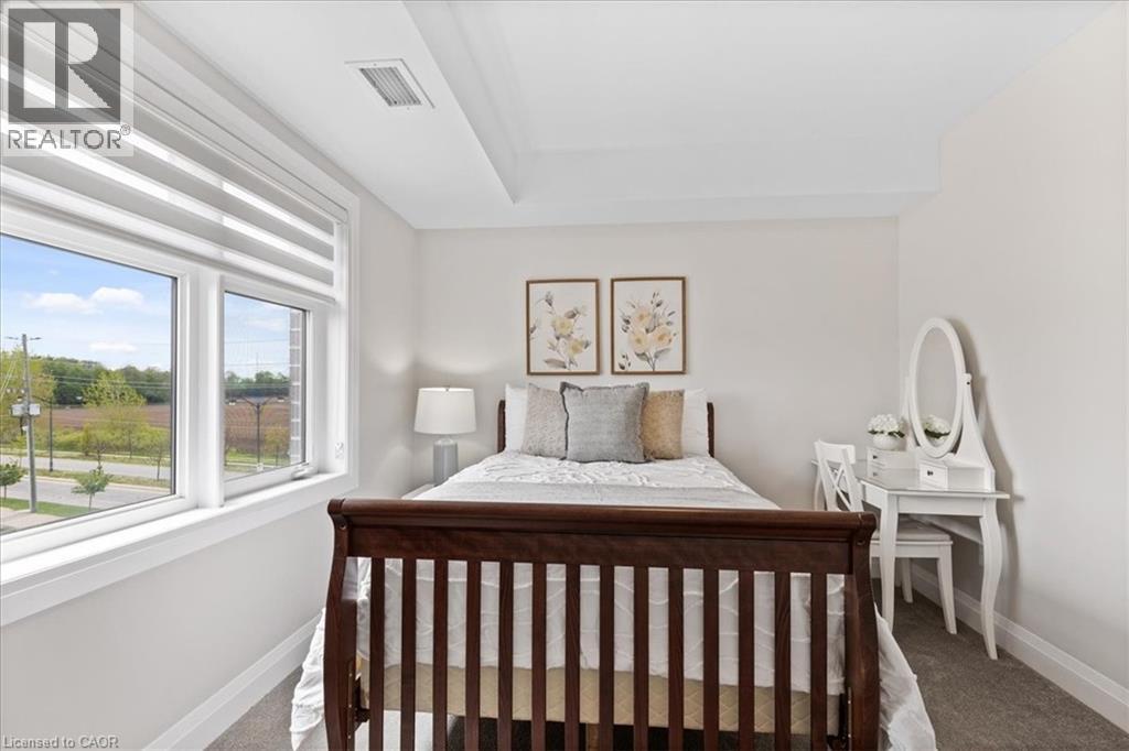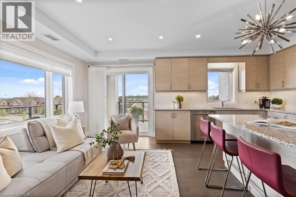 Beautiful 2-bedroom, 2-bath executive condo located in the highly sought-after Carriage Crossing neighbourhood. This bright corner unit, just 4 years old, enjoys west-facing exposure with no direct neighbouring views, allowing for plenty of natural light throughout the day. The modern open-concept kitchen features quartz countertops, a stylish herringbone backsplash, under-cabinet lighting, a large island, stainless steel appliances, and plenty of storage—perfect for everyday cooking or entertaining guests. The sun-filled living area offers engineered hardwood flooring, upgraded lighting, and direct access to an expansive wraparound balcony. With two separate seating areas and wide open panoramic views, it’s an ideal spot to unwind with a drink after a long day. The spacious primary bedroom includes two closets and a private ensuite featuring a spa-inspired glass shower with built-in bench. The second bedroom is generously sized and filled with natural light, making it perfect for guests, a home office, or additional living space. Both bathrooms are finished with granite countertops and upgraded fixtures. This unit also includes a convenient drive-in underground parking space with a large private storage locker located directly in front, making access simple and practical. Additional features include in-suite laundry, water heater, and water softener. Residents enjoy access to an incredible rooftop terrace complete with planter gardens, comfortable seating areas, a fire table, communal BBQ, and stunning views—a wonderful place to gather with friends or relax outdoors. Fantastic location close to Rim Park, Grey Silo Golf Club, BlackBerry, scenic walking and biking trails, Brown’s Social House, Conestoga Mall, and the St. Jacobs Farmers’ Market. Experience the ease and comfort of condo living in one of Waterloo’s most desirable communities. (id:4555)