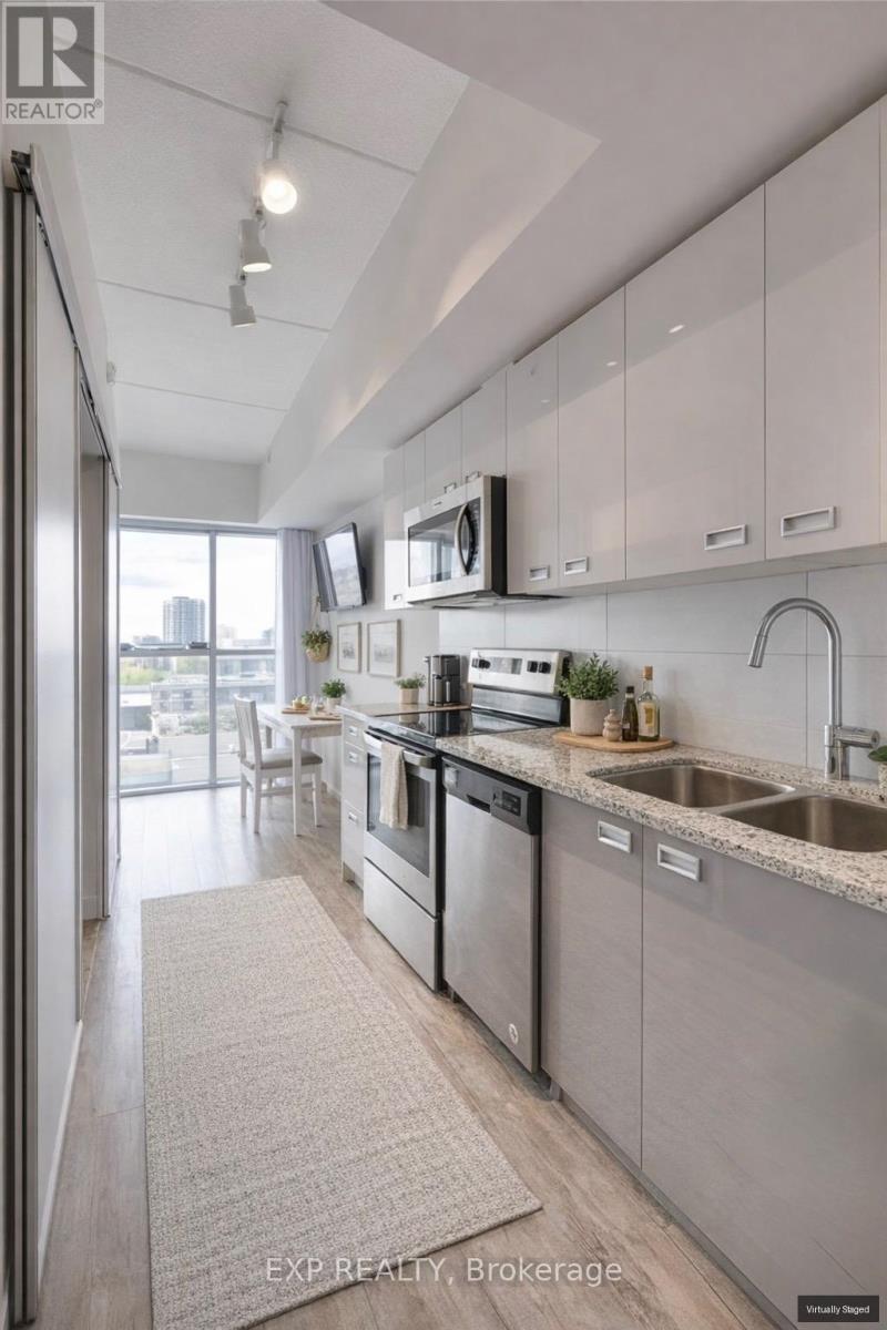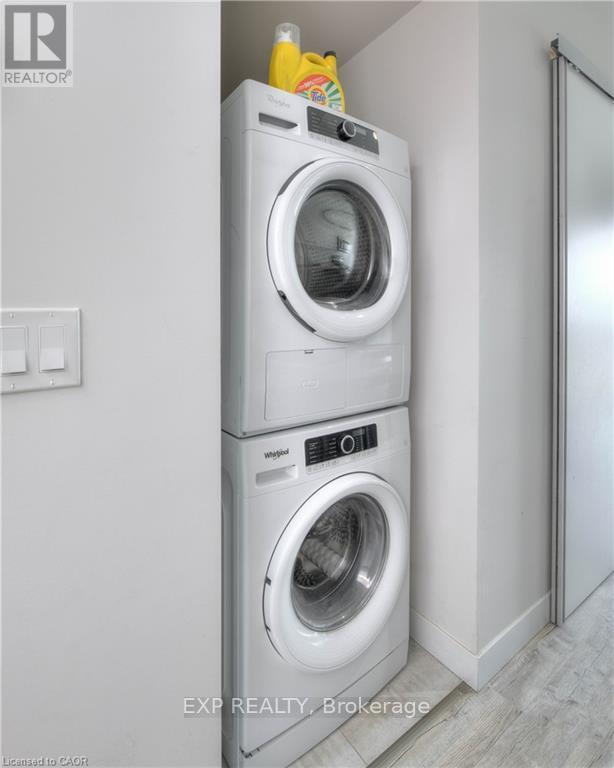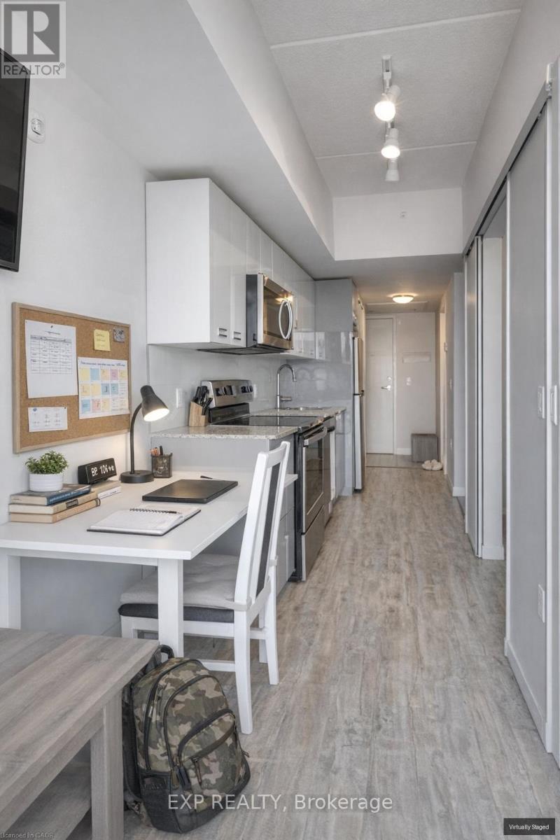 Welcome to urban sophistication at its finest! This stunning 1 bedroom, 1 bathroom condo nestled in the heart of Waterloo is walking distance to University of Waterloo and Wilfred Laurier University. The unit offers the epitome of modern living combined with convenience and comfort. As you step inside, you'll be greeted with floor-to-ceiling windows, which flood the space with natural light. The layout seamlessly integrates the living, dining, and kitchen areas, perfect for both relaxing evenings and entertaining guests. One of the highlights of this condo is the in-suite laundry, ensuring convenience and efficiency in your daily routine. The unit comes fully equipped with granite counter tops, stainless steel appliances, as well as existing furniture, including a full bed frame with mattress, a sofa, a coffee table, a built-in study table with shelves, an office chair, a dining table with four chairs, and a TV with TV console. Move-in ready, this condo offers a hassle-free transition. Moreover, residents of this building are granted access to an array of amenities designed to enhance their lifestyle. Keep up with your fitness goals in the exercise room, host memorable gatherings in the party room, or unwind and soak in panoramic views from the rooftop deck/garden and visitor parking for your guests. This condo presents an exceptional opportunity for investors as well as end-users. Book a showing today and experience everything that has to offer. - Property has been virtually staged. (id:4555)