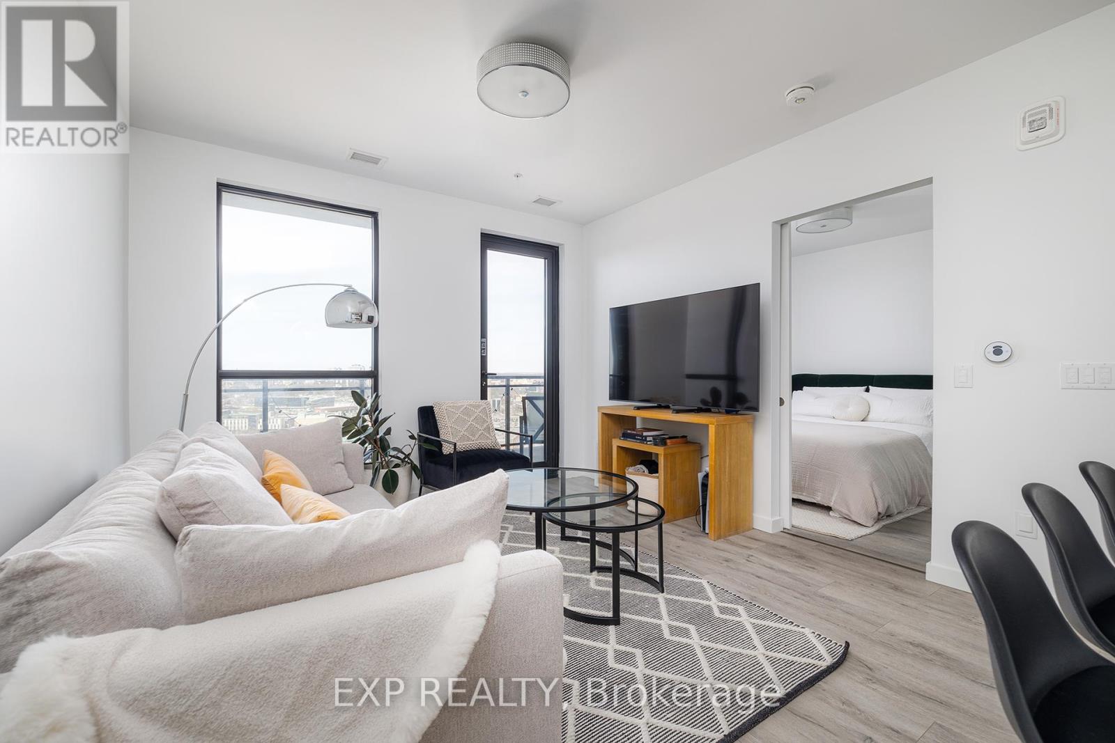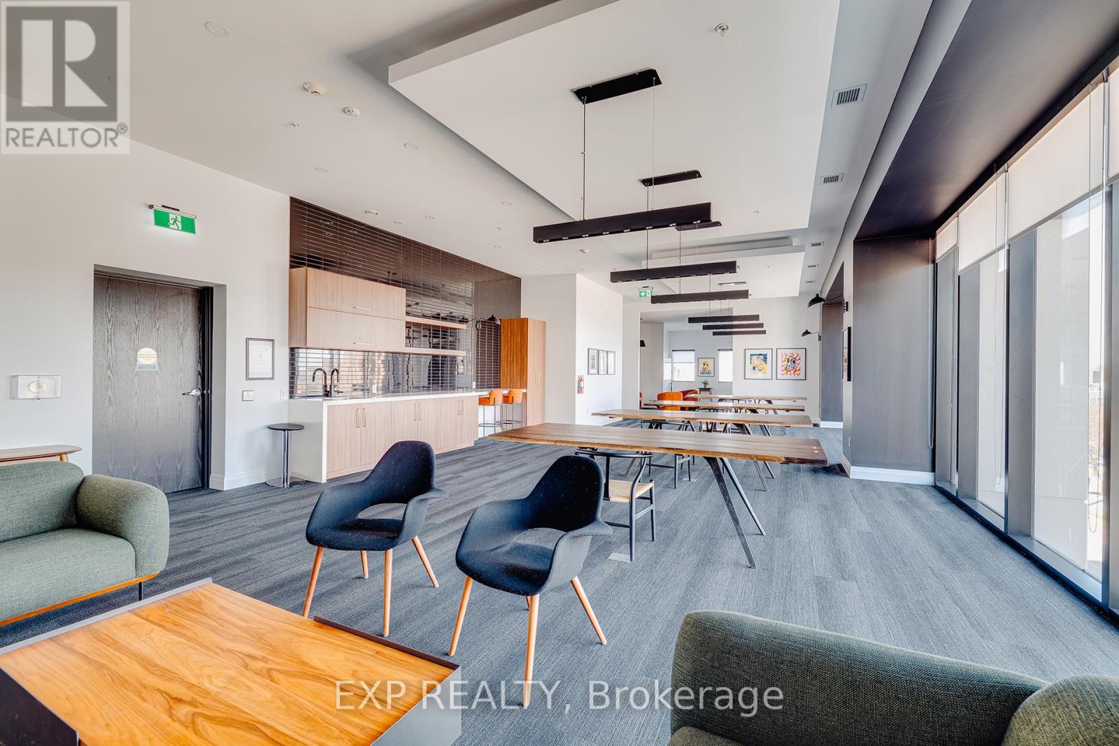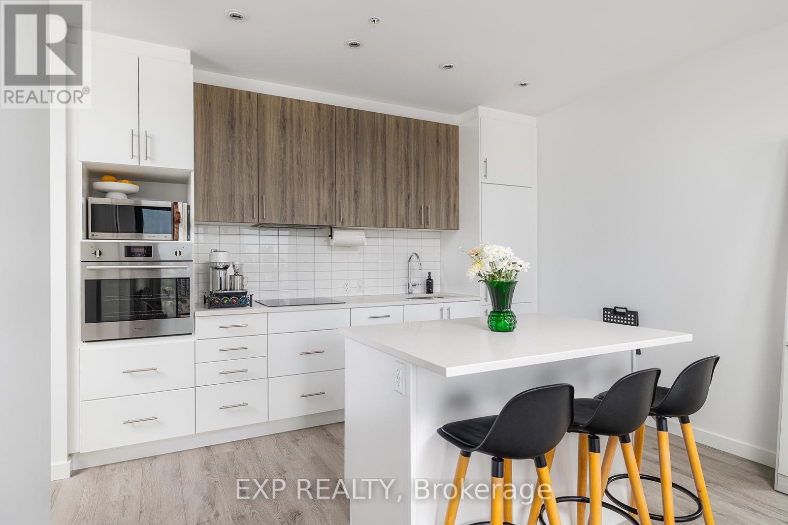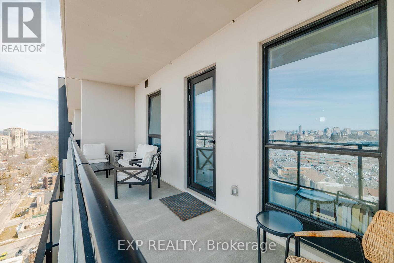 Take in breathtaking sunset views from your spacious private balcony on the 17th floor of Circa 1877, one of Uptown Waterloo's most sought-after condos. With 9' ceilings and expansive windows, this modern, bright unit offers a stylish open-concept living space. The European-inspired kitchen features built-in appliances, Quartz countertops, a gooseneck faucet, a subway-tile backsplash, and an island perfect for entertaining. The luxurious bathroom boasts porcelain tiles, Quartz counters, and a rainfall shower with a glass enclosure. Additional highlights include an in-suite washer and dryer, Smart lighting, and a custom wall-to-wall closet with a sliding barn door. Circa 1877 offers top-tier amenities, including a rooftop pool with a terrace, BBQ and cabanas, a fitness center and yoga room, a modern co-working space with meeting rooms, guest suites, secure bike storage, and a restaurant/bar. The building is monitored by cameras and features FOB access for added security. An onsite locker and optional parking rental add convenience. Located on King Street, you're just steps from the LRT, shopping, dining, boutique fitness studios, and healthcare services. Minutes away, you'll find Waterloo's Tech Hub, Waterloo Park, and the Iron Horse Trail-perfect for biking and running. This prime location makes it an ideal choice for young professionals. Don't miss this incredible opportunity to live in the heart of Uptown Waterloo-schedule your tour today - WIFI Included! (id:4555)
