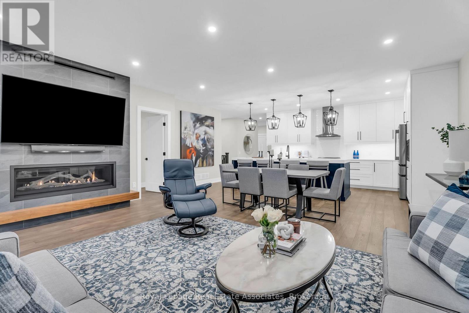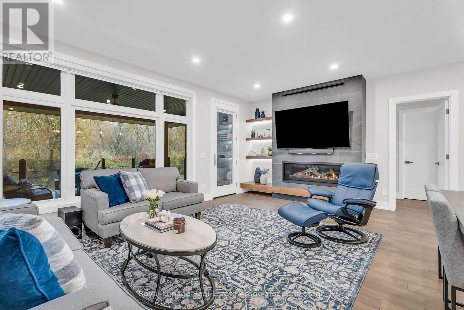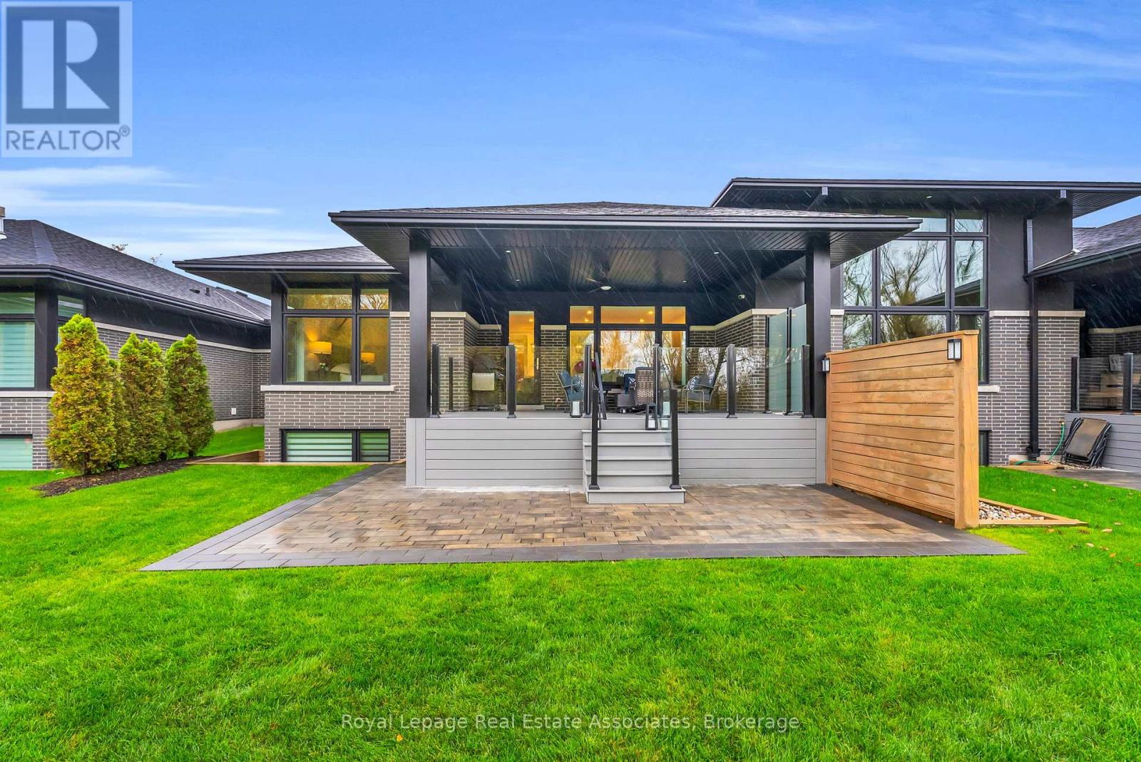 Welcome to this award-winning, Rinaldi-built luxury end-unit bungalow townhome, nestled in an exclusive community surrounded by protected green space. Only 4 years old, this home shows like new and features over $100,000 in premium upgrades. The main floor boasts 9' ceilings and includes 2 bedrooms, a fully upgraded kitchen with a stunning 10' island, and a spacious family room highlighted by a custom linear fireplace. The primary bedroom offers a walk-in closet and a luxurious ensuite with designer finishes. The finished basement impresses with 8' ceilings, an expansive recreation room, a full bathroom, and a large bedroom, providing ample space for guests or family. Additional upgrades include motorized window coverings, extensive pot lighting, and upgraded cabinetry and countertops throughout. Step outside to enjoy the morning sunrise from the 16' x 20' Trex deck or the lower patio, both overlooking a premium lot backing onto protected woodland-the perfect setting for peace and privacy. Experience ultimate 'lock and leave' lifestyle in this elegant bungalow townhome that is located minutes to all amenities. Forget exterior chores-the low maintenance fee covers your sprinkler system, grass cutting, snow removal. Enjoy sophisticated modern living with four key amenity rough-ins already complete: a central vacuum system, gas Stove, an elegant wet bar for effortless entertaining, and an electric vehicle (EV) charger in the garage. These spaces are professionally prepared for immediate installation and personalization. (id:4555)