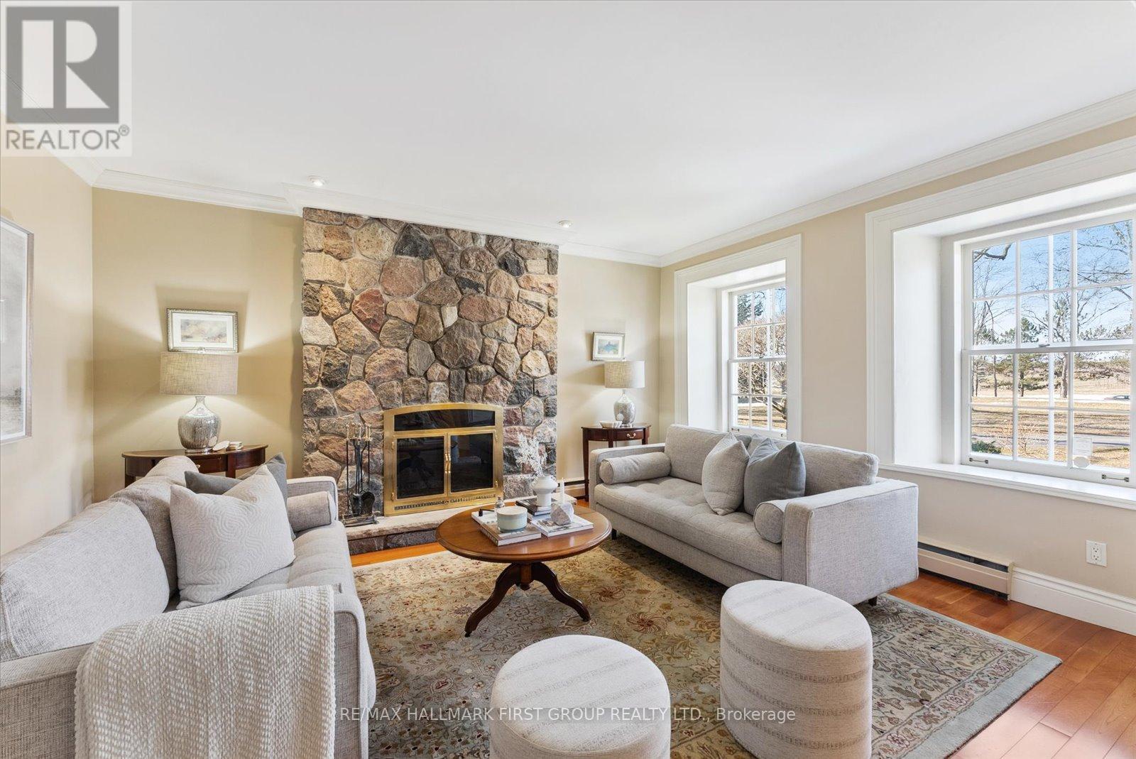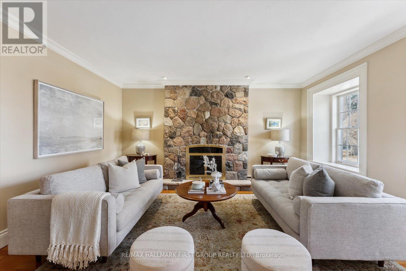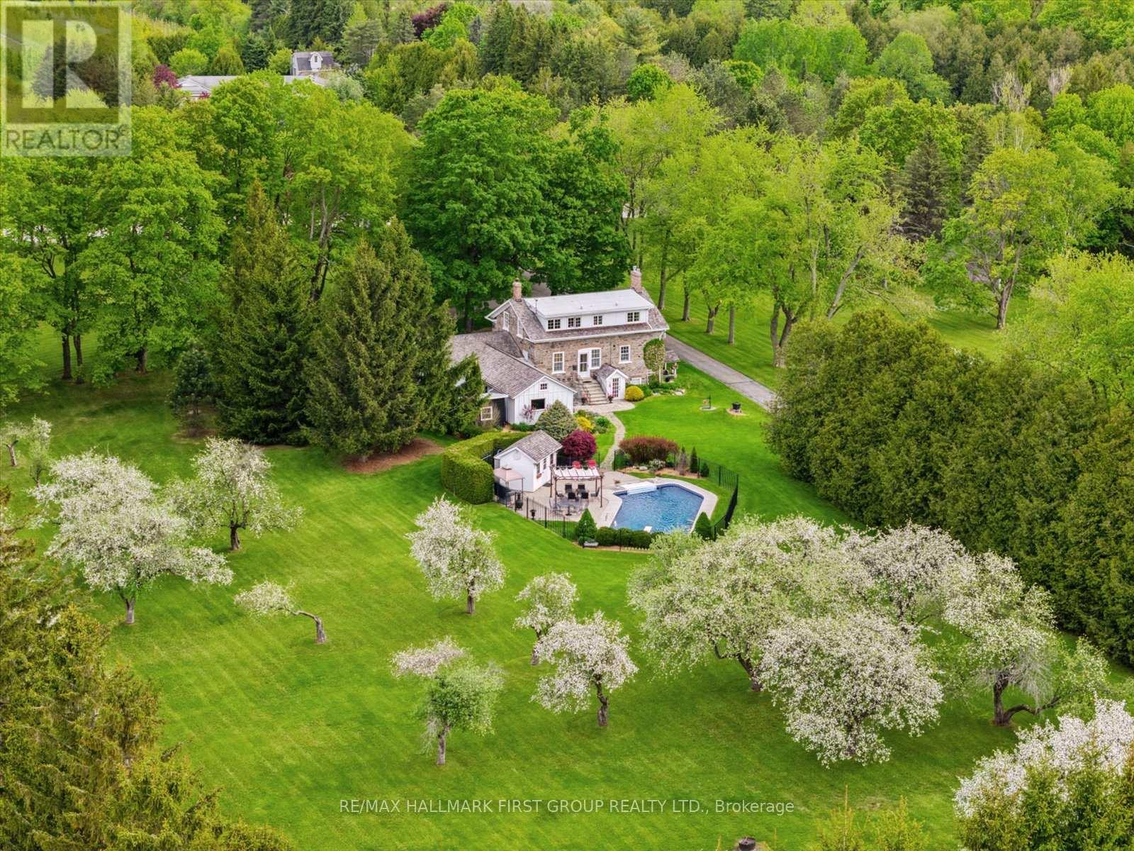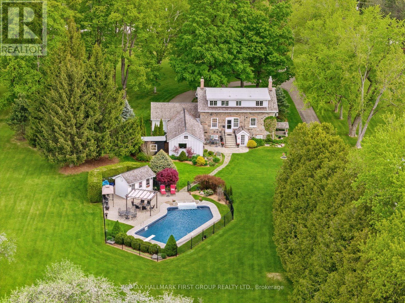 Welcome to Stone Eden-a place where timeless character and intentional living come together.Set on 10.87 rolling acres in the quiet countryside of Ashburn in Whitby, this remarkable property and home is a legacy meant to be lived in and cherished.From the moment you pass through the custom wrought-iron gate, a sense of calm settles in. The winding private drive leads you past two serene ponds, a mature apple orchard, and a heated in-ground pool, each element adding to the estate's rare privacy and natural beauty. A 37' x 28' barn enhances the possibilities-ideal for equestrian use, a hobby farm, creative workspace, or flexible storage.At the centre of the property stands the original hand-crafted stone residence, meticulously restored and updated to honour its heritage while offering modern comfort. Sunlight fills the inviting living and dining rooms, where warm hardwood floors and a gas fireplace set the tone for family gatherings and quiet evenings. The kitchen blends charm with functionality, featuring built-in appliances, a gas cooktop, and heated floors.The main floor also includes a sophisticated office with custom built-ins, perfect for focused work or study. Upstairs, four well-appointed bedrooms provide space and flexibility for families, guests, or multi-generational living. The finished walk-up basement adds yet another dimension, offering a stylish bar, gas fireplace, and a spacious area for relaxing or entertaining. Every detail of Stone Eden reflects pride of ownership-from the cedar roof (2020) and MagicWindows to the curated gardens and thoughtfully maintained trails. This is a property where history is preserved, nature is celebrated, and future memories are waiting to be made.Whether you're seeking a peaceful retreat, a multi-generational haven, or a place to fully embrace country living without compromise, Stone Eden invites you in. A truly rare and extraordinary opportunity. (id:4555)