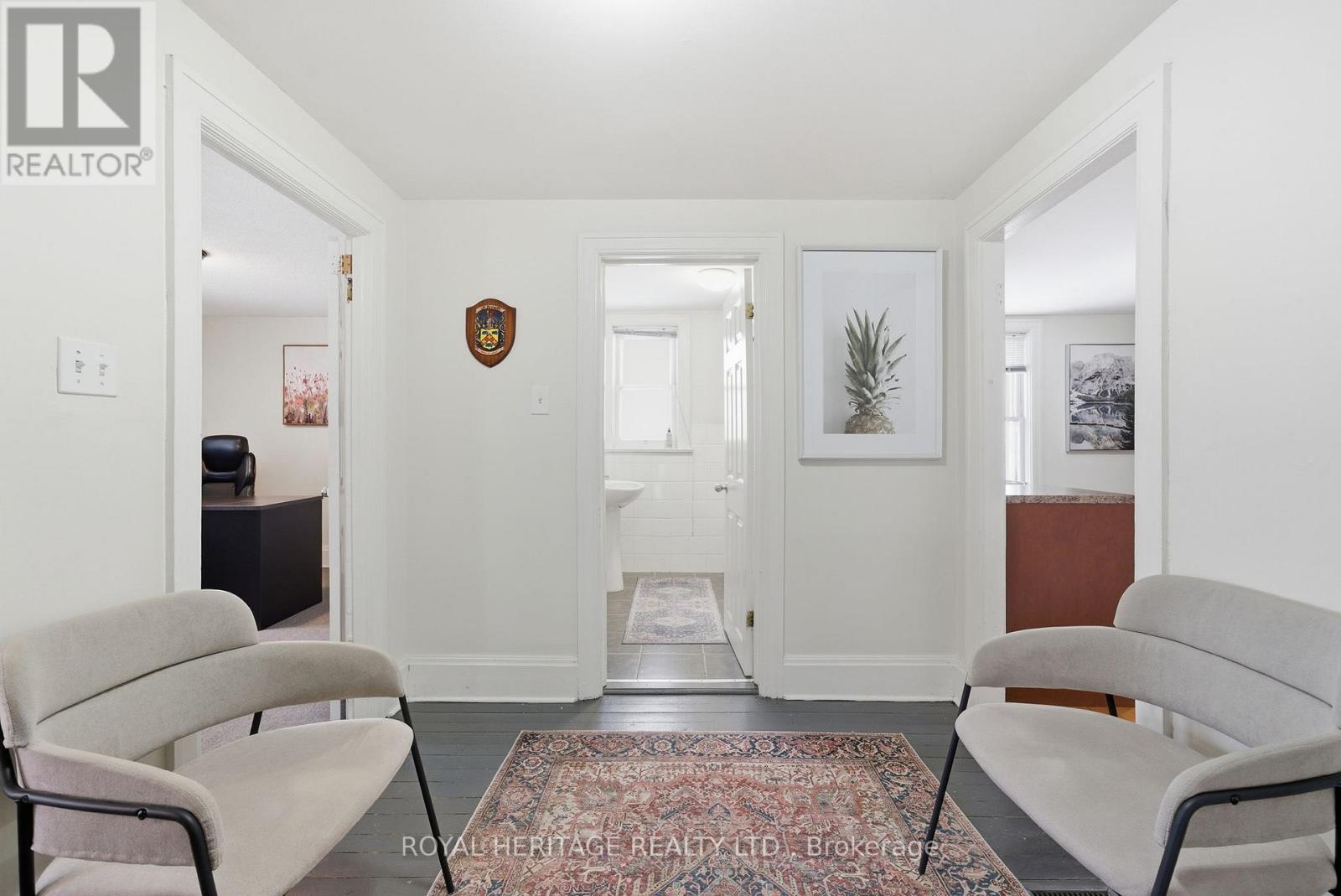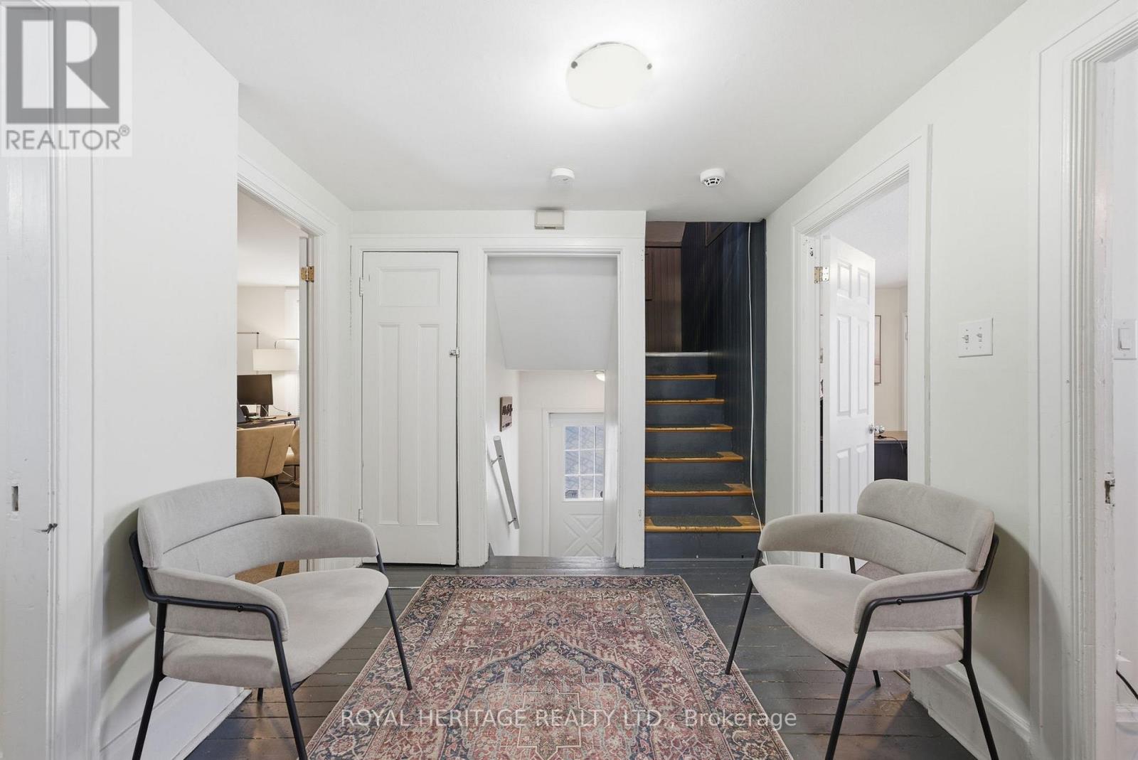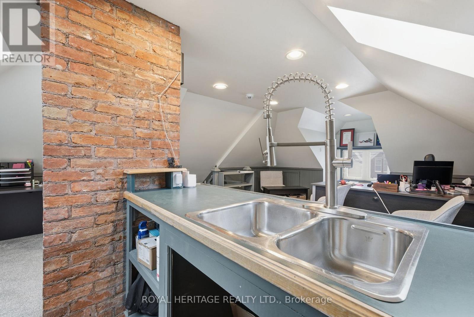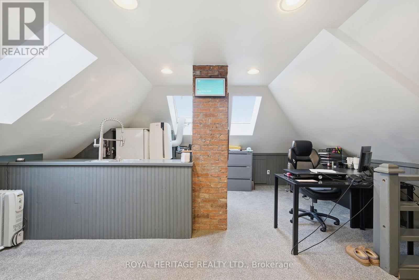 Amazing office in historic character building in downtown Whitby - walking distance from GO train, Highway 401 and the 4 Corners. Features listed here: Private entrance off private deck overlooking Brock Street. A large entrance foyer connects 3 large offices, a full kitchen and bathroom on the 2nd floor. The spacious loft features a conference room/open concept area (with enough room to fit 6 desk stations) and includes a window, skylight, fridge and wet bar. 5 parking spaces. Fantastic high traffic location in the heart of downtown business area. Minutes to Highways 412 & 407. Great visibility - corner lot. Near tail end of Whitby Santa Claus Parade route, a great place to enjoy the parade with your customers/clients . Previous uses include: lawyer, accountant, massage therapy, media production. Main floor (separate unit) has been occupied by Royal Heritage Realty Ltd., since 2017, employing over 300 agents - many potential opportunities for business synergy to help grow your business. Please note front shutter to be re installed when weather permits. Previous 3 tenants have left for larger units after growing their businesses at this location; could you be next? (id:4555)