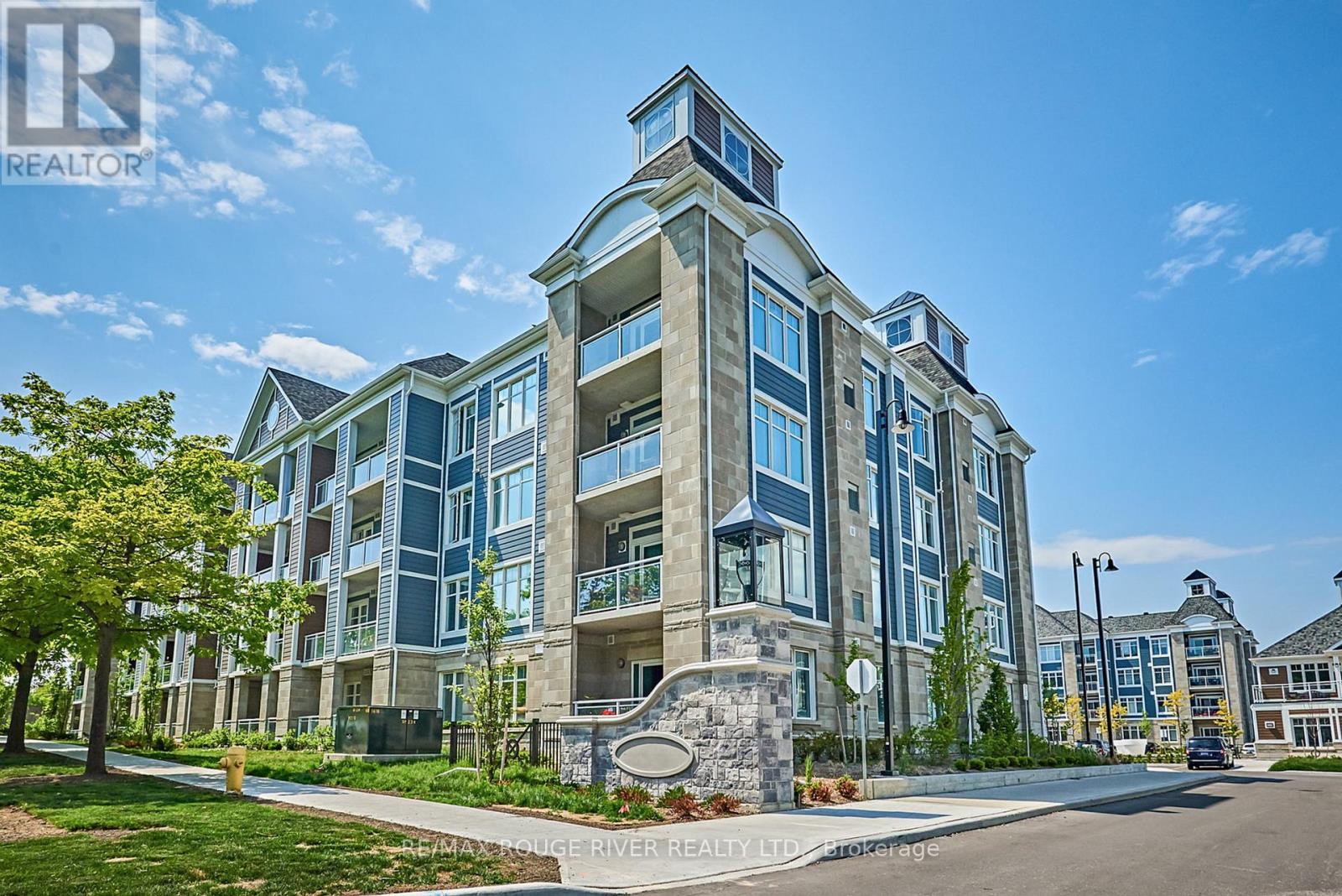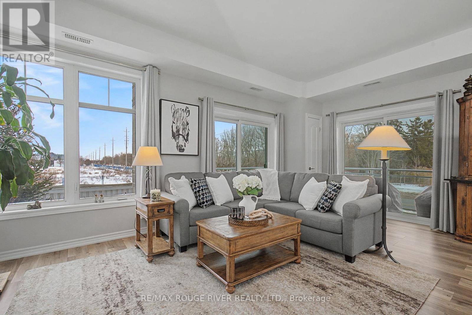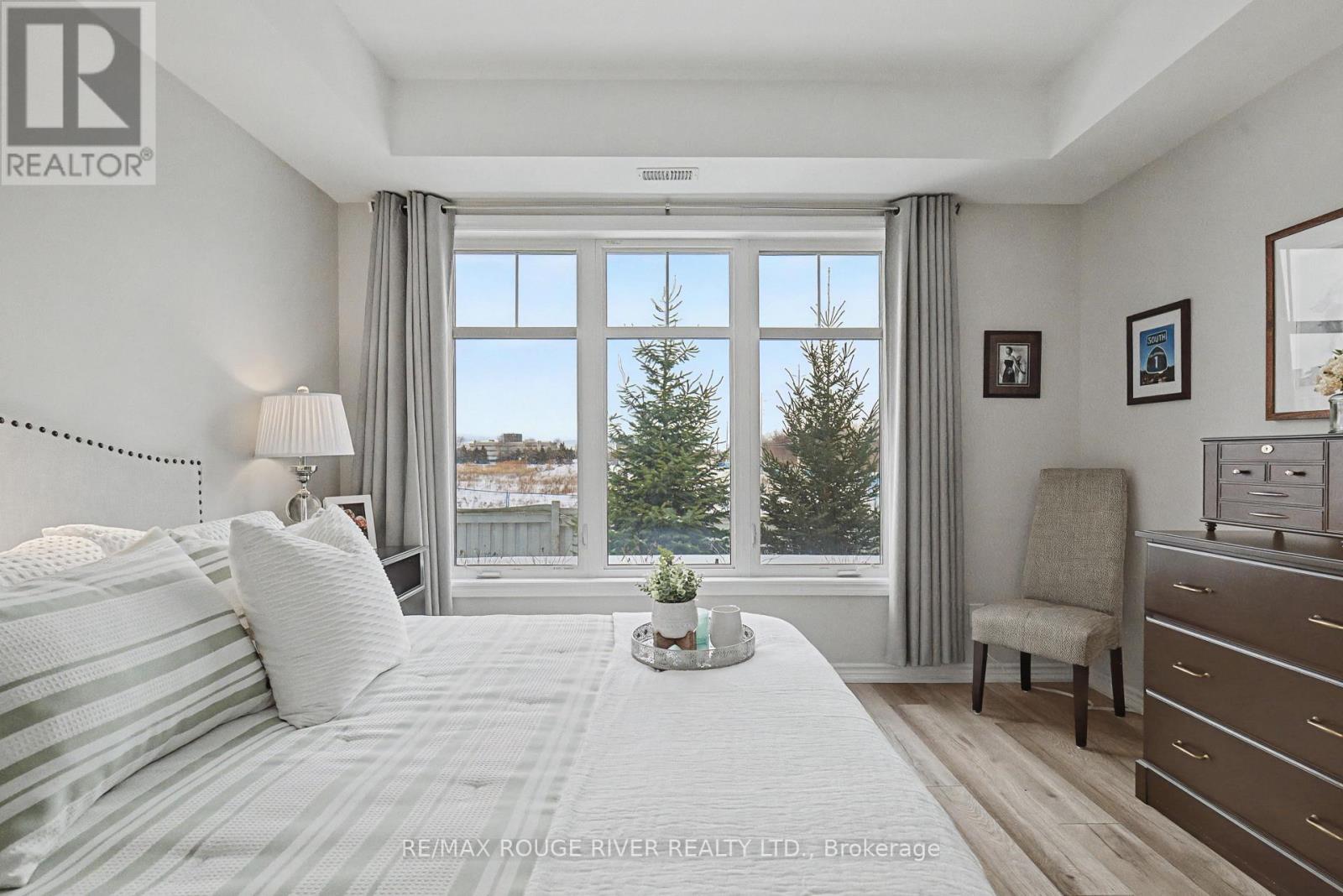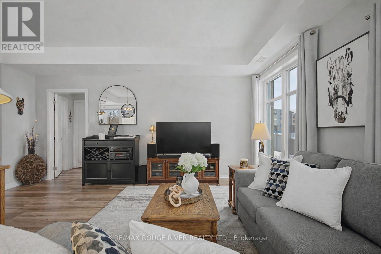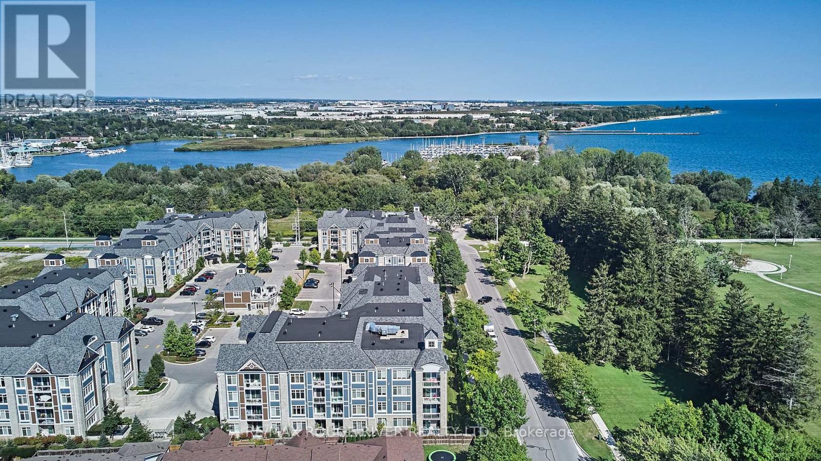 Welcome to Harbourside Condominiums! This beautifully spacious 1,320 sq foot Victoria model includes an impressive 170 sq foot wrap-around corner balcony, ideally situated in the heart of the highly sought after Port Whitby Community. This prestigious Victoria Model offers the largest layout in the building, featuring 2bedrooms plus a den and 2 full bathrooms, thoughtfully designed for both comfort and functionality. The open concept living/dining area is enhanced by 9 foot smooth coffered ceilings, modern lighting and luxury vinyl flooring throughout. Expansive windows fill the space with natural light and provide serene, tree lined views from every room! The well designed stylish kitchen boasts gleaming stainless steel appliances, extended premium quartz breakfast bar, upgraded cabinetry, and undermount lighting perfect for everyday living and entertaining! The bedrooms are generously sized, with the Primary suite offering a large walk-in closet and a 4 piece Ensuite. The versatile Den provides the ideal space for a guestroom, home office or private retreat. This property also includes 2 parking spaces and a massive 9'x8' locker providing exceptional convenience and additional storage. Residents will enjoy access to a community clubhouse and BBQ's, perfect for gatherings and private events. Located just steps from waterfront trails, parks, Lake Ontario and minutes from the Go station, shopping, dining and major highways. This home offers the perfect balance of lifestyle, accessibility, comfort and location! (id:4555)