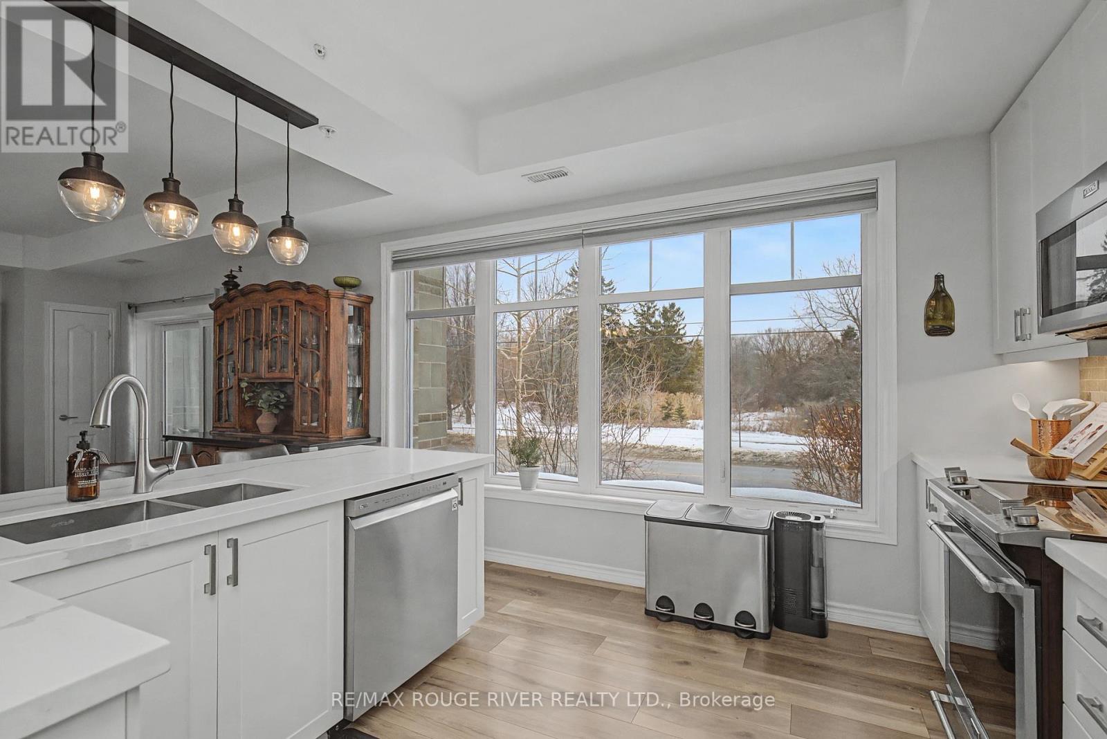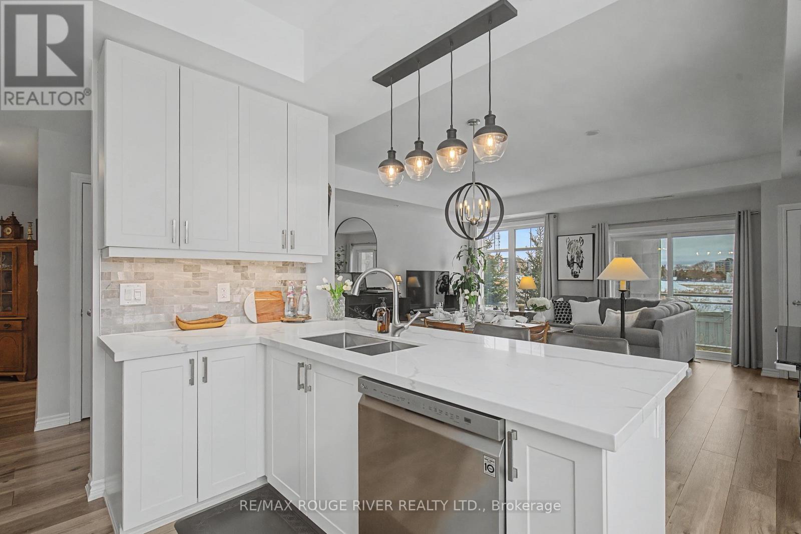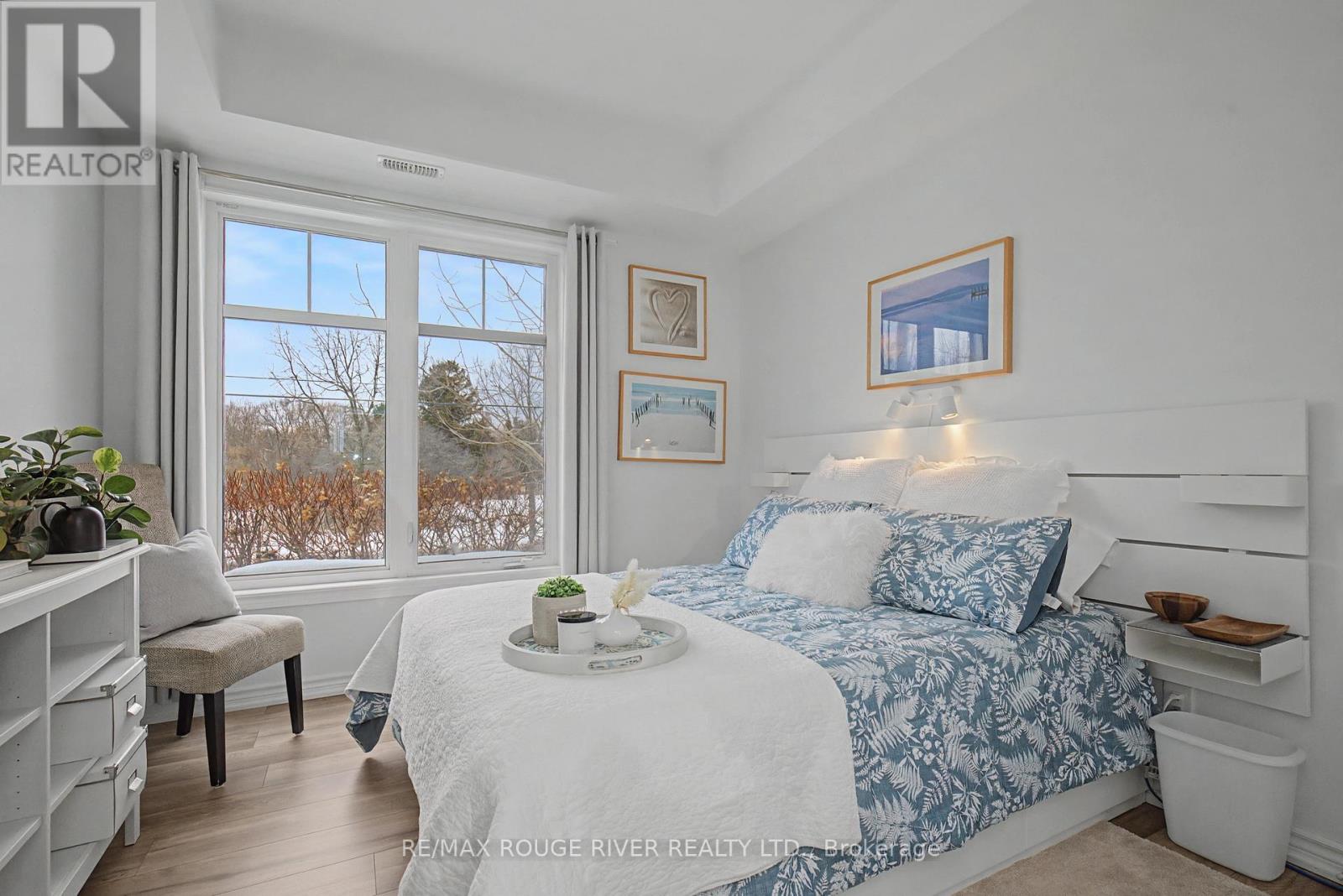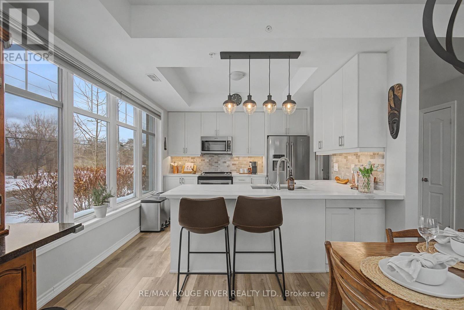 Welcome to Harbourside Condominiums! This beautifully spacious 1,320 sq foot Victoria model includes an impressive 170 sq foot wrap-around corner balcony, ideally situated in the heart of the highly sought after Port Whitby Community. This prestigious Victoria Model offers the largest layout in the building, featuring 2bedrooms plus a den and 2 full bathrooms, thoughtfully designed for both comfort and functionality. The open concept living/dining area is enhanced by 9 foot smooth coffered ceilings, modern lighting and luxury vinyl flooring throughout. Expansive windows fill the space with natural light and provide serene, tree lined views from every room! The well designed stylish kitchen boasts gleaming stainless steel appliances, extended premium quartz breakfast bar, upgraded cabinetry, and undermount lighting perfect for everyday living and entertaining! The bedrooms are generously sized, with the Primary suite offering a large walk-in closet and a 4 piece Ensuite. The versatile Den provides the ideal space for a guestroom, home office or private retreat. This property also includes 2 parking spaces and a massive 9'x8' locker providing exceptional convenience and additional storage. Residents will enjoy access to a community clubhouse and BBQ's, perfect for gatherings and private events. Located just steps from waterfront trails, parks, Lake Ontario and minutes from the Go station, shopping, dining and major highways. This home offers the perfect balance of lifestyle, accessibility, comfort and location! (id:4555)