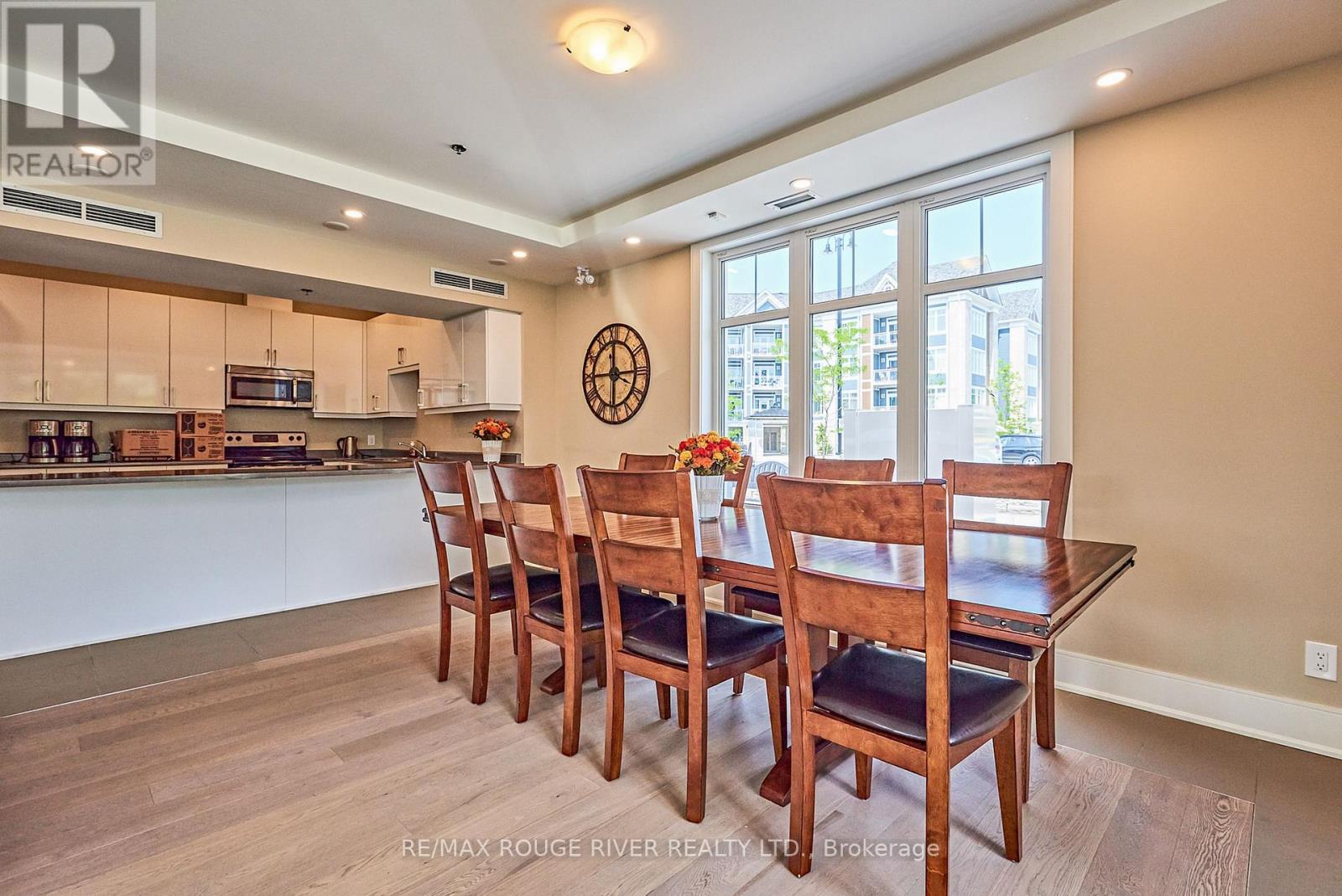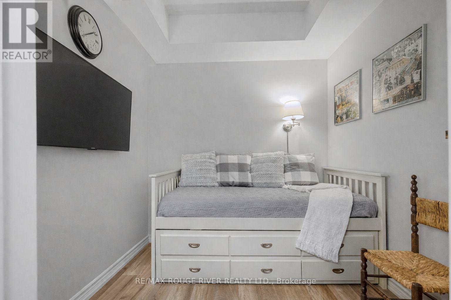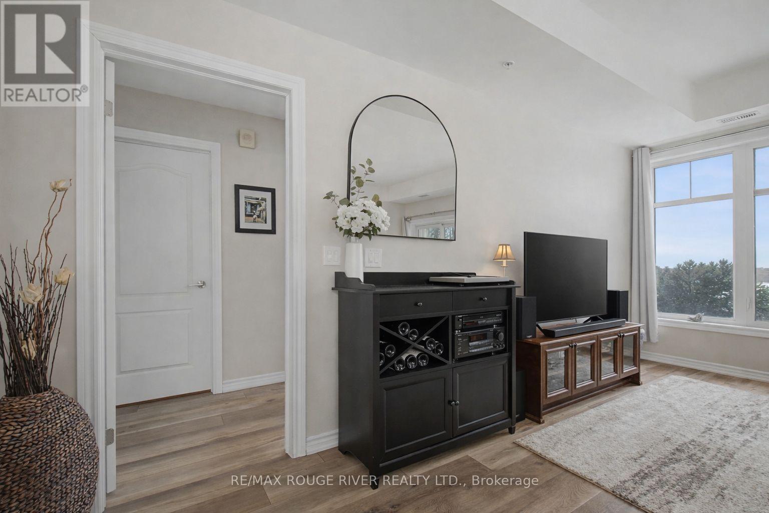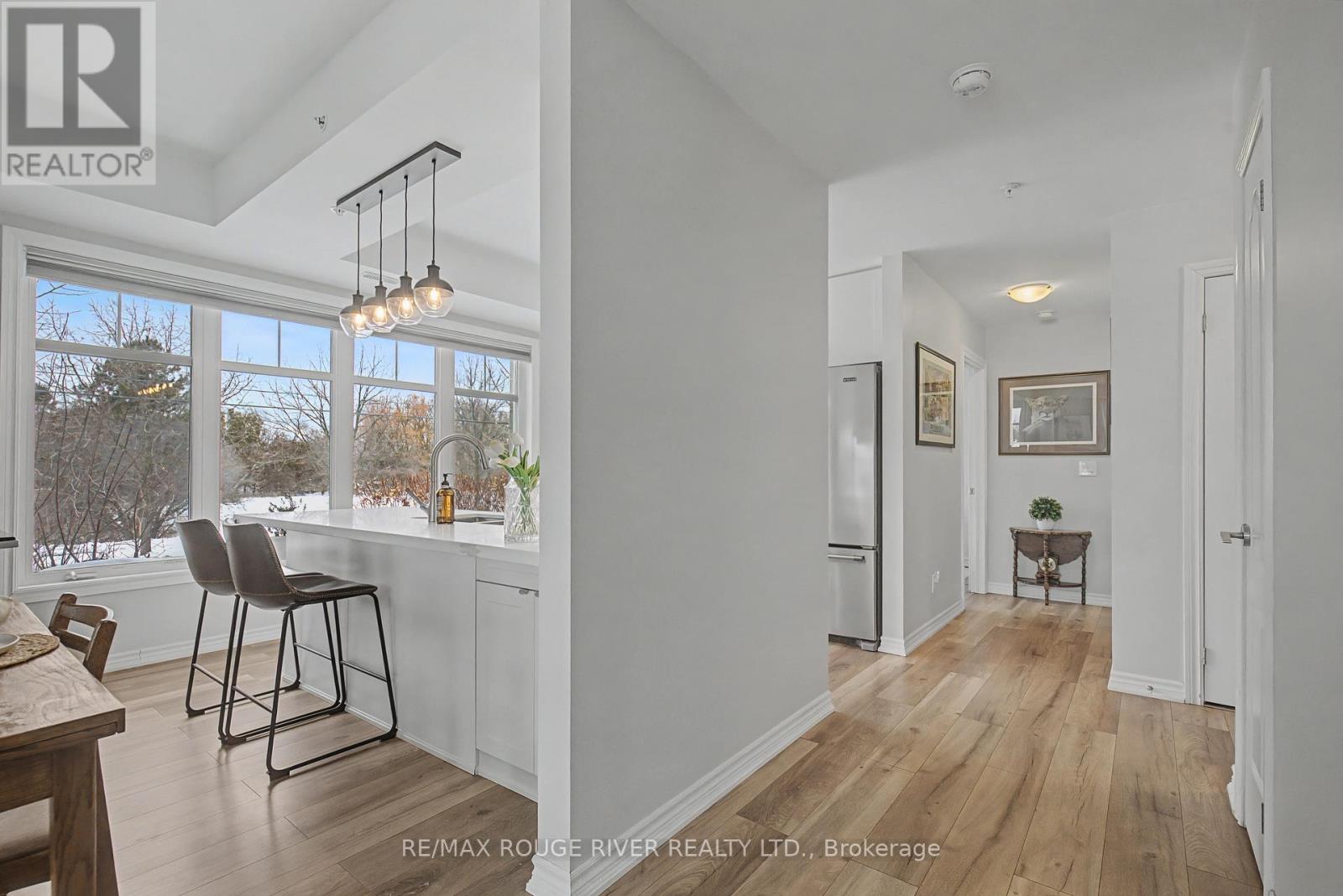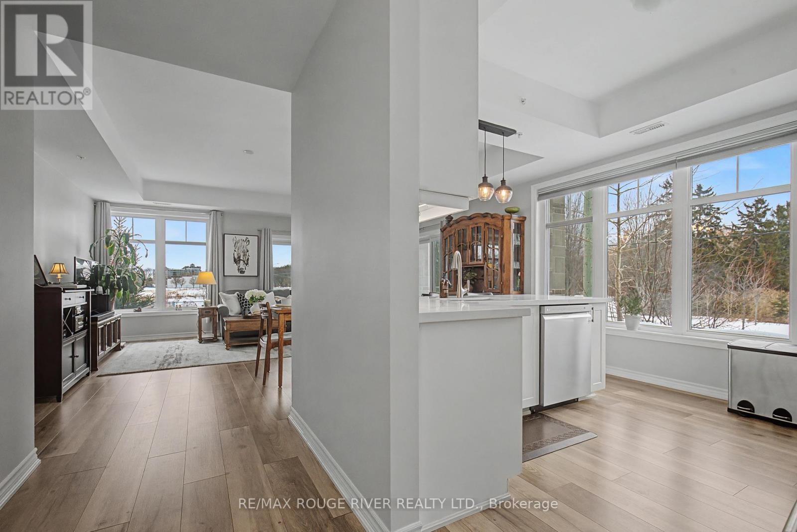Welcome to Harbourside Condominiums! This beautifully spacious 1,320 sq foot Victoria model includes an impressive 170 sq foot wrap-around corner balcony, ideally situated in the heart of the highly sought after Port Whitby Community. This prestigious Victoria Model offers the largest layout in the building, featuring 2bedrooms plus a den and 2 full bathrooms, thoughtfully designed for both comfort and functionality. The open concept living/dining area is enhanced by 9 foot smooth coffered ceilings, modern lighting and luxury vinyl flooring throughout. Expansive windows fill the space with natural light and provide serene, tree lined views from every room! The well designed stylish kitchen boasts gleaming stainless steel appliances, extended premium quartz breakfast bar, upgraded cabinetry, and undermount lighting perfect for everyday living and entertaining! The bedrooms are generously sized, with the Primary suite offering a large walk-in closet and a 4 piece Ensuite. The versatile Den provides the ideal space for a guestroom, home office or private retreat. This property also includes 2 parking spaces and a massive 9'x8' locker providing exceptional convenience and additional storage. Residents will enjoy access to a community clubhouse and BBQ's, perfect for gatherings and private events. Located just steps from waterfront trails, parks, Lake Ontario and minutes from the Go station, shopping, dining and major highways. This home offers the perfect balance of lifestyle, accessibility, comfort and location! (id:4555)