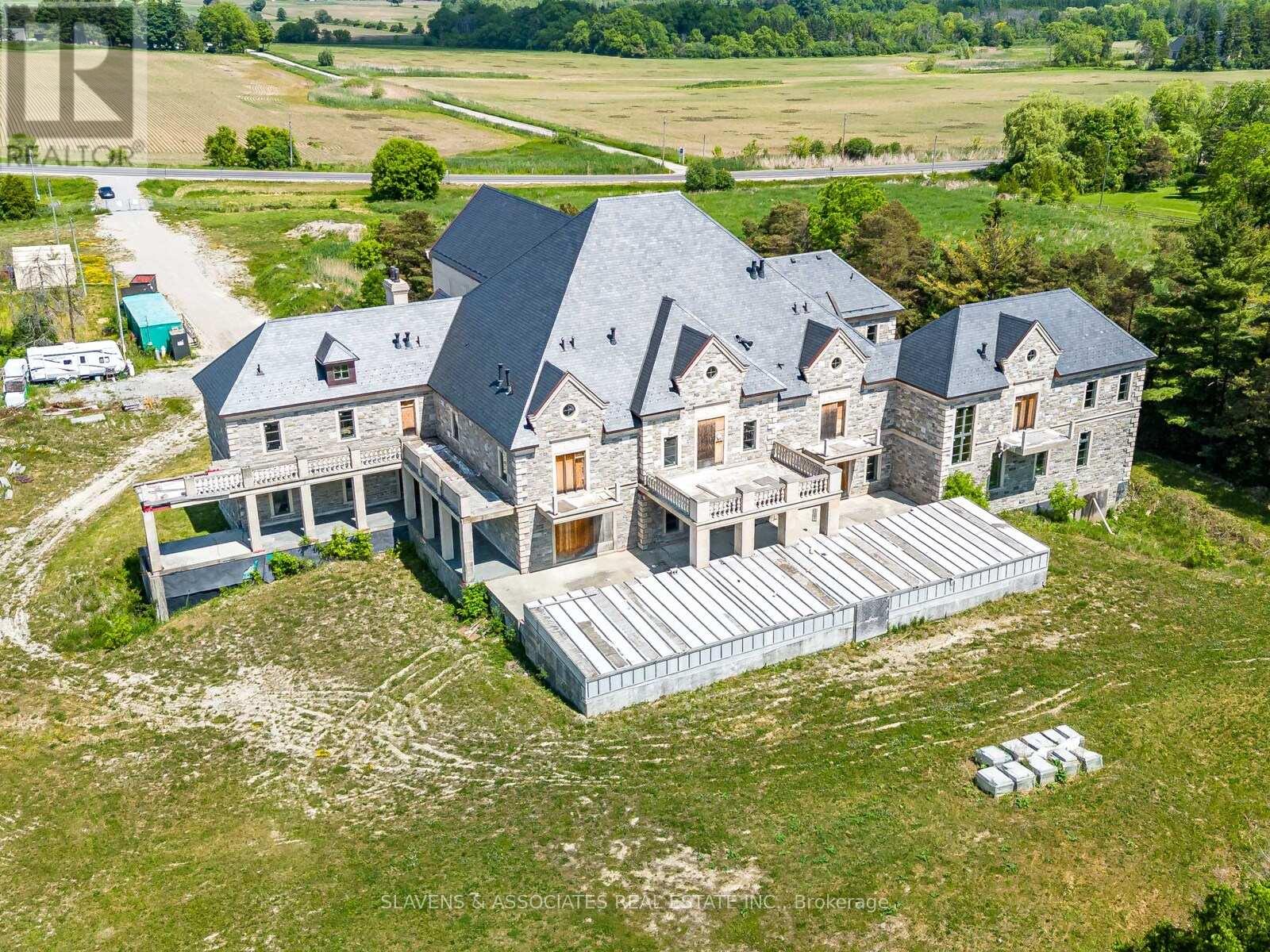 Iconic Masterpiece Ready for Your Vision. An extraordinary opportunity awaits on this sprawling 48.4-acre property to a partially built, 20,000 sq ft unfinished architectural estate home that offers the rare chance to bring your dream residence to life from the ground up. Currently in the pre-drywall phase, this remarkable structure provides the perfect blank canvas to finish and customize every detail to your exact taste. Designed with timeless grandeur in mind, the homes exterior showcases a full stone facade, a stately front porch with a dramatic arched entryway, and large pillars that create an unmistakable sense of arrival. Inside, a spectacular main floor foyer with soaring ceilings sets the tone for the scale and elegance planned throughout the home. The layout includes 8 expansive bedrooms, with most ensuites roughed-in for heated flooring. The future primary suite is designed as a true sanctuary featuring a private walkout terrace, his & hers walk-in closets, and space for an oversized spa-like ensuite. A covered walkout deck from the main floor, a walkout to 1 of 2 triple garages, and thoughtfully planned sightlines add to the homes exceptional flow and function. With residential and commercial zoning, the estate opens the door to a variety of uses whether you envision a luxurious private residence, a family compound, or a live-work lifestyle property with unmatched land value. From the elegant stonework to the expansive footprint, the structure is in place what remains is the opportunity to shape it into something truly iconic. Seize the rare chance to complete a grand estate tailored entirely to your vision. Severance possibility. (id:4555)