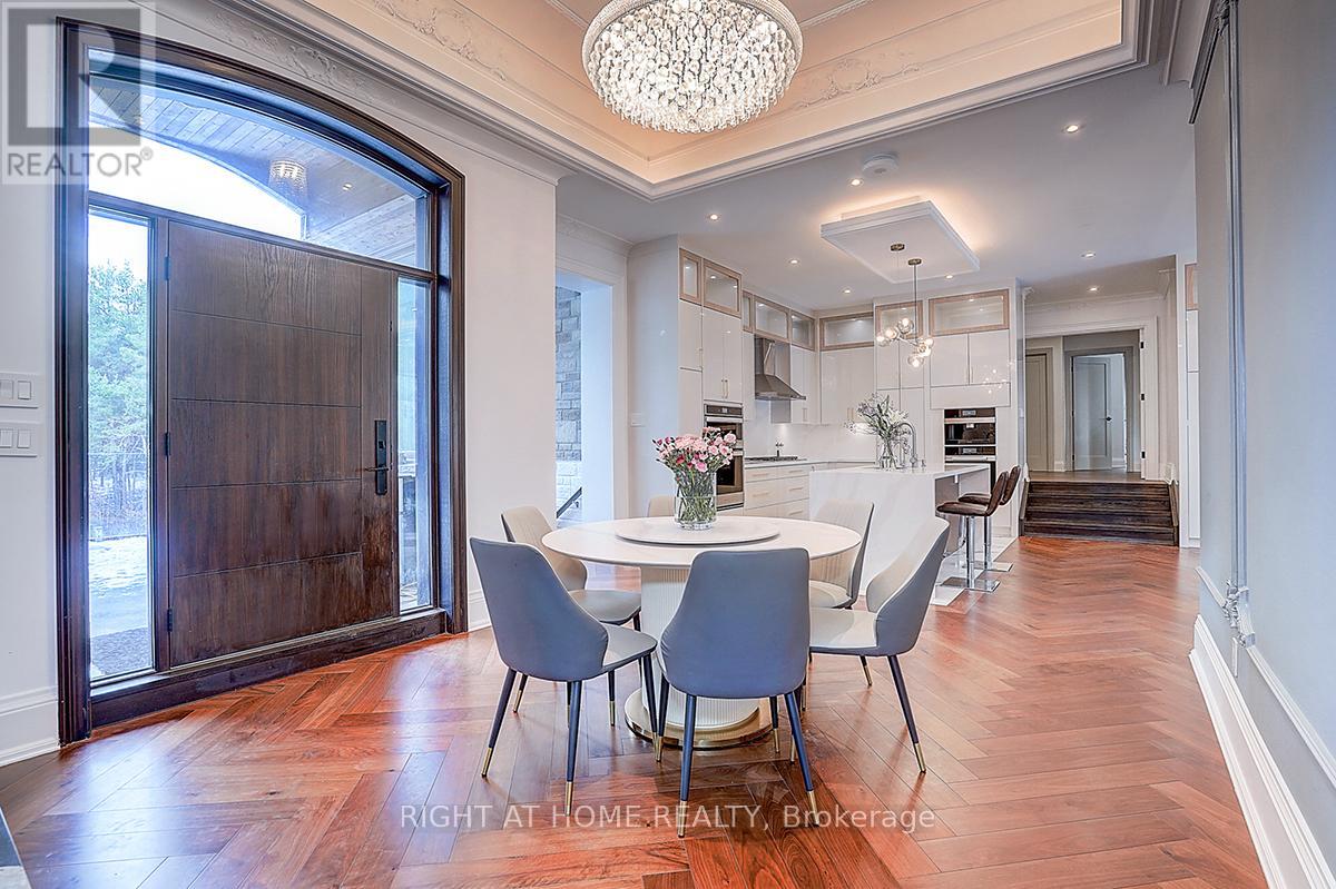 Rare Modern French Luxury Bungalow Estate. A rare offering in today's market, this exceptional Modern French-inspired luxury bungalow redefines high-end living by seamlessly combining estate-level luxury with unparalleled everyday convenience-all on one expansive level.Set on a 2-acre private lot backing onto an endless forest, the home welcomes you with a crescent-shaped driveway and refined architectural detailing. Inside 12' ceiling (Main), solid walnut chevron flooring, custom plaster wall trims, medallion ceilings, and a dramatic floating marble TV and fireplace wall reflect timeless Modern French craftsmanship.The gourmet kitchen is fully equipped with elite appliances, including a 72" see-through Sub-Zero refrigerator and freezer, Wolf gas cooktop, and Miele built-in coffee machine, steam oven, and dishwasher-designed to elevate daily living hile supporting effortless entertaining.The main-level primary suite offers a true spa retreat, featuring a luxury ensuite bathroom with wet sauna, premium fixtures, and smart toilets that enhance comfort and hygiene throughout. An elegant entryway with floating custom cabinetry provides discreet and functional storage.What truly sets this bungalow apart is its fully developed 3,000-square-foot lower level, thoughtfully designed for both lifestyle and recreation. It includes a professional dance studio (10'), gym, walk-in temperature-controlled wine cellar, traditional wood sauna, snooker area, private Home Threater, and an additional ensuite bedroom-ensuring space for every passion without sacrificing main-floor convenience. The three-car garage features a golf simulator room and an upper loft offering exceptional flexibility. Outdoor living is elevated with a super-sized concrete rooftop deck, creating a four-season retreat surrounded by nature. An extended concrete driveway into the backyard further enhances functionality and scale. (id:4555)