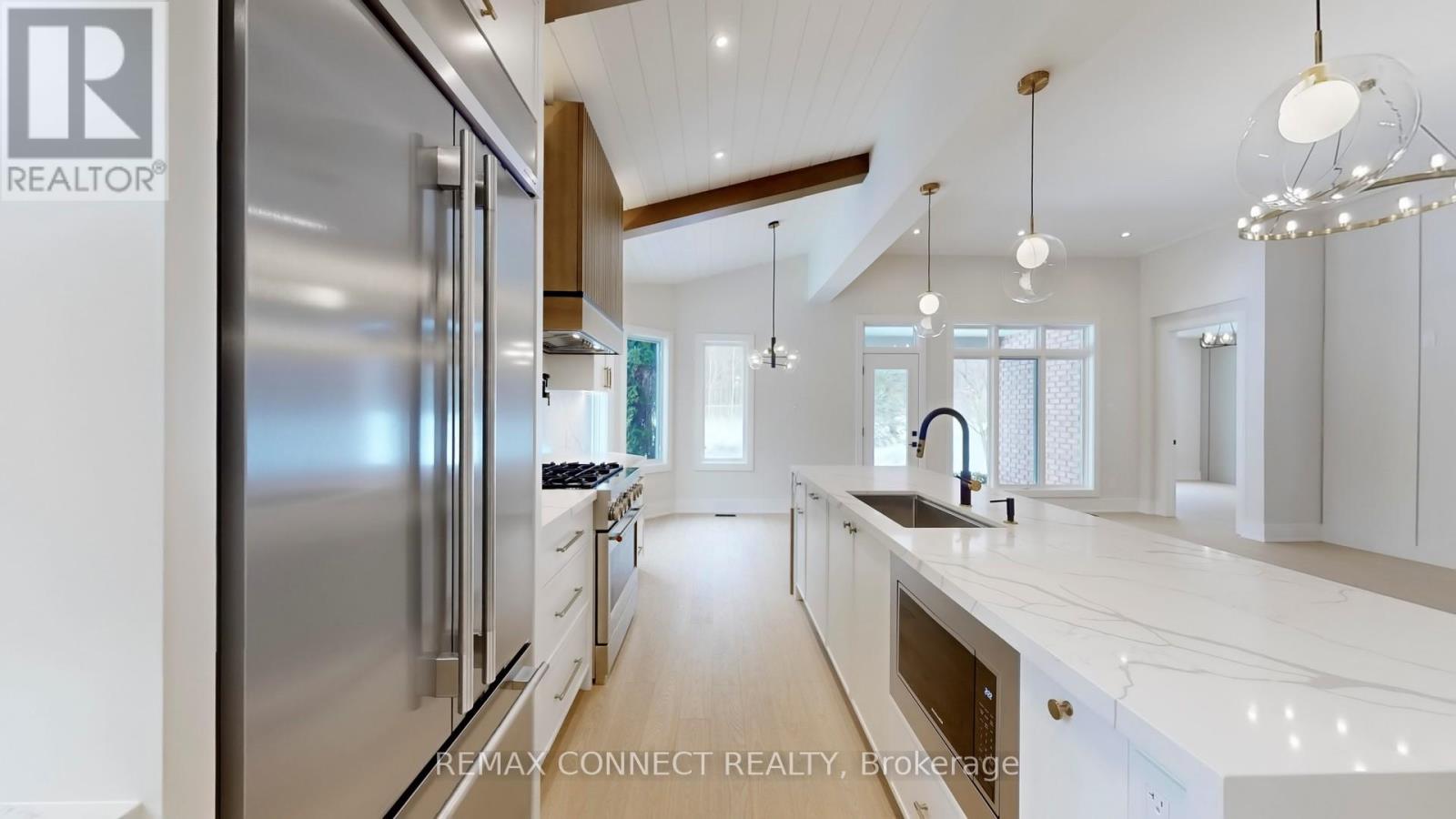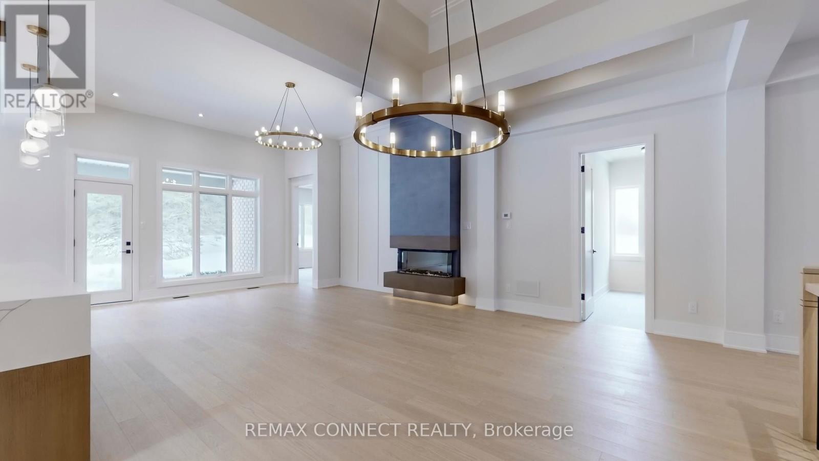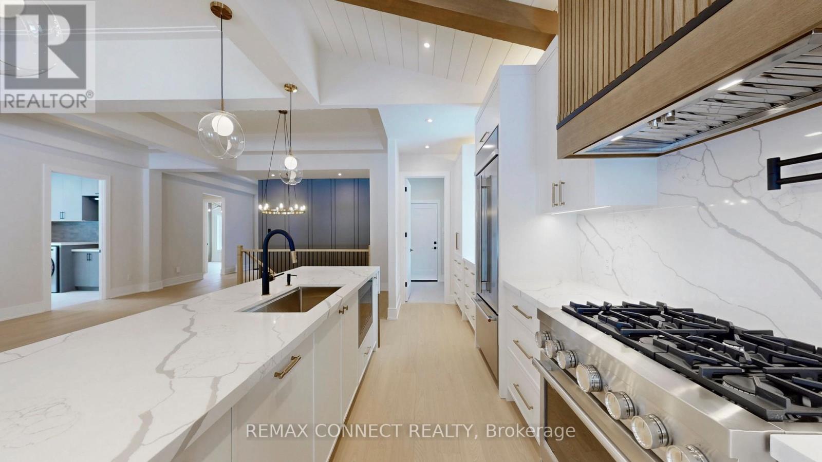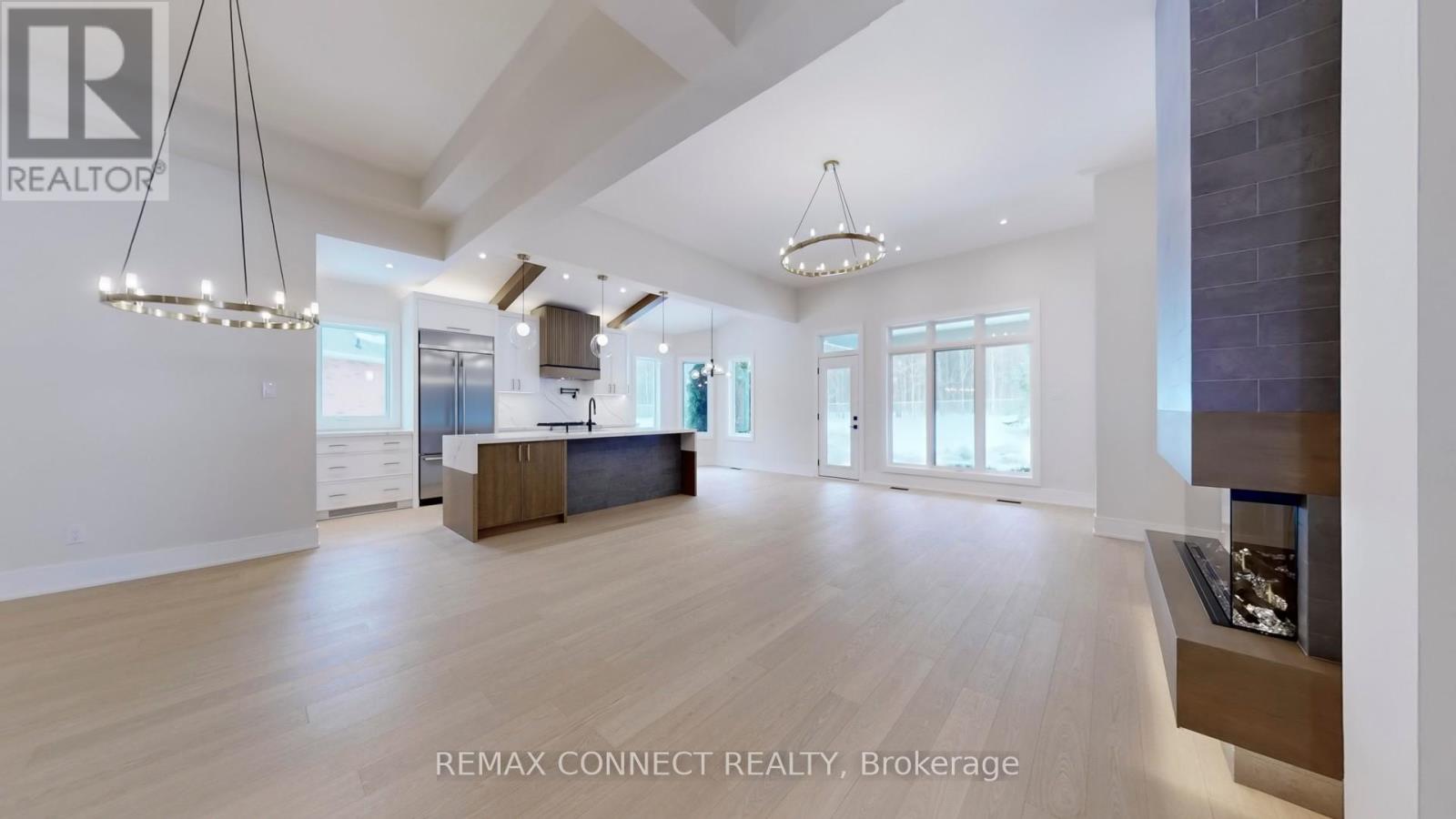 This fully renovated home offers a rare combination of craftsmanship and contemporary design. Beautiful Castle Pines model with modified layout is 1855 sq. ft. Updates include new hardwood flooring throughout, custom kitchen that boasts soft white cabinetry with oak accents, built-in appliances, and a unique waterfall island with breakfast bar, quartz countertops and backsplash. Beamed ceilings and a cozy eating area make this kitchen spectacular. All this overlooks the beautiful living room/dining room with floor to 11' ceiling 3-sided Dimplex fireplace, stylish feature walls, open oak and wrought iron staircase to the basement, designer light fixtures, and moulded ceilings. The primary bedroom has beamed ceilings and a beautiful feature wall. The redesigned ensuite & dressing area is a show stopper, complete with freestanding tub, huge custom shower with niche and recessed lighting, double sinks, and beautiful oak vanity. The dressing area is completely built in with interior lighting. A bright and spacious main floor laundry has loads of cupboards, laundry tub, quartz counters and pantry. The separate mudroom has built-in cabinetry with a bench and plenty of storage, and easy access to the garage. A fully finished basement adds extra living space with a large recreation room, 3 piece bath and bonus room for an office, crafts or playroom. New stylish exterior doors. All new interior doors that have been raised to 90". All new trim and baseboards, smooth ceilings, upgrades to electrical. Undermount lighting on all cabinetry. No detail has been left untouched. The backyard is one of the most private and largest in the community. The huge pie lot backs onto the forest, with a side view of the golf course, all on a quiet cul-de-sac with quick easy access to Ninth Line. (id:4555)
