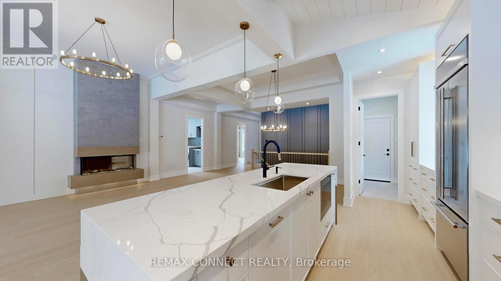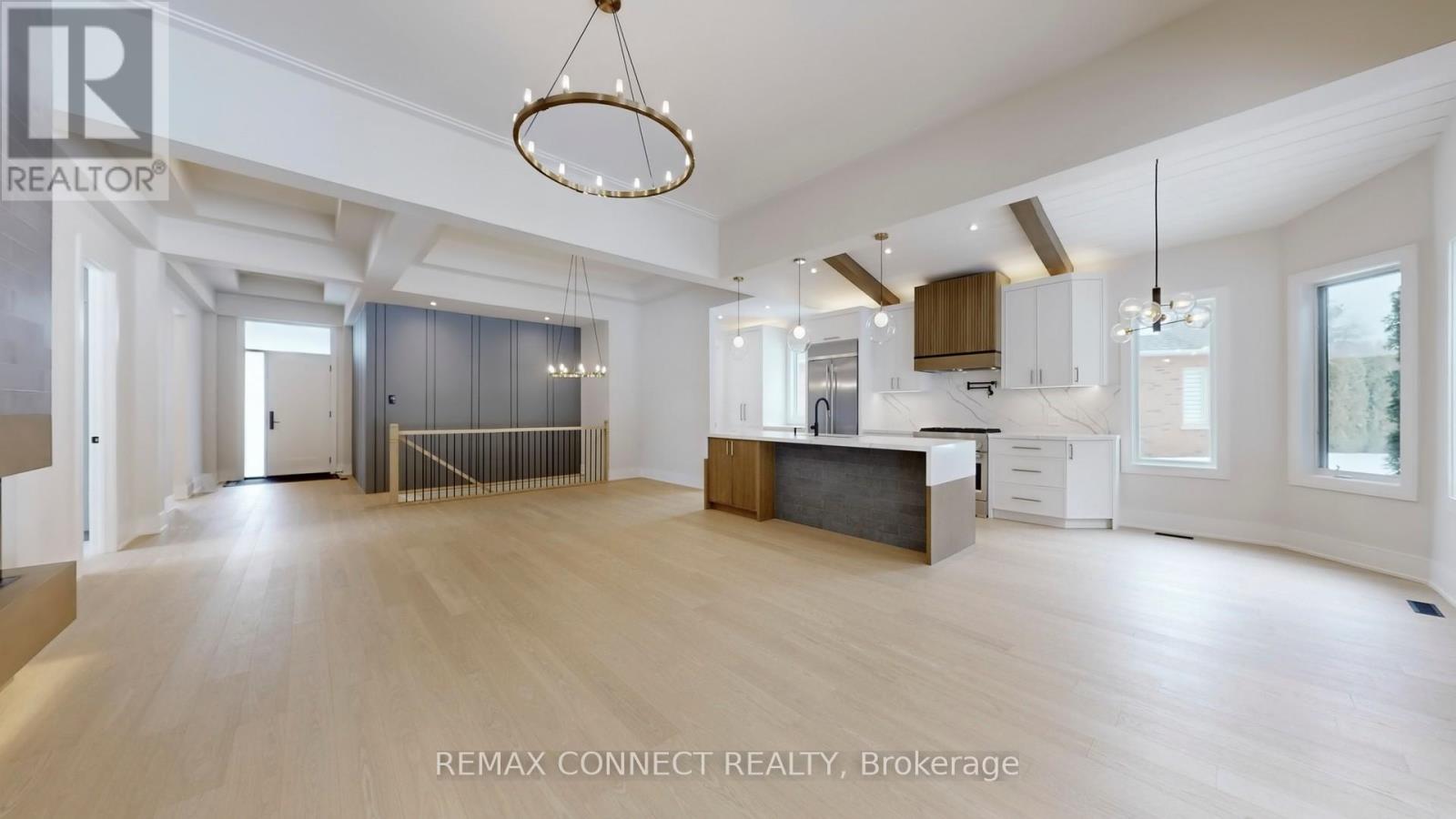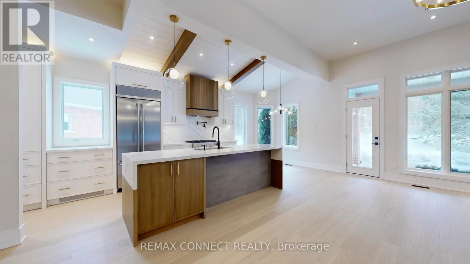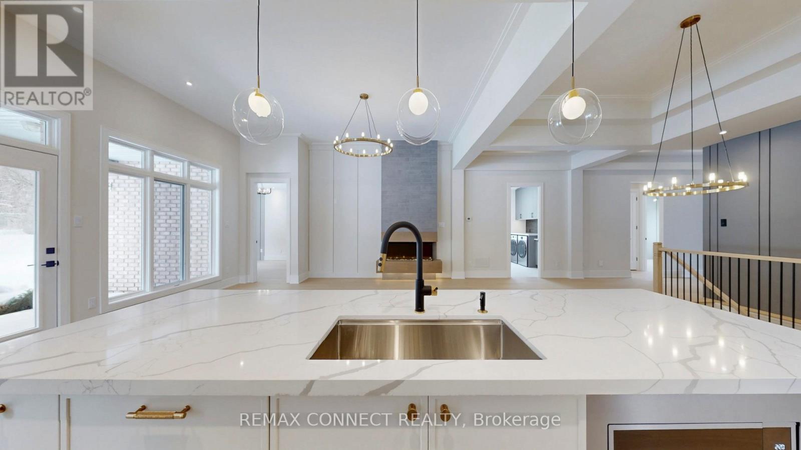 This fully renovated home offers a rare combination of craftsmanship and contemporary design. Beautiful Castle Pines model with modified layout is 1855 sq. ft. Updates include new hardwood flooring throughout, custom kitchen that boasts soft white cabinetry with oak accents, built-in appliances, and a unique waterfall island with breakfast bar, quartz countertops and backsplash. Beamed ceilings and a cozy eating area make this kitchen spectacular. All this overlooks the beautiful living room/dining room with floor to 11' ceiling 3-sided Dimplex fireplace, stylish feature walls, open oak and wrought iron staircase to the basement, designer light fixtures, and moulded ceilings. The primary bedroom has beamed ceilings and a beautiful feature wall. The redesigned ensuite & dressing area is a show stopper, complete with freestanding tub, huge custom shower with niche and recessed lighting, double sinks, and beautiful oak vanity. The dressing area is completely built in with interior lighting. A bright and spacious main floor laundry has loads of cupboards, laundry tub, quartz counters and pantry. The separate mudroom has built-in cabinetry with a bench and plenty of storage, and easy access to the garage. A fully finished basement adds extra living space with a large recreation room, 3 piece bath and bonus room for an office, crafts or playroom. New stylish exterior doors. All new interior doors that have been raised to 90". All new trim and baseboards, smooth ceilings, upgrades to electrical. Undermount lighting on all cabinetry. No detail has been left untouched. The backyard is one of the most private and largest in the community. The huge pie lot backs onto the forest, with a side view of the golf course, all on a quiet cul-de-sac with quick easy access to Ninth Line. (id:4555)