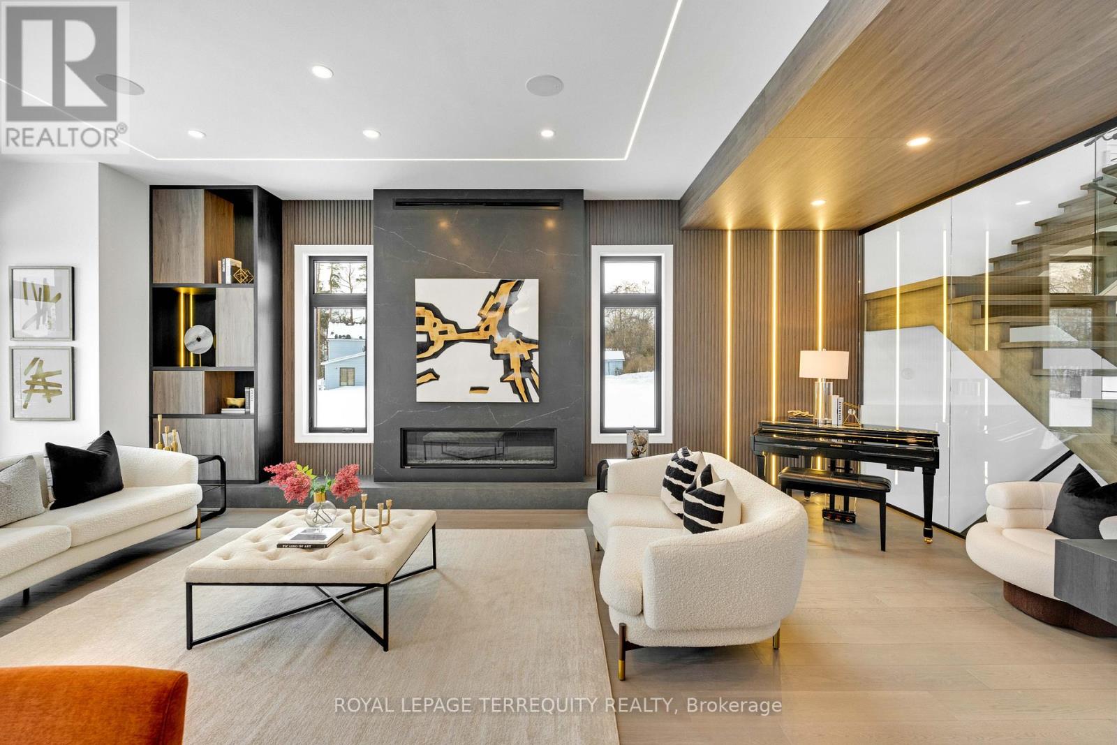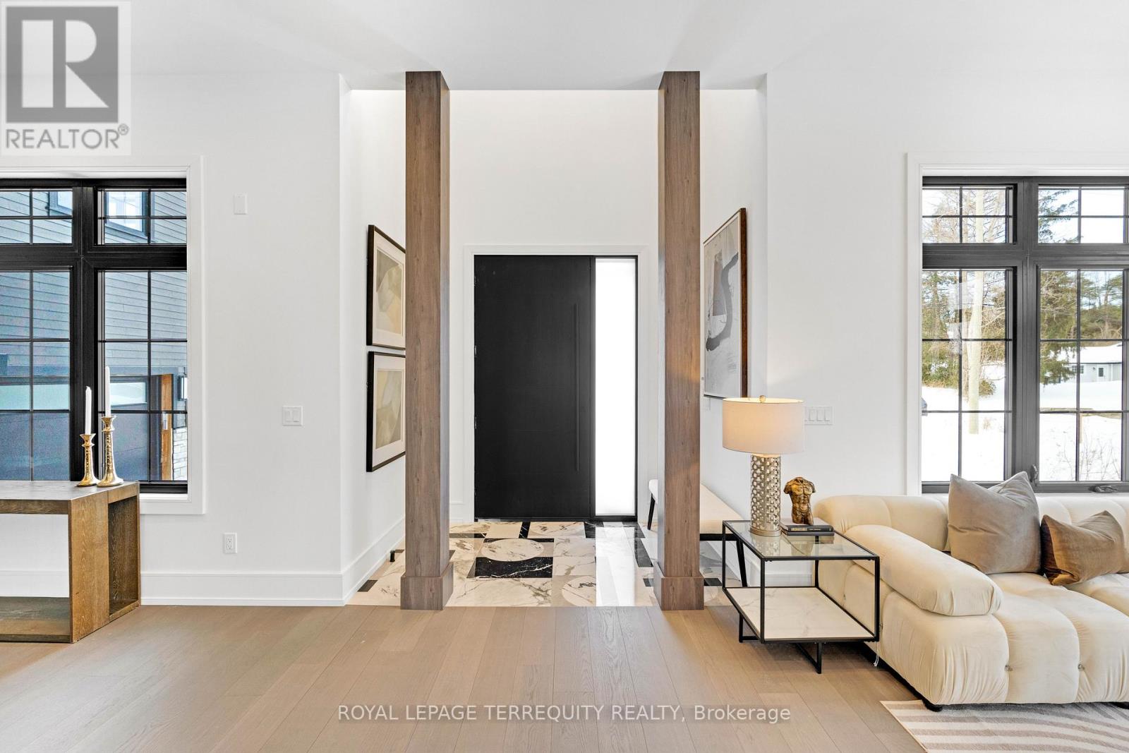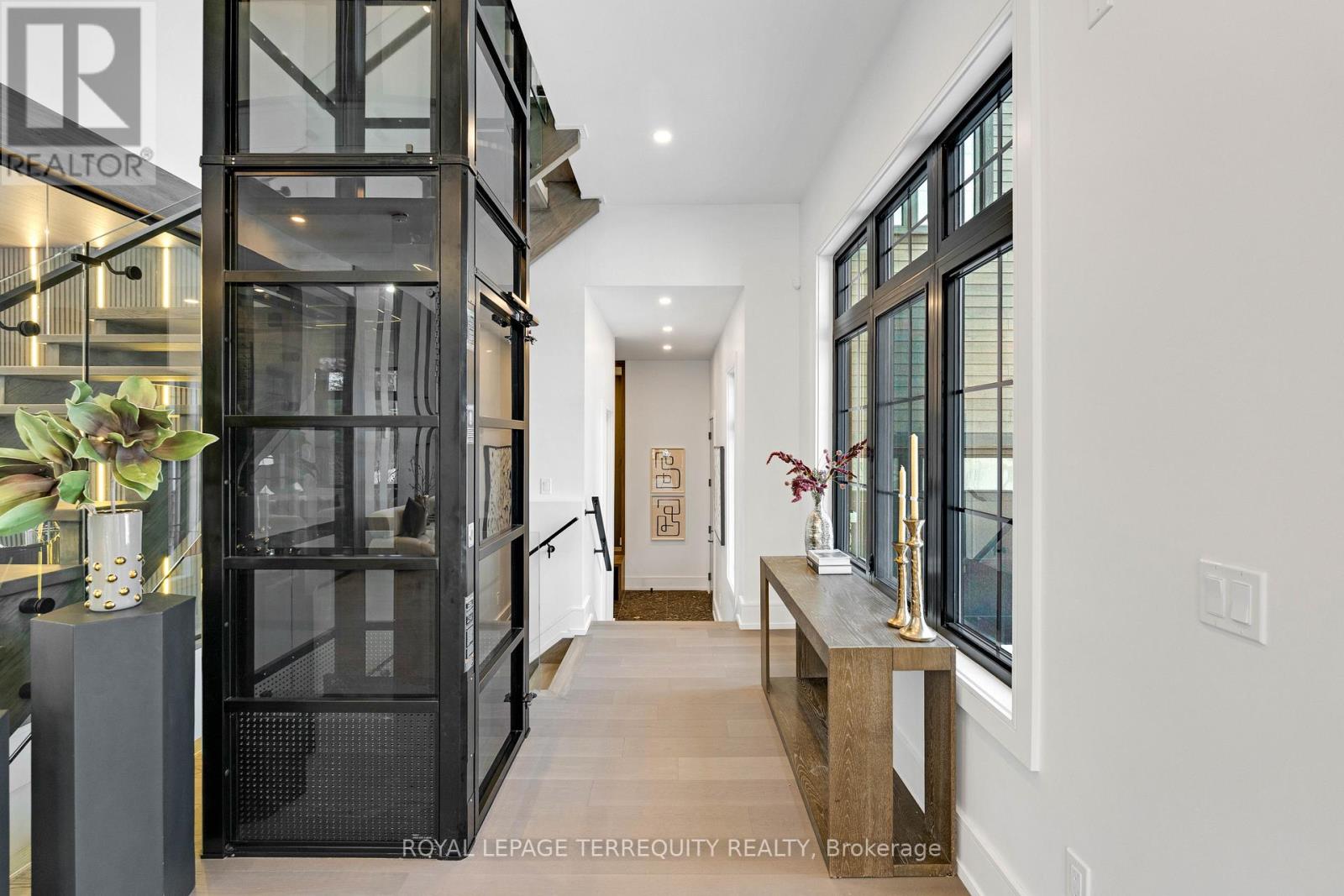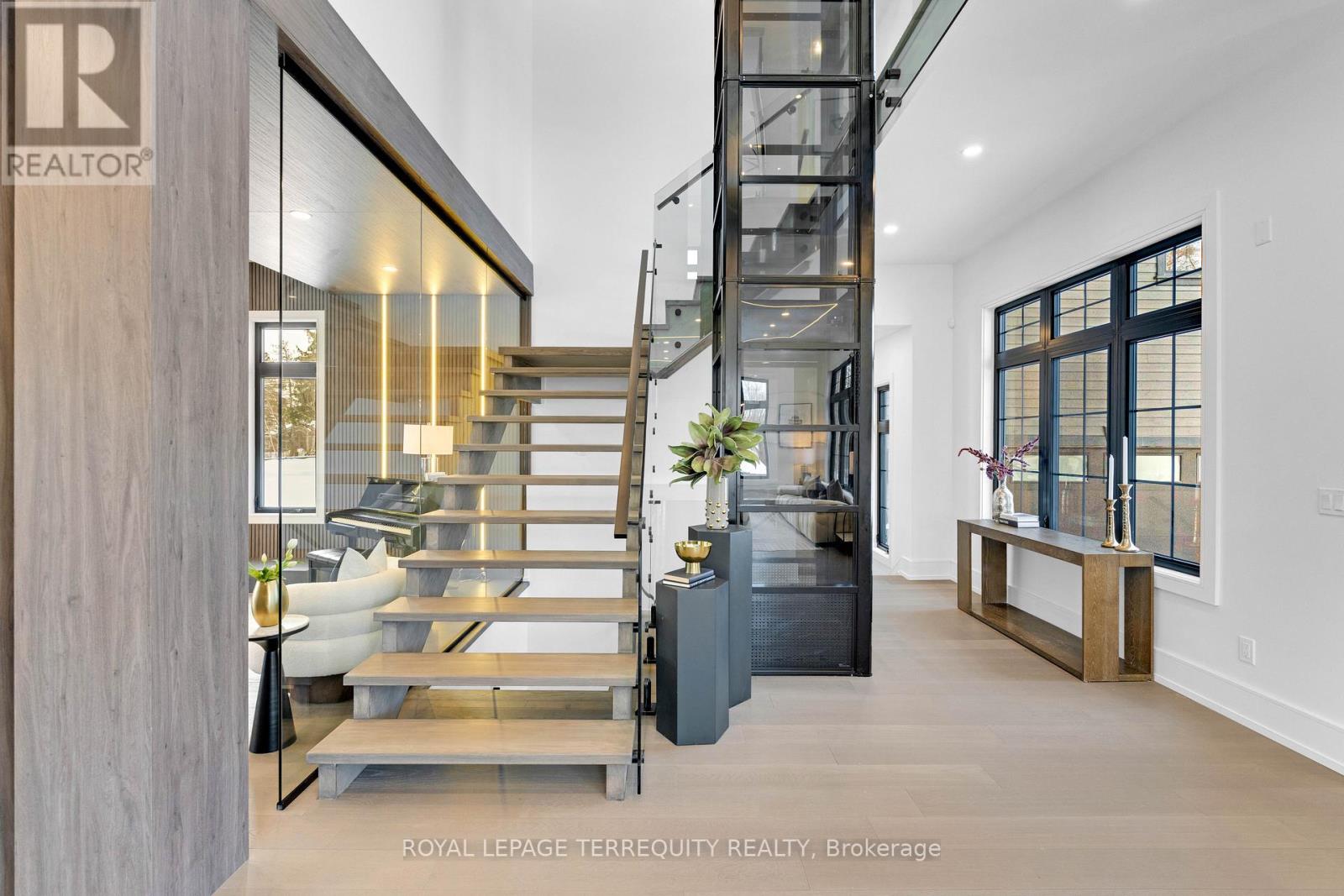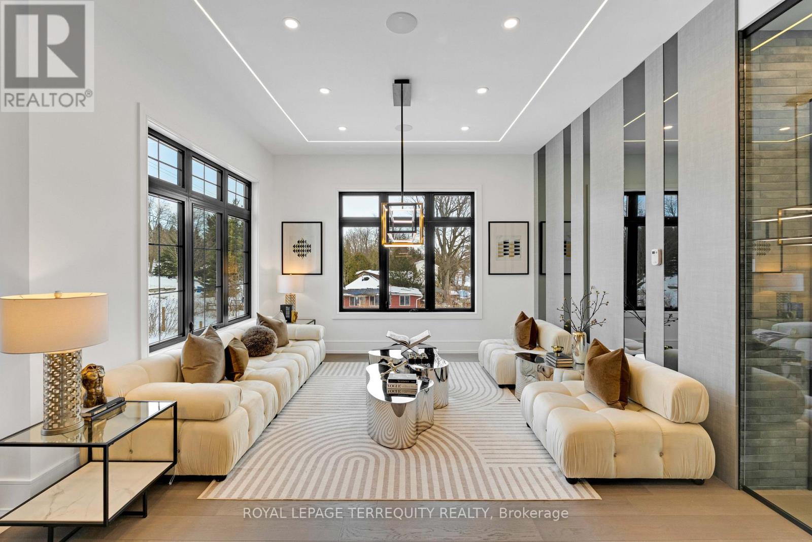 An extraordinary waterfront offering, this residence exemplifies architectural presence and timeless lakeside luxury. Peacefully positioned along 100+ feet of prime shoreline and set on an expansive 214 x 349 ft lot, this one-of-a-kind property blends refined sophistication with serene natural beauty, creating a seamless indoor-outdoor living experience. Thoughtfully designed with wide-plank hardwood flooring, custom millwork, and curated designed finishes, the home features flowing principal spaces enhanced by integrated LED ceiling details and statement lighting. A striking glass elevator adds both convenience and architectural presence, reinforcing the home's elevated design. This open-concept kitchen is a true showpiece, wrapped in premium stone surfaces and bespoke cabinetry, and equipped with top-tier paneled appliances. Designed for effortless entertaining and elevated everyday living, it anchors the home with both function and refined style. Offering 4 spacious bedrooms and 4 beautifully appointed bathrooms, the residence delivers comfort, privacy, and exceptional craftsmanship throughout. The primary suite serves as a private retreat with a generously scaled, spa-inspired ensuite finished with luxurious details and premium fixtures. A large loft above the garage, complete with a rough-in for an additional washroom, provides outstanding flexibility for future expansion-ideal for a guest suite, studio, or multigenerational living. The 3-car garage with car lift further enhances the home's rarity. Beyond its architectural elegance, the property presents significant long-term value with an approved severance application (with conditions), offering the opportunity to build an additional residence. A rare offering defined by scale, craftsmanship, and a level of finish seldom seen on the market. (id:4555)