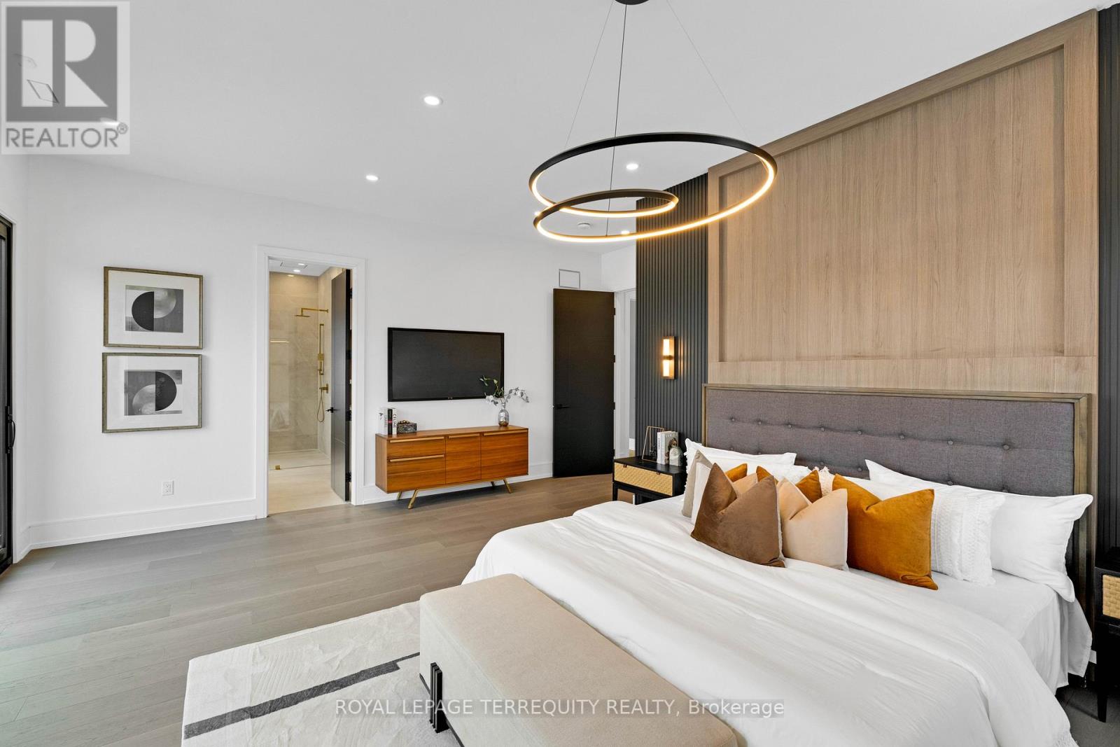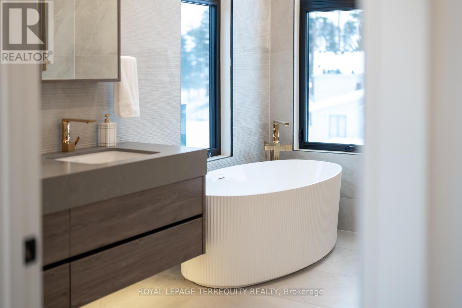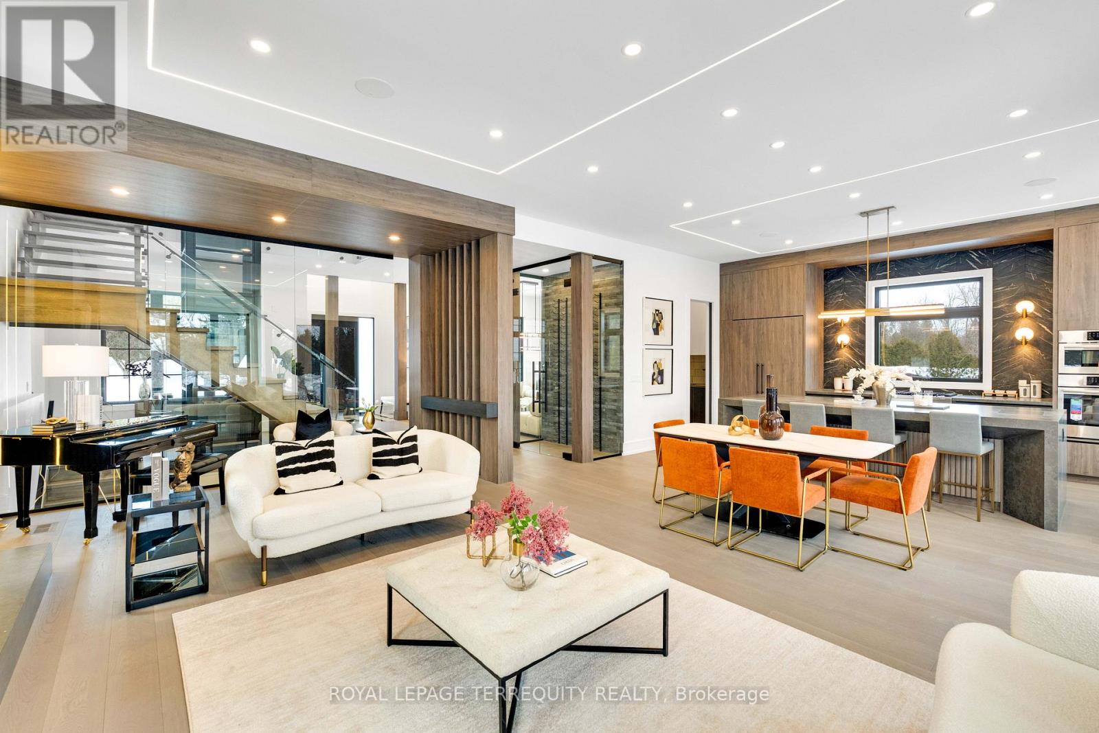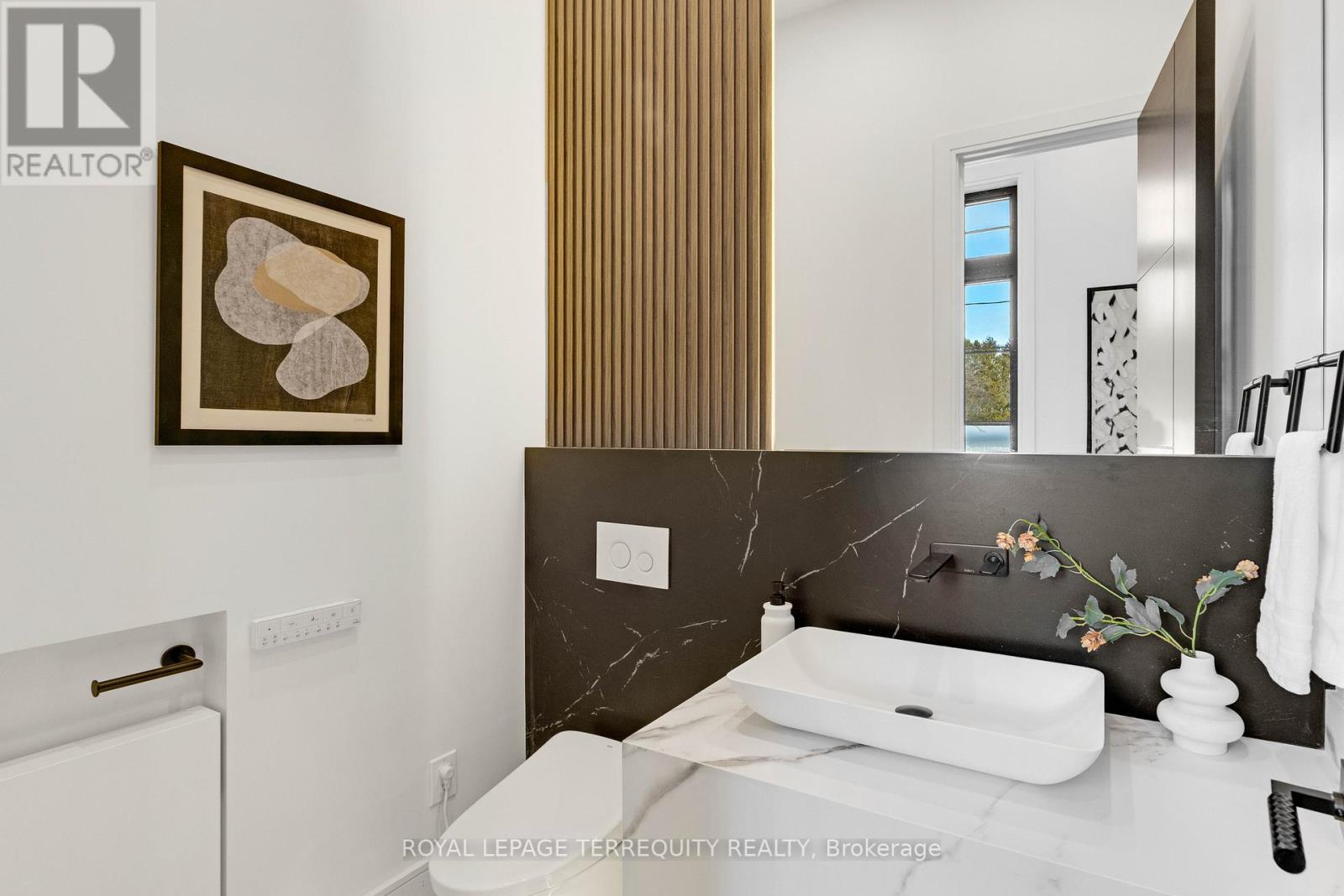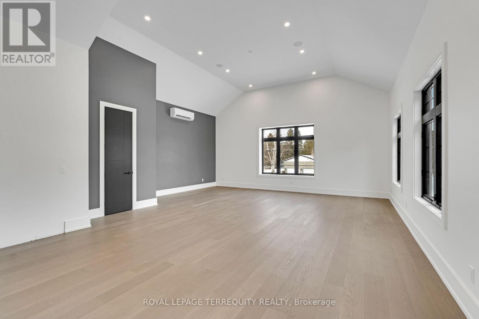 An extraordinary waterfront offering, this residence exemplifies architectural presence and timeless lakeside luxury. Peacefully positioned along 100+ feet of prime shoreline and set on an expansive 214 x 349 ft lot, this one-of-a-kind property blends refined sophistication with serene natural beauty, creating a seamless indoor-outdoor living experience. Thoughtfully designed with wide-plank hardwood flooring, custom millwork, and curated designed finishes, the home features flowing principal spaces enhanced by integrated LED ceiling details and statement lighting. A striking glass elevator adds both convenience and architectural presence, reinforcing the home's elevated design. This open-concept kitchen is a true showpiece, wrapped in premium stone surfaces and bespoke cabinetry, and equipped with top-tier paneled appliances. Designed for effortless entertaining and elevated everyday living, it anchors the home with both function and refined style. Offering 4 spacious bedrooms and 4 beautifully appointed bathrooms, the residence delivers comfort, privacy, and exceptional craftsmanship throughout. The primary suite serves as a private retreat with a generously scaled, spa-inspired ensuite finished with luxurious details and premium fixtures. A large loft above the garage, complete with a rough-in for an additional washroom, provides outstanding flexibility for future expansion-ideal for a guest suite, studio, or multigenerational living. The 3-car garage with car lift further enhances the home's rarity. Beyond its architectural elegance, the property presents significant long-term value with an approved severance application (with conditions), offering the opportunity to build an additional residence. A rare offering defined by scale, craftsmanship, and a level of finish seldom seen on the market. (id:4555)