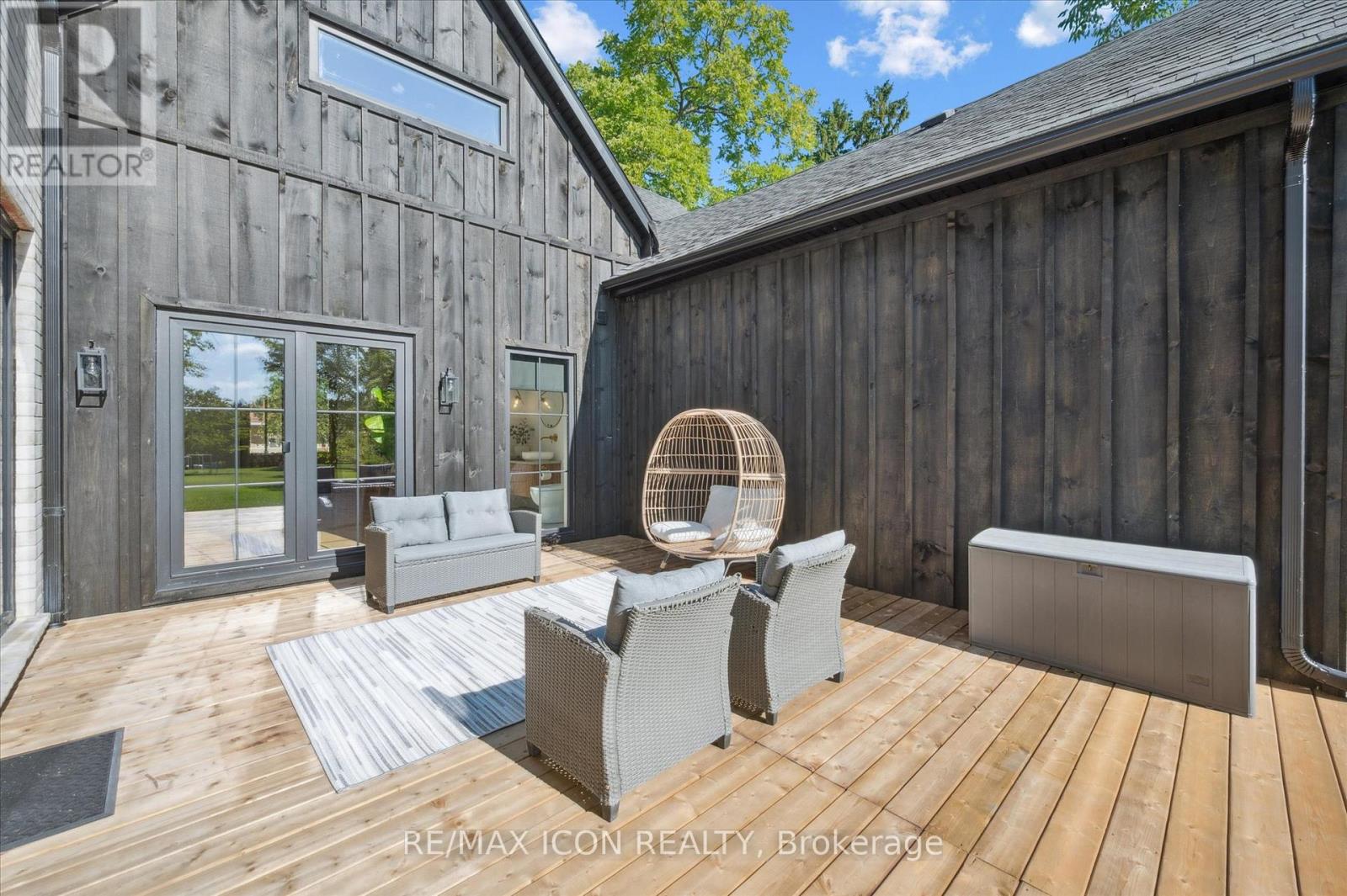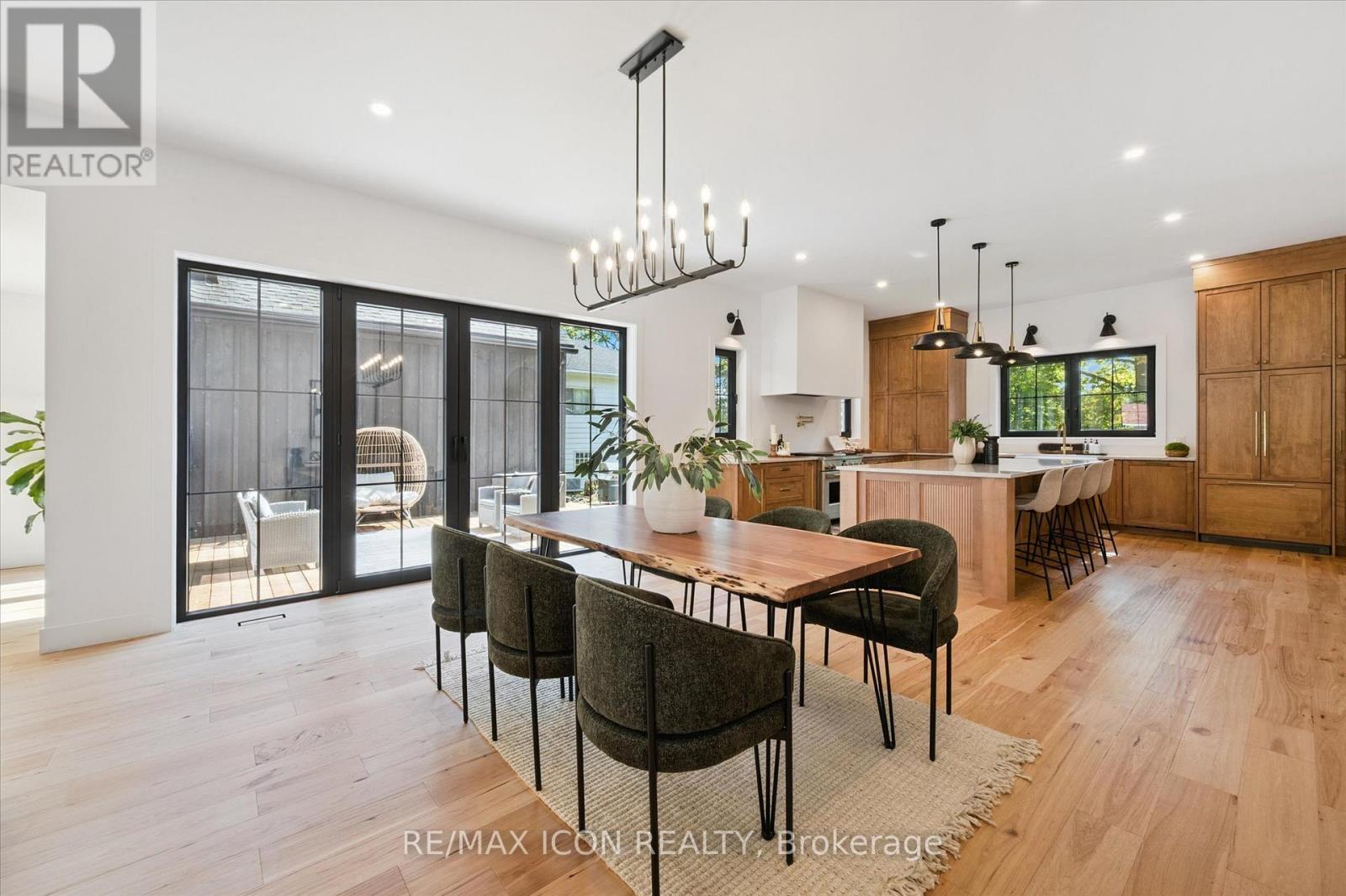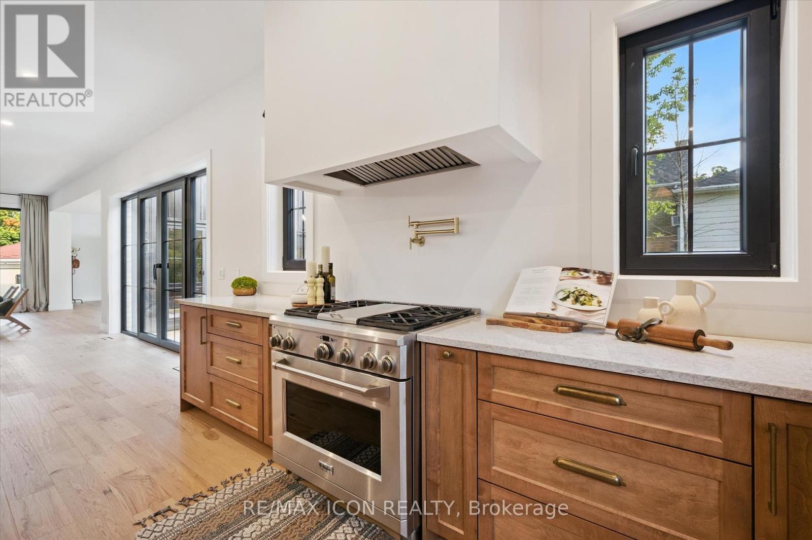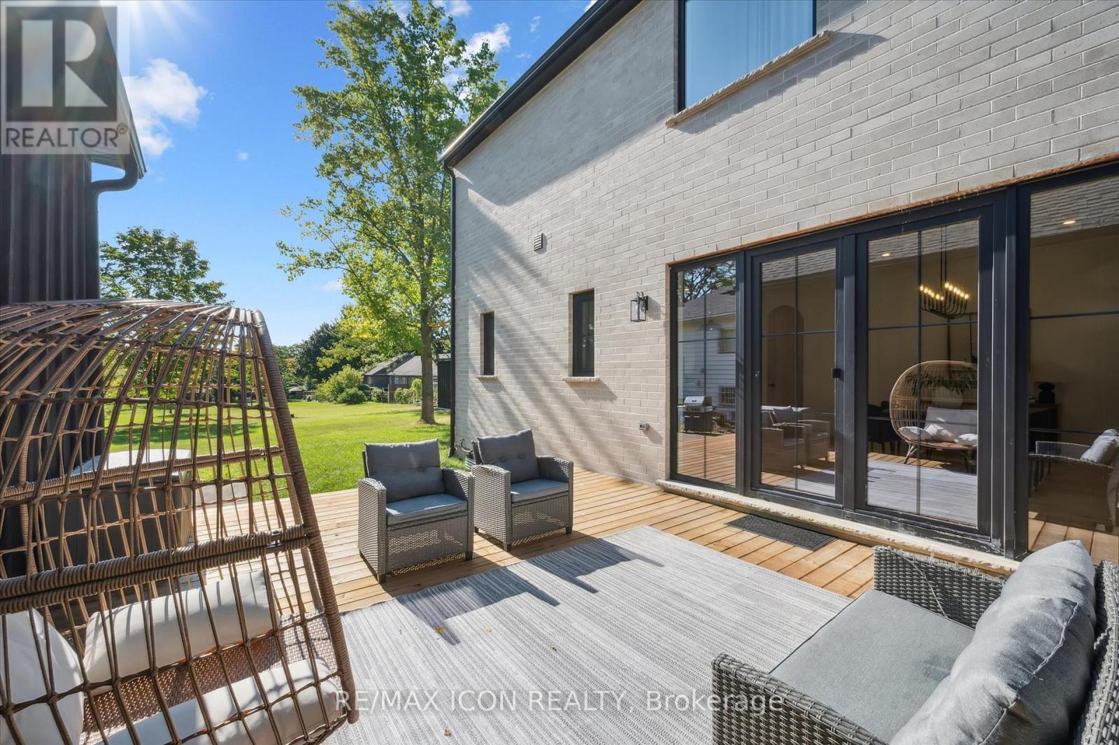 Welcome to 413 Huron Road in charming New Hamburg! A truly exceptional 5-bedroom, 4-bathroom home offering over 4,400 sq. ft. of finishedliving space, where thoughtful design meets high-end finishes and timeless craftsmanship. The exterior blends timeless materials like stone,brick, and barn board for a striking curb appeal, complemented by a concrete driveway with integrated drainage and underground downspoutmanagement. Inside, the home is flooded with natural light thanks to oversized Raven European tilt/turn windows, which beautifully highlight theneutral tones, organic finishes, and natural hickory engineered hardwood throughout. The heart of the home is the handcrafted maple kitchenand adjoining butlers pantry, featuring a Monogram gas oven/range, built-in 36 Fisher & Paykel fridge and dishwasher, an apron sink, andample storage, ideal for everyday living and entertaining alike. A separate entrance leads to a private granny flat, perfect for multi-generationalliving or guests. Comfort is maximized with multi-zone climate control, a hot water recirculation line for instant hot water to the second-floorbathrooms, and a large Lennox natural gas fireplace for cozy evenings. Additional features include a custom vanity in the foyer bath, VIGOfaucets, Red Oak stairs, and a master suite boasting oversized windows and Italian tile finishes. The home is equipped with a 200 AMP electricalpanel, water softener, and plenty of storage including a large shed. Outside, enjoy an incredible entertaining space with a wood deck and anexpansive grass area set on 3/4 acre in town perfect for relaxing or hosting gatherings. This is a rare blend of luxury, functionality, andthoughtful design in a peaceful, sought-after location. (id:4555)