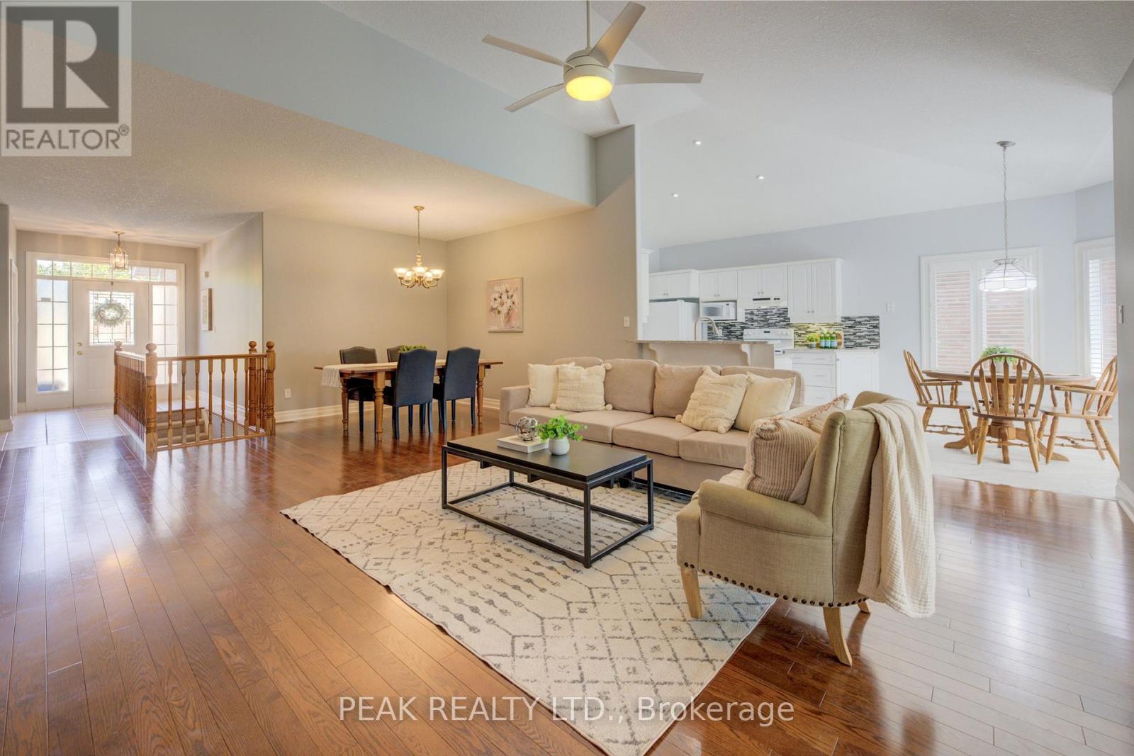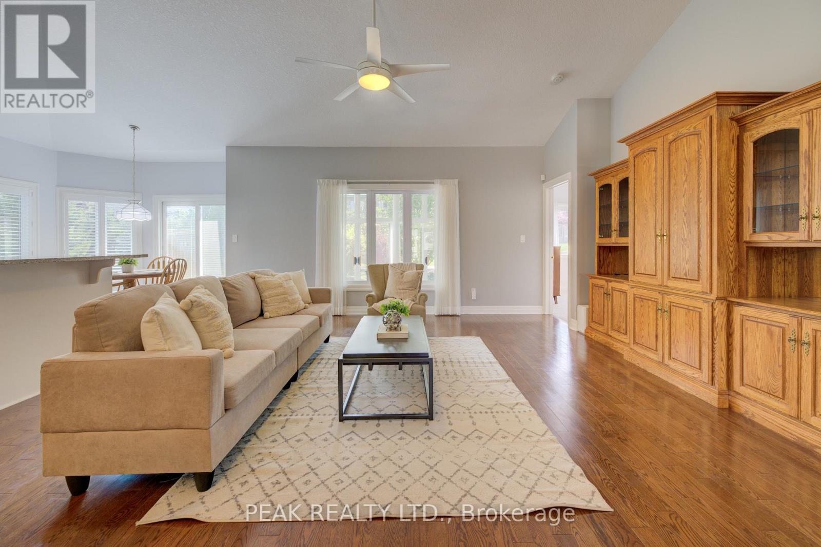 Welcome to 59 Devonshire Drive-now offered at an exceptional value of $914,900. This lovingly maintained Waterford Model features two bedrooms plus a den, 2.5 bathrooms, and over 2,700 sq. ft. of finished living space designed for comfort and ease. The open-concept main floor features hardwood flooring, a bright kitchen with stone countertops, new flooring, tile backsplash, peninsula seating, and California shutters. The spacious primary suite includes his-and-hers walk-in closets and an ensuite with double sinks and a low-barrier walk-in shower. A bright second bedroom, 4-piece bath, den with French doors, and main floor laundry with extra storage complete this level. Relax in the three-season sunroom overlooking lush greenery or entertain in the finished lower level with two large multipurpose rooms, a 2-piece bath, and abundant storage. Recent upgrades for peace of mind include roof, furnace, A/C, and attic insulation. Outside, enjoy an upgraded interlocking brick driveway, double garage, and serene surroundings. This is a rare opportunity to secure a move-in-ready home at an improved price-come experience the lifestyle Stonecroft is known for. Stonecroft's 18,000 sq. ft. rec center offers an indoor pool, fitness room, games/media rooms, library, party room, billiards, tennis courts, and 5 km of walking trails. (id:4555)
