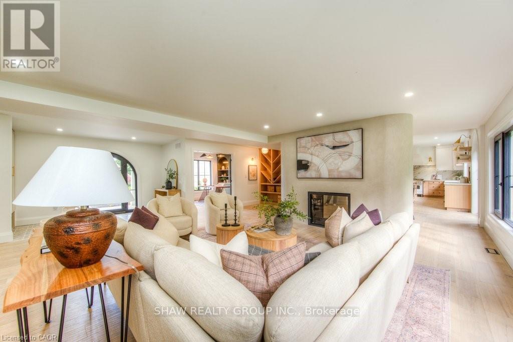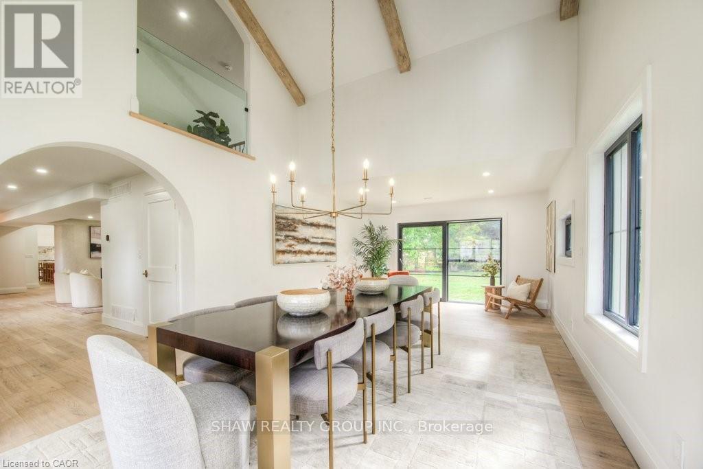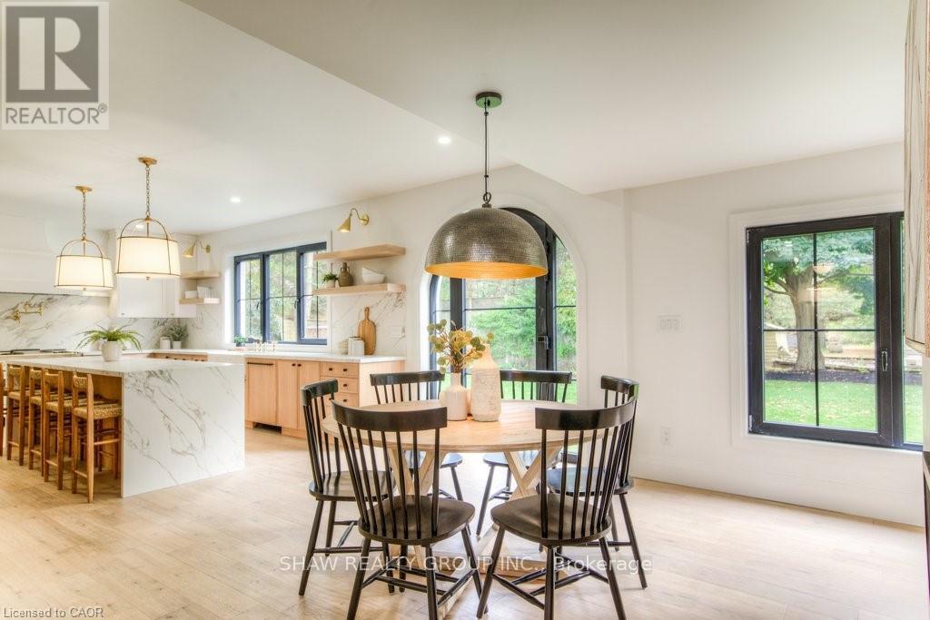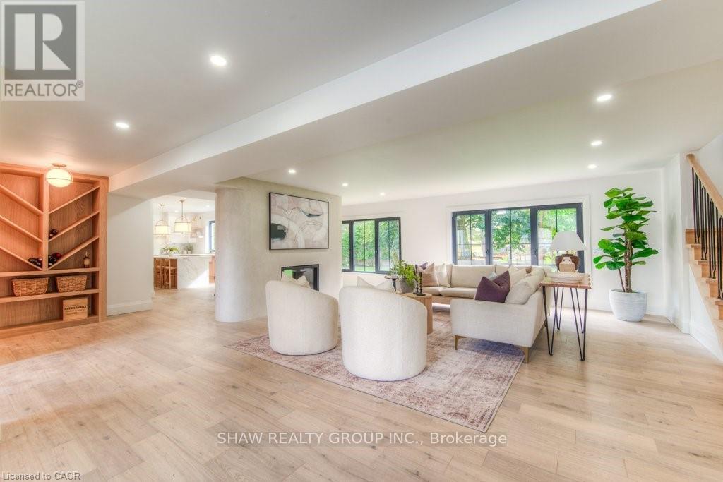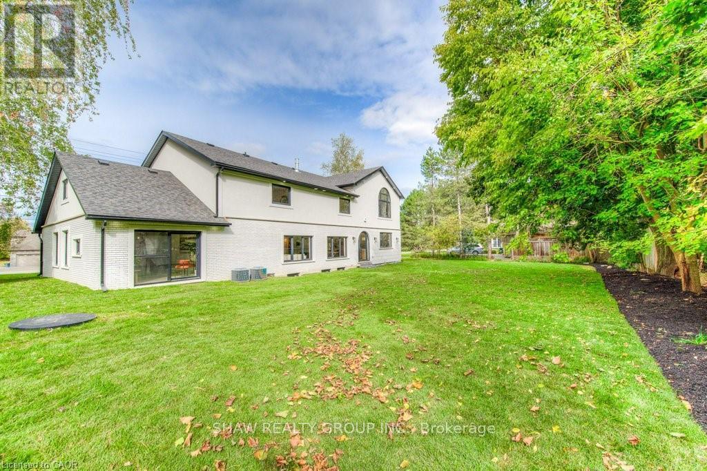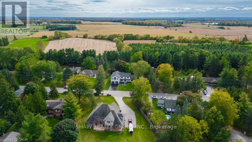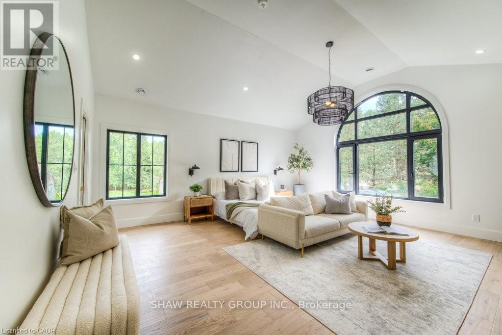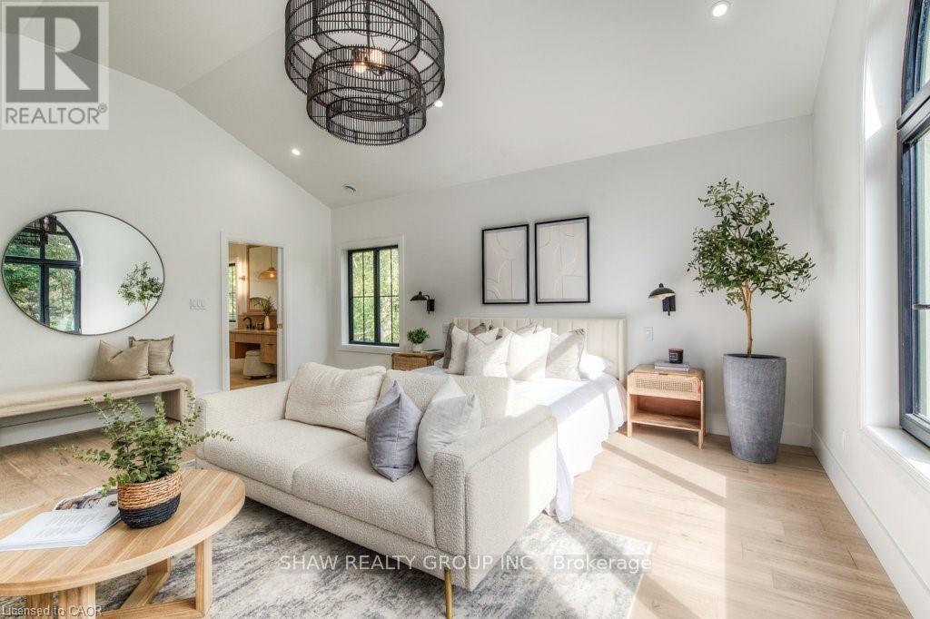Welcome to a newly constructed luxury estate with over 6,500 sq ft of professionally designed space on a rare 107 146 ft private lot, minutes from Kitchener-Waterloo. Built in 2023 and curated by Lush Designs, this architectural residence blends timeless European-inspired design with modern family functionality - delivering a level of craftsmanship and scale rarely available in the region. From the moment you enter, soaring ceilings, expansive sightlines, and oversized triple-glazed European windows create an atmosphere of light, openness, and luxury. The main level is designed for both elegant entertaining and everyday living, featuring a grand open-concept layout anchored by a striking double-sided Roman clay fireplace connecting the living and dining spaces. The chef's kitchen is a showpiece, complete with custom white oak cabinets, a 10-ft double waterfall porcelain island, paneled high-end appliances, walk-in prep pantry, and a designer range - seamlessly blending beauty with performance. Upstairs, the home offers a spacious and thoughtfully designed second level with five large bedrooms, each with ensuite access, a luxurious primary retreat featuring cathedral ceilings, fireplace, spa-like ensuite, and a generous walk-in closet. A bonus flex living area provides space for a family lounge, home gym, or office. The fully finished lower level adds over 1,600 sq ft of additional space, including a media zone, wet bar, guest area, and flexible recreation spaces - ideal for multi-generational living/entertaining. Set on a premium lot with a long private driveway, double garage, and room for outdoor amenities such as a pool or cabana, this property offers a combination of estate-style privacy with unmatched proximity to urban conveniences, minutes from Highway 7/8, shopping, universities, and Waterloo's tech hub. A truly exceptional offering for buyers seeking space, design excellence, and long-term value in one of the region's most desirable locations. (id:4555)
