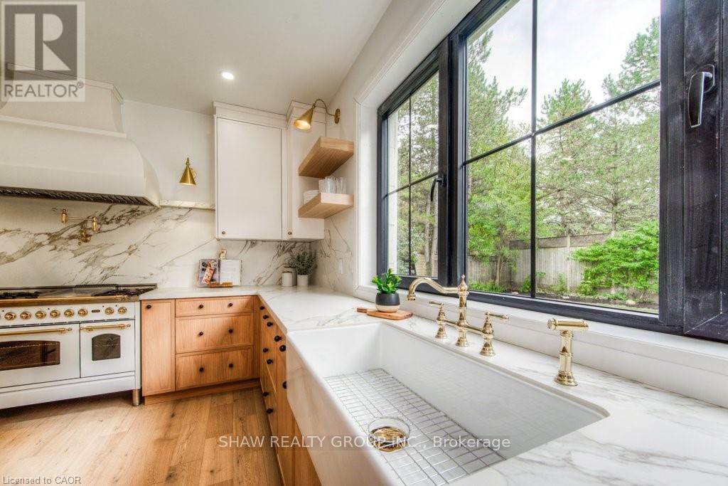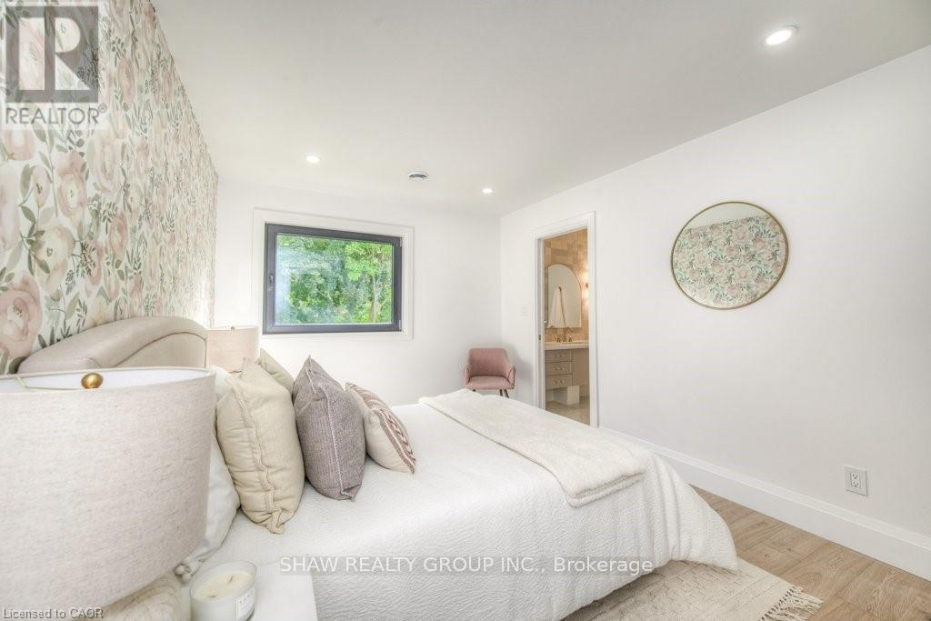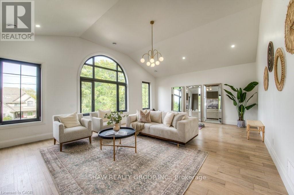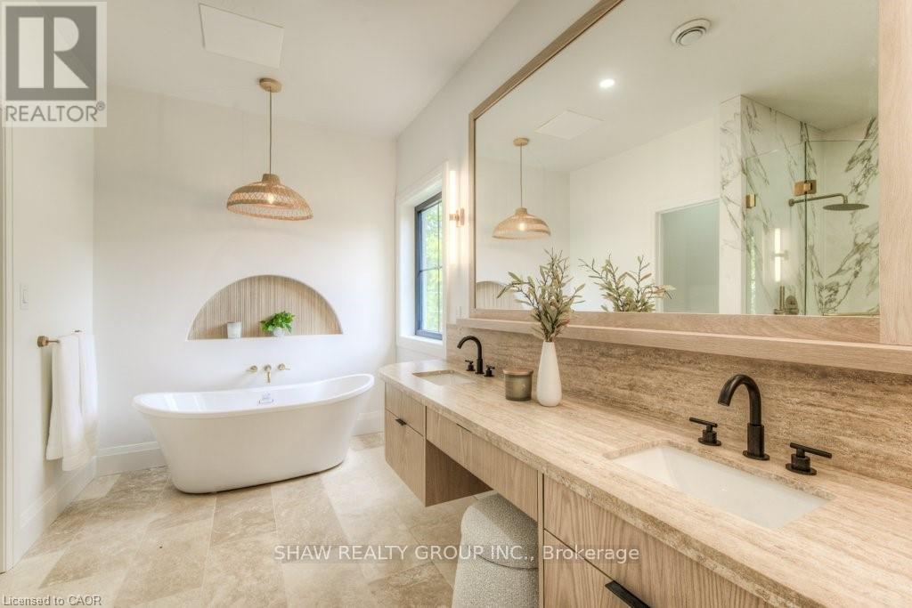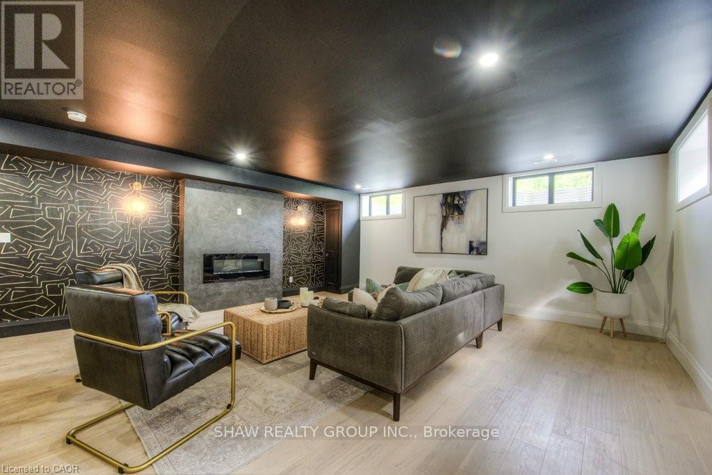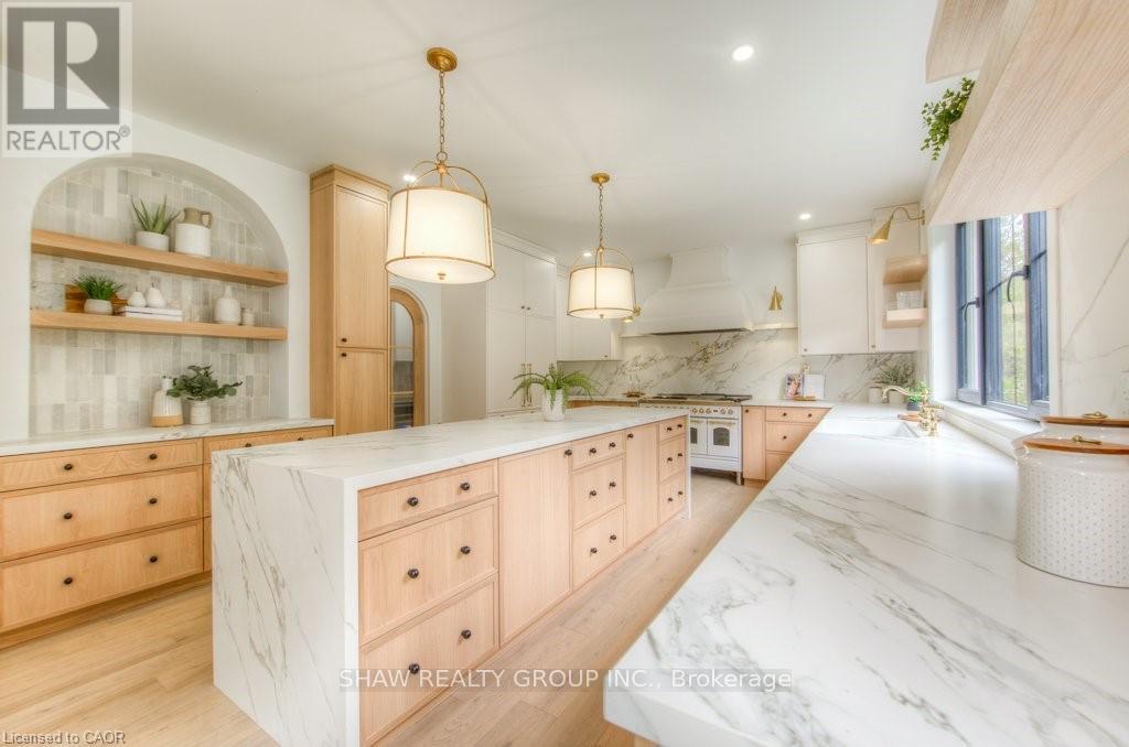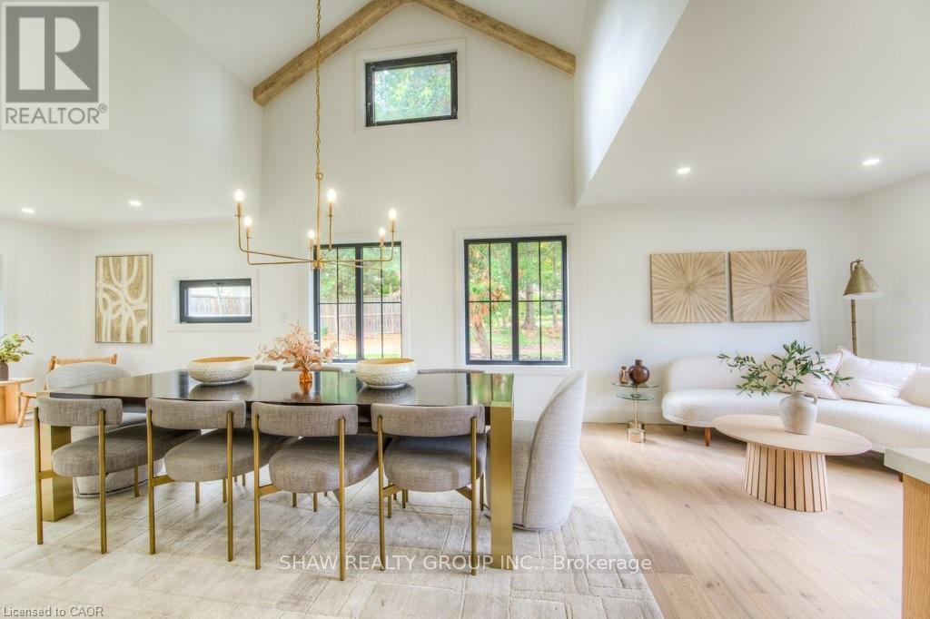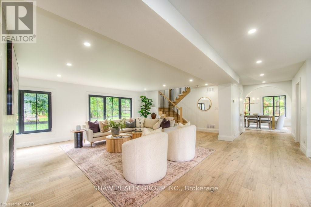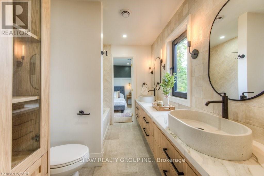 Welcome to a newly constructed luxury estate with over 6,500 sq ft of professionally designed space on a rare 107 146 ft private lot, minutes from Kitchener-Waterloo. Built in 2023 and curated by Lush Designs, this architectural residence blends timeless European-inspired design with modern family functionality - delivering a level of craftsmanship and scale rarely available in the region. From the moment you enter, soaring ceilings, expansive sightlines, and oversized triple-glazed European windows create an atmosphere of light, openness, and luxury. The main level is designed for both elegant entertaining and everyday living, featuring a grand open-concept layout anchored by a striking double-sided Roman clay fireplace connecting the living and dining spaces. The chef's kitchen is a showpiece, complete with custom white oak cabinets, a 10-ft double waterfall porcelain island, paneled high-end appliances, walk-in prep pantry, and a designer range - seamlessly blending beauty with performance. Upstairs, the home offers a spacious and thoughtfully designed second level with five large bedrooms, each with ensuite access, a luxurious primary retreat featuring cathedral ceilings, fireplace, spa-like ensuite, and a generous walk-in closet. A bonus flex living area provides space for a family lounge, home gym, or office. The fully finished lower level adds over 1,600 sq ft of additional space, including a media zone, wet bar, guest area, and flexible recreation spaces - ideal for multi-generational living/entertaining. Set on a premium lot with a long private driveway, double garage, and room for outdoor amenities such as a pool or cabana, this property offers a combination of estate-style privacy with unmatched proximity to urban conveniences, minutes from Highway 7/8, shopping, universities, and Waterloo's tech hub. A truly exceptional offering for buyers seeking space, design excellence, and long-term value in one of the region's most desirable locations. (id:4555)