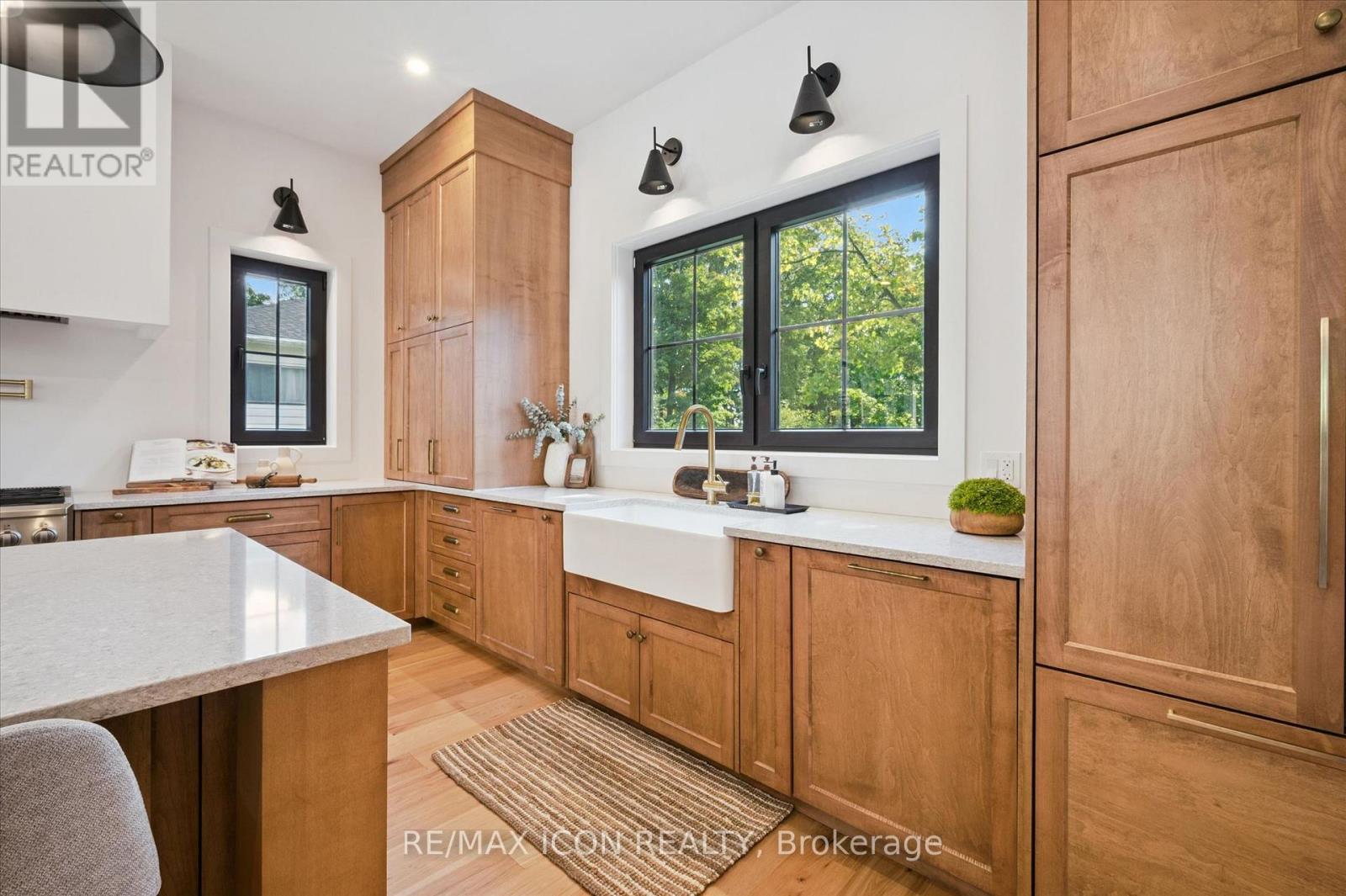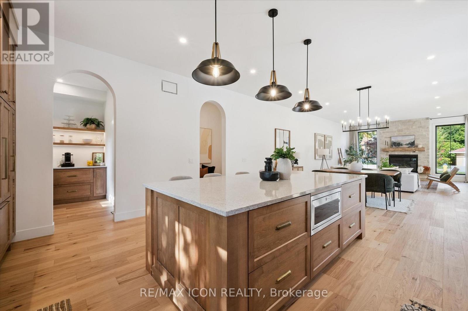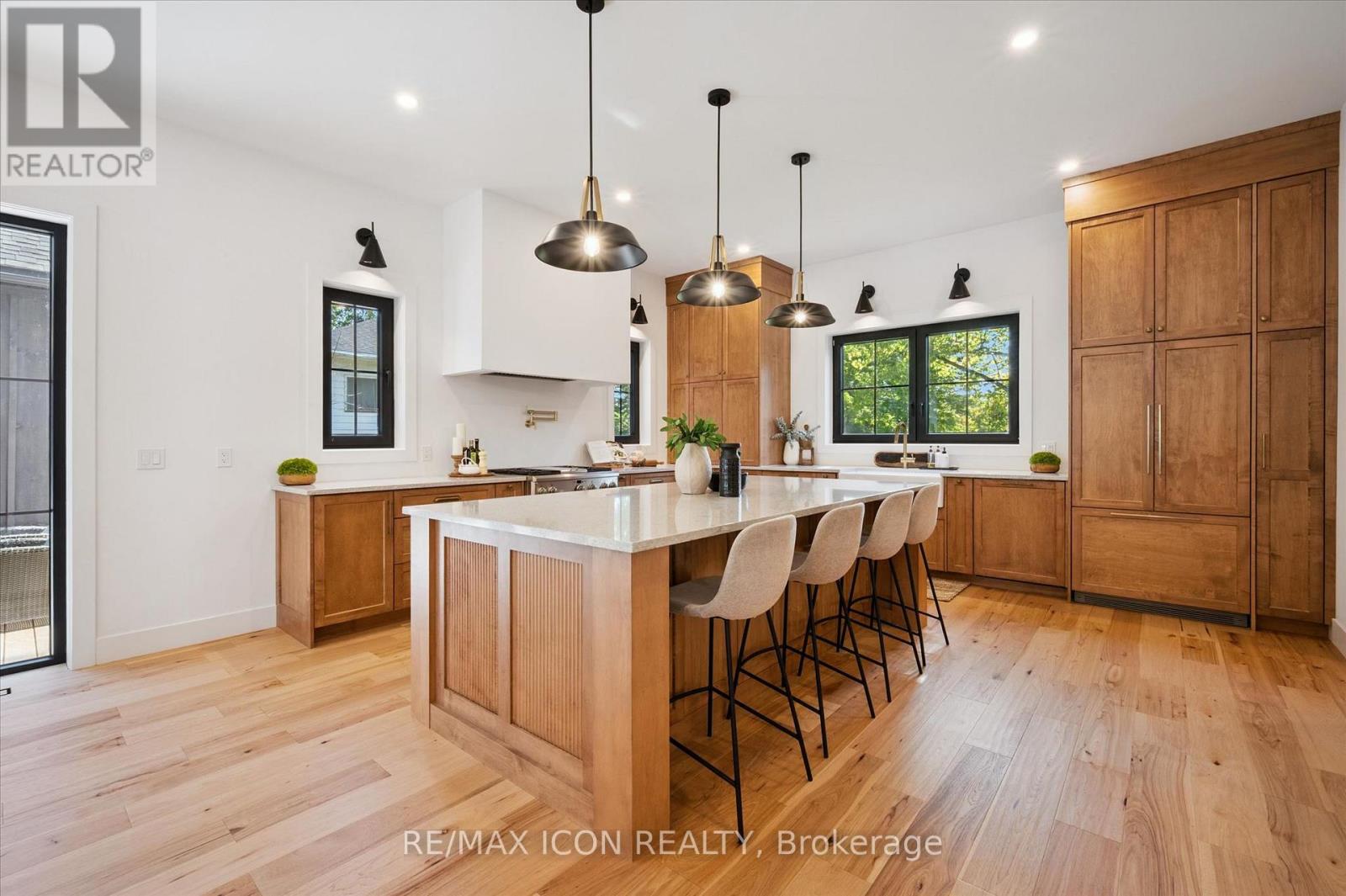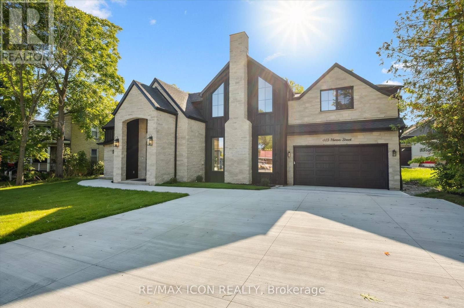 Welcome to 413 Huron Road in charming New Hamburg! A truly exceptional 5-bedroom, 4-bathroom home offering over 4,400 sq. ft. of finishedliving space, where thoughtful design meets high-end finishes and timeless craftsmanship. The exterior blends timeless materials like stone,brick, and barn board for a striking curb appeal, complemented by a concrete driveway with integrated drainage and underground downspoutmanagement. Inside, the home is flooded with natural light thanks to oversized Raven European tilt/turn windows, which beautifully highlight theneutral tones, organic finishes, and natural hickory engineered hardwood throughout. The heart of the home is the handcrafted maple kitchenand adjoining butler's pantry, featuring a Monogram gas oven/range, built-in 36" Fisher & Paykel fridge and dishwasher, an apron sink, andample storage, ideal for everyday living and entertaining alike. A separate entrance leads to a private granny flat, perfect for multi-generationalliving or guests. Comfort is maximized with multi-zone climate control, a hot water recirculation line for instant hot water to the second-floorbathrooms, and a large Lennox natural gas fireplace for cozy evenings. Additional features include a custom vanity in the foyer bath, VIGOfaucets, Red Oak stairs, and a master suite boasting oversized windows and Italian tile finishes. The home is equipped with a 200 AMP electricalpanel, water softener, and plenty of storage including a large shed. Outside, enjoy an incredible entertaining space with a wood deck and anexpansive grass area set on 3/4 acre in town perfect for relaxing or hosting gatherings. This is a rare blend of luxury, functionality, andthoughtful design in a peaceful, sought-after location. (id:4555)