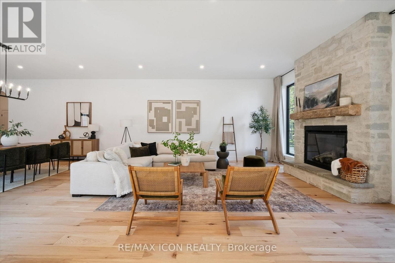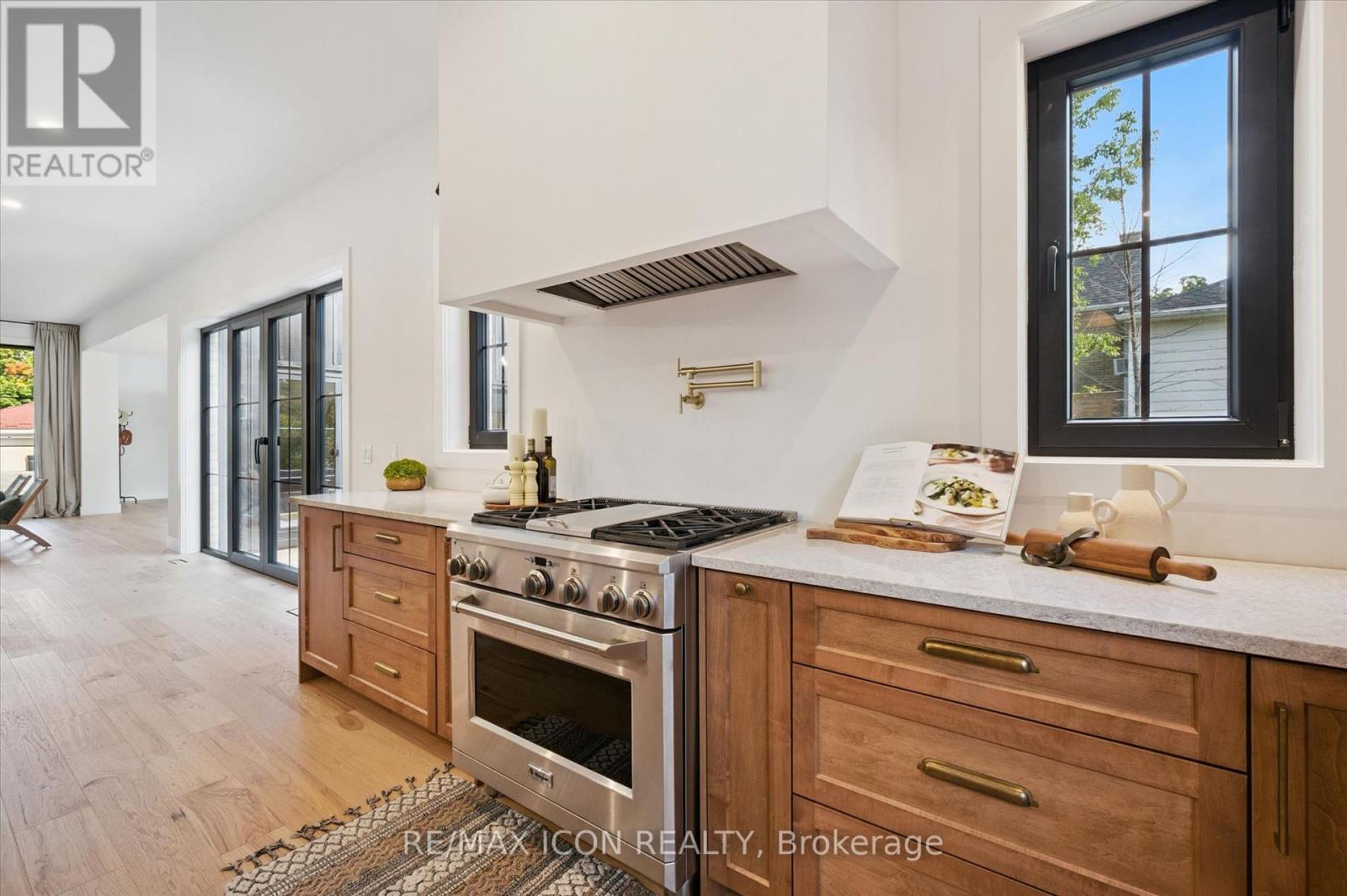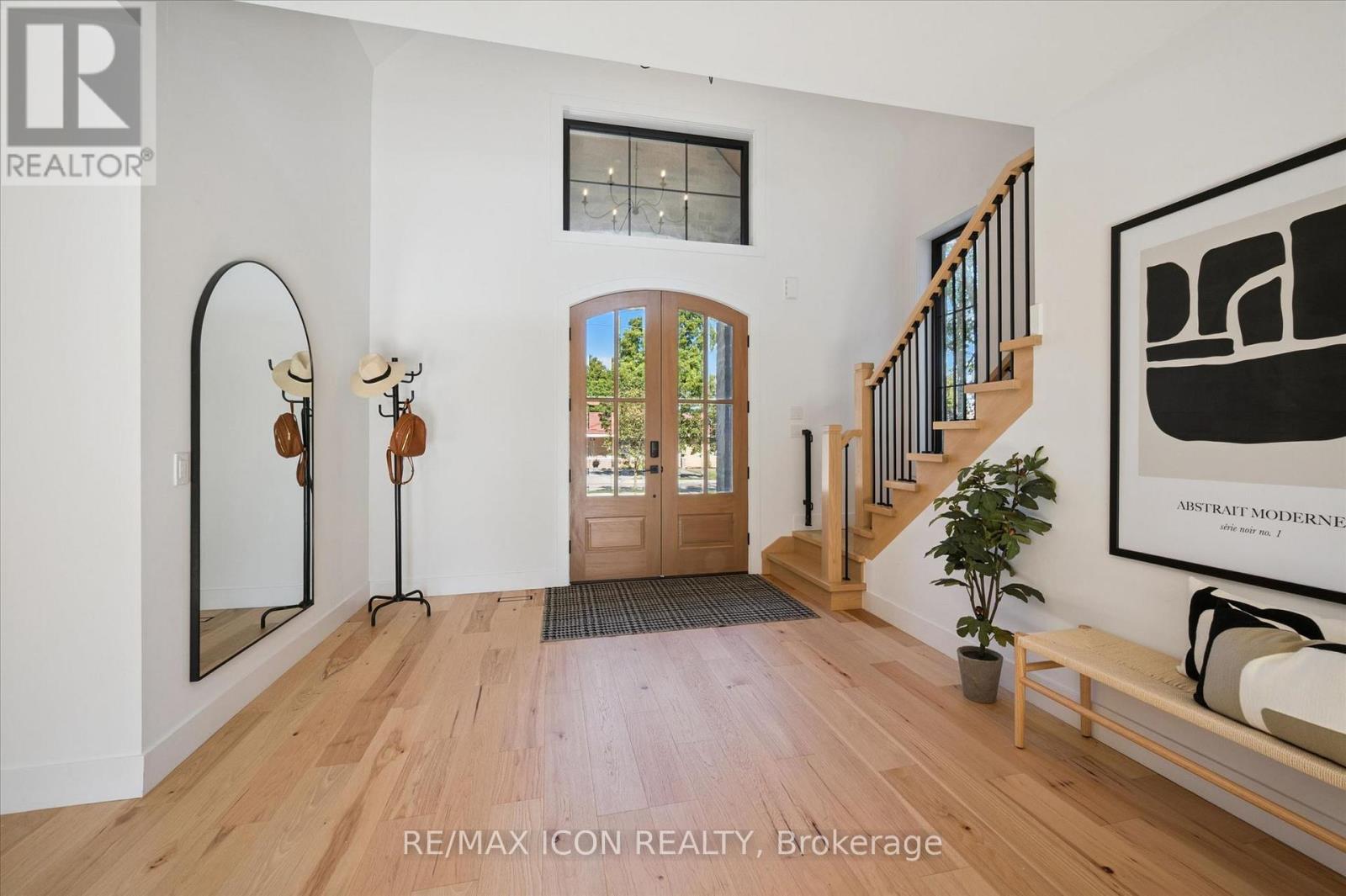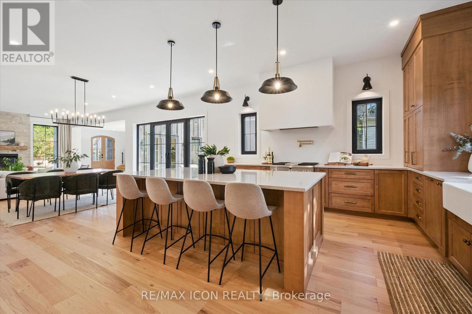 Welcome to 413 Huron Road in charming New Hamburg! A truly exceptional 5-bedroom, 4-bathroom home offering over 4,400 sq. ft. of finishedliving space, where thoughtful design meets high-end finishes and timeless craftsmanship. The exterior blends timeless materials like stone,brick, and barn board for a striking curb appeal, complemented by a concrete driveway with integrated drainage and underground downspoutmanagement. Inside, the home is flooded with natural light thanks to oversized Raven European tilt/turn windows, which beautifully highlight theneutral tones, organic finishes, and natural hickory engineered hardwood throughout. The heart of the home is the handcrafted maple kitchenand adjoining butler's pantry, featuring a Monogram gas oven/range, built-in 36" Fisher & Paykel fridge and dishwasher, an apron sink, andample storage, ideal for everyday living and entertaining alike. A separate entrance leads to a private granny flat, perfect for multi-generationalliving or guests. Comfort is maximized with multi-zone climate control, a hot water recirculation line for instant hot water to the second-floorbathrooms, and a large Lennox natural gas fireplace for cozy evenings. Additional features include a custom vanity in the foyer bath, VIGOfaucets, Red Oak stairs, and a master suite boasting oversized windows and Italian tile finishes. The home is equipped with a 200 AMP electricalpanel, water softener, and plenty of storage including a large shed. Outside, enjoy an incredible entertaining space with a wood deck and anexpansive grass area set on 3/4 acre in town perfect for relaxing or hosting gatherings. This is a rare blend of luxury, functionality, andthoughtful design in a peaceful, sought-after location. (id:4555)