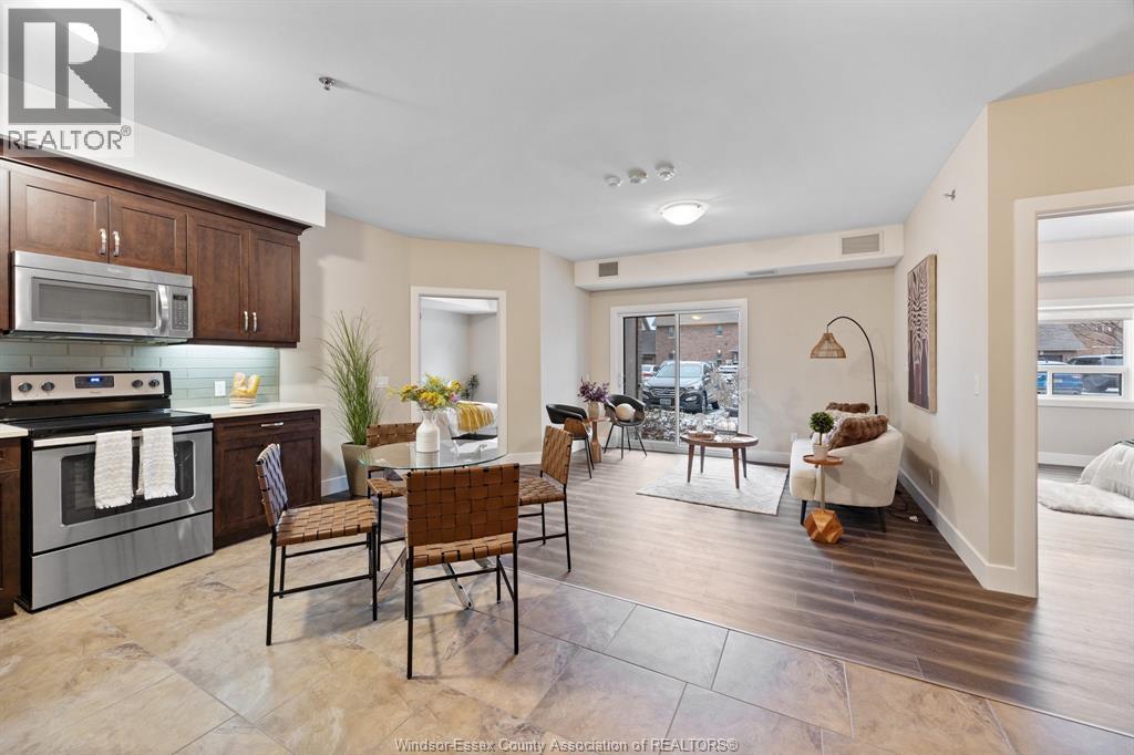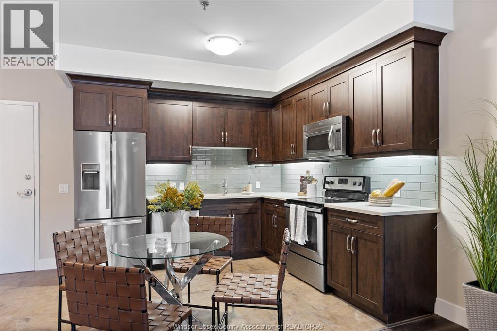 Welcome to Rivertown Terrace, a signature Valente Development Corporation community in the heart of East Windsor/Riverside. This inviting 2-bed, 2-bath condo blends comfort, style, and convenience with a bright open-concept layout, 9ft ceilings, and a spacious private balcony. The gourmet kitchen features stainless steel appliances, recessed shaker-style cabinetry, and a large breakfast peninsula perfect for everyday dining. The primary suite offers a generous closet and direct access to a well-appointed bathroom. Additional highlights include in-suite laundry, a roomy utility area with extra storage, and thoughtful upgrades throughout. Just steps from parks, restaurants, shops, and the waterfront-enjoy modern, low-maintenance living at its finest. (id:4555)