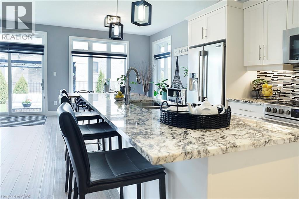 Premium quality energy-efficient stone and brick expansive ranch bungalow 1829 sq. ft. built by Goodman Homes in 2018, with upgraded features throughout. Stunning entrance stone work, large double garage and stamped concrete driveway. Open airy interior feel with elevated ceilings and many surrounding windows in the living room. Walkout to landscaped private corner lot with iron fencing. Beautiful seating area on a stone patio with pergola covering and privacy evergreen trees. Lawn remote underground sprinkler system (lush grass result). Impressive kitchen with stone countertops, oversized island, newer appliances (gas stove and vent hood), spacious separate walk-in pantry and coffee bar section. Lovely dining space and massive living area with gas stone fireplace. Custom window blinds throughout. Wide plank engineered flooring on the main (no carpeting). The ample main floor laundry room is separate from a handy mudroom off the garage. So many storage spaces in the home. Oversized primary bedroom with walk-in closet and lovely double sink ensuite with shower and soaker tub. Second main double sized bedroom with huge window as well. Handy second full bath with dual bath/shower capacity. HVAC air filtration system, wireless garage door remote, Ring doorbell security. The undeveloped basement with bath rough-in is the size of the upper floor. Easily add two to three bedrooms (or games area and family room - currently a workout area, recreation room and storage. The subdivision is flanked with the agricultural land owned by Guelph University. This adds a natural calm feel to this area, close to amenities and trails but separate from the hustle bustle of traffic. You may not have viewed homes in this location before so you must be ready for loving this Euro feel home in a prime location. (id:4555)