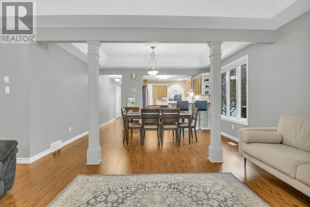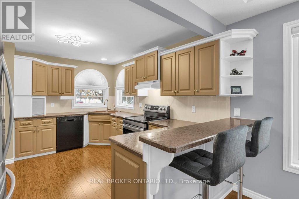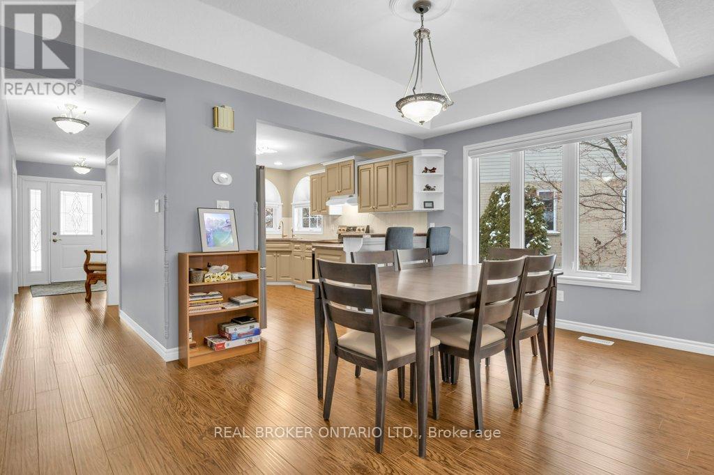 A stunning residence nestled in the highly sought-after, quiet community of South Parkwood Estates in Elmira. This 4-bedroom, 2.5-bathroom home offers the perfect blend of small-town tranquility and modern convenience, with easy access to the charming village of St. Jacobs and the bustling Kitchener-Waterloo area. As you step inside, you are greeted by a sizable foyer that sets an inviting tone. The main level features a desirable open-concept layout, anchored by a warm gas fireplace-the perfect focal point for hosting guests or enjoying quiet evenings. The spacious kitchen is a chef's delight, boasting ample counter and cabinet space. For ultimate accessibility, the primary bedroom is located on the main floor, featuring a large walk-in closet, alongside a dedicated main floor laundry room. The fully finished basement expands your living space significantly. Here, you will find three additional sizeable bedrooms, ideal for a growing family or a home office. The cozy rec room, complete with a woodstove, provides a rustic retreat for chilly Ontario winters. A standout feature is the walk-up access from the basement directly to the oversized 2-car garage, offering incredible functionality and potential for a secondary entrance. Step outside into a backyard that is truly a rare find. Professionally landscaped gardens surround a peaceful waterfall feature, creating a serene atmosphere. Backing onto a lush woodlot with no rear neighbors, you can enjoy ultimate privacy on the large deck or under the gazebo. The exterior is completed by a resurfaced driveway with plenty of parking for family and friends. Experience the best of Elmira living in this beautifully maintained and thoughtfully designed property. (id:4555)