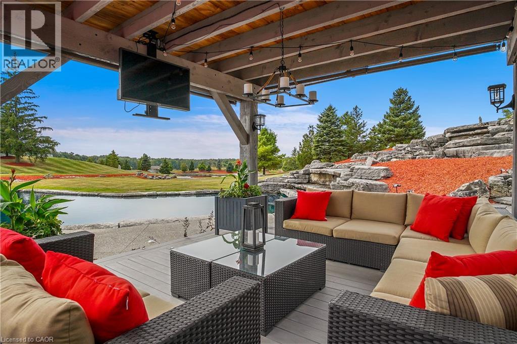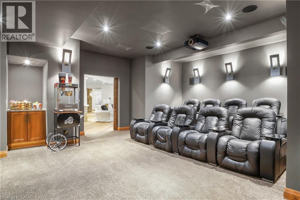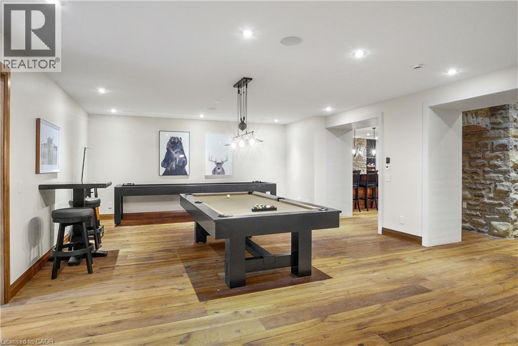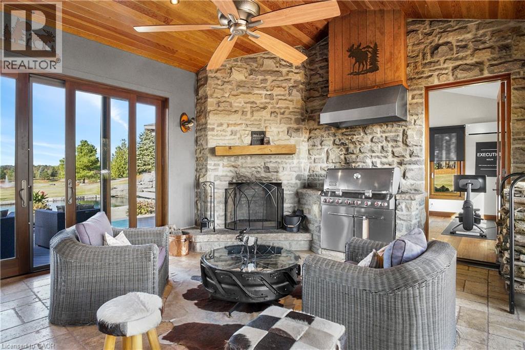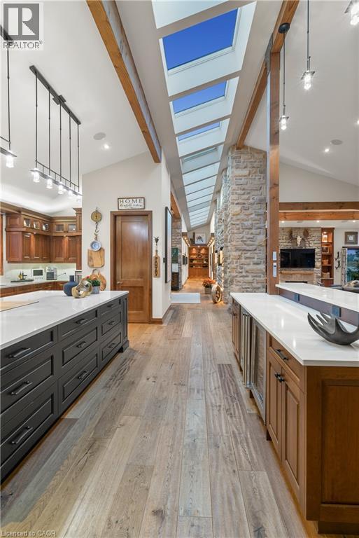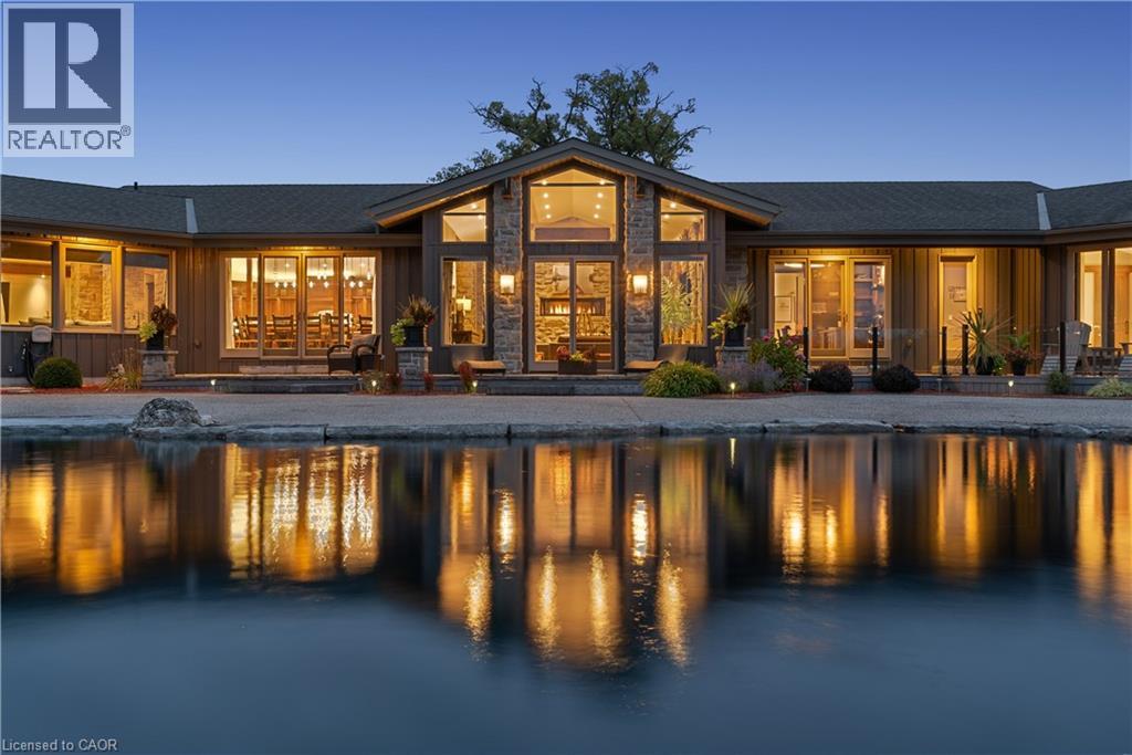 Set on over 120 acres of stunning countryside, this exceptional estate offers a rare combination of privacy, recreation, and luxury living, just minutes from Cambridge, Guelph, and Kitchener-Waterloo. The property is designed for year-round enjoyment, featuring two incredible ponds — one a swim pond perfect for cooling off on warm summer days, and the other a stocked fishing pond with a sandy beach and waterfall, creating a truly resort-like setting at home. Scenic trails wind throughout the property, offering endless opportunities to explore, relax, and enjoy the peaceful natural surroundings. The property also includes a heated 4,000 sq. ft. detached building with in-floor heating, offering incredible versatility for a workshop, car collection, equipment storage, hobby space, or recreational use. The custom-built stone bungalow offers an impressive 10,454 sq. ft. of finished living space, including 6,505 sq. ft. on the main floor and a fully finished 3,949 sq. ft. lower level. Inside, soaring ceilings, skylights, and hand-chipped stone accents create a warm and inviting atmosphere, while natural wood details add character throughout. At the heart of the home is a spectacular gourmet kitchen featuring Viking Professional appliances, Silestone quartz countertops, striking Douglas fir beams, and dual islands designed for gathering and entertaining. The spacious dining area seats 14 and overlooks the picturesque ponds and surrounding landscape. An indoor grilling area with heated floors makes entertaining effortless in every season. The primary suite is a private retreat with direct access to the swim pond and a spa-like ensuite complete with a jacuzzi tub beside a cozy gas fireplace. The fully finished lower level is designed for relaxation and entertaining, offering a spacious recreation area, full bar, billiards space, wine cellar, and a private cinema room. A truly one-of-a-kind property where luxury living meets the beauty of nature. (id:4555)