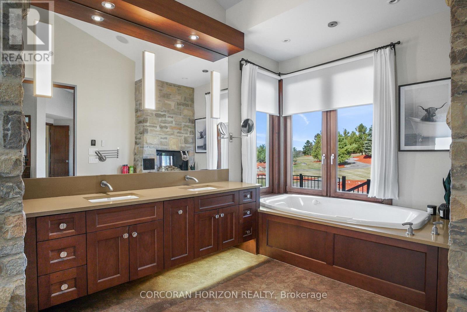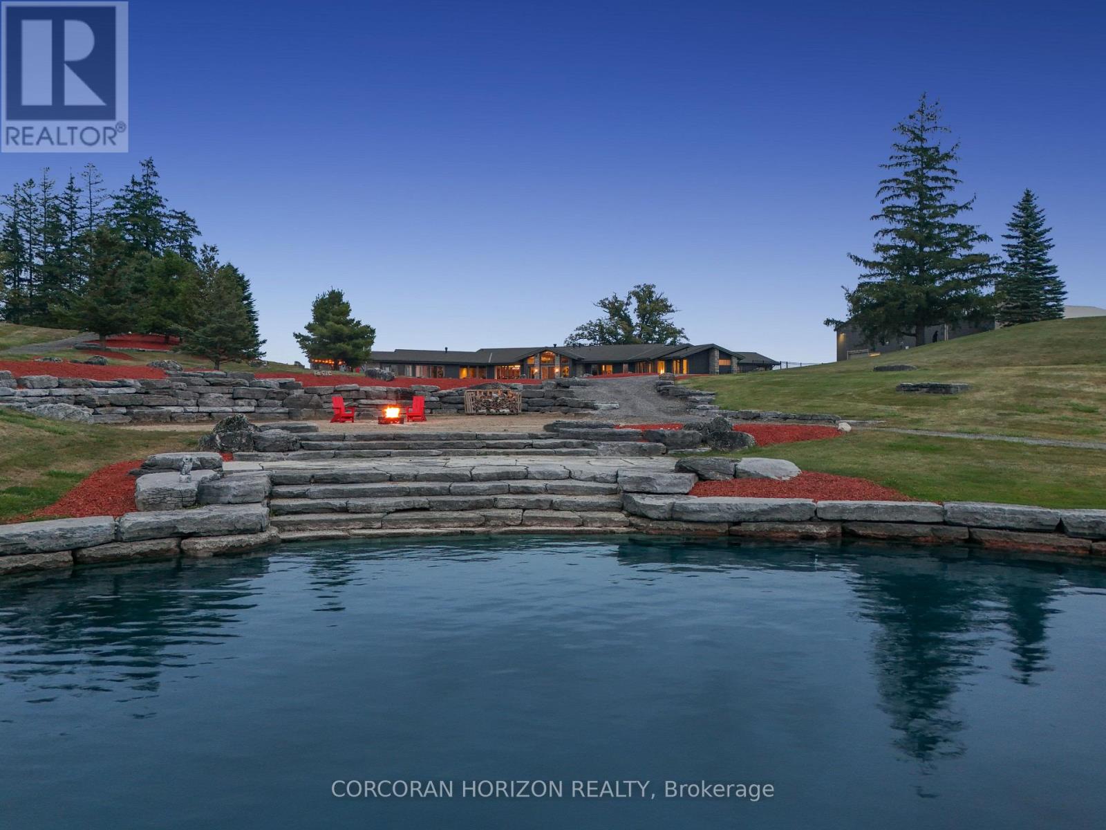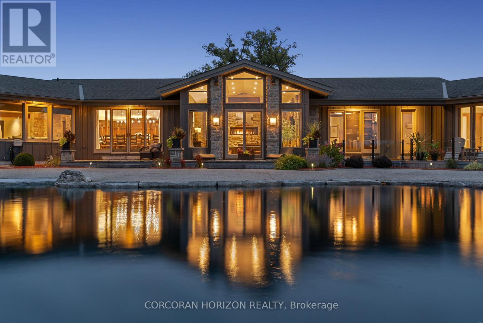 Set on over 120 acres of stunning countryside, this exceptional estate offers a rare combination of privacy, recreation, and luxury living, just minutes from Cambridge, Guelph, and Kitchener-Waterloo. The property is designed for year-round enjoyment, featuring two incredible ponds -one a swim pond perfect for cooling off on warm summer days, and the other a stocked fishing pond with a sandy beach and waterfall, creating a truly resort-like setting at home. Scenic trails wind throughout the property, offering endless opportunities to explore, relax, and enjoy the peaceful natural surroundings. The property also includes a heated 4,000 sq. ft. detached building with in-floor heating, offering incredible versatility for a workshop, car collection, equipment storage, hobby space, or recreational use. The custom-built stone bungalow offers an impressive 10,454 sq. ft. of finished living space, including 6,505 sq. ft. on the main floor and a fully finished 3,949 sq. ft. lower level. Inside, soaring ceilings, skylights, and hand-chipped stone accents create a warm and inviting atmosphere, while natural wood details add character throughout. At the heart of the home is a spectacular gourmet kitchen featuring Viking Professional appliances, Silestone quartz countertops, striking Douglas fir beams, and dual islands designed for gathering and entertaining. The spacious dining area seats 14 and overlooks the picturesque ponds and surrounding landscape. An indoor grilling area with heated floors makes entertaining effortless in every season. The primary suite is a private retreat with direct access to the swim pond and a spa-like ensuite complete with a jacuzzi tub beside a cozy gas fireplace. The fully finished lower level is designed for relaxation and entertaining, offering a spacious recreation area, full bar, billiards space, wine cellar, and a private cinema room. A truly one-of-a-kind property where luxury living meets the beauty of nature. (id:4555)